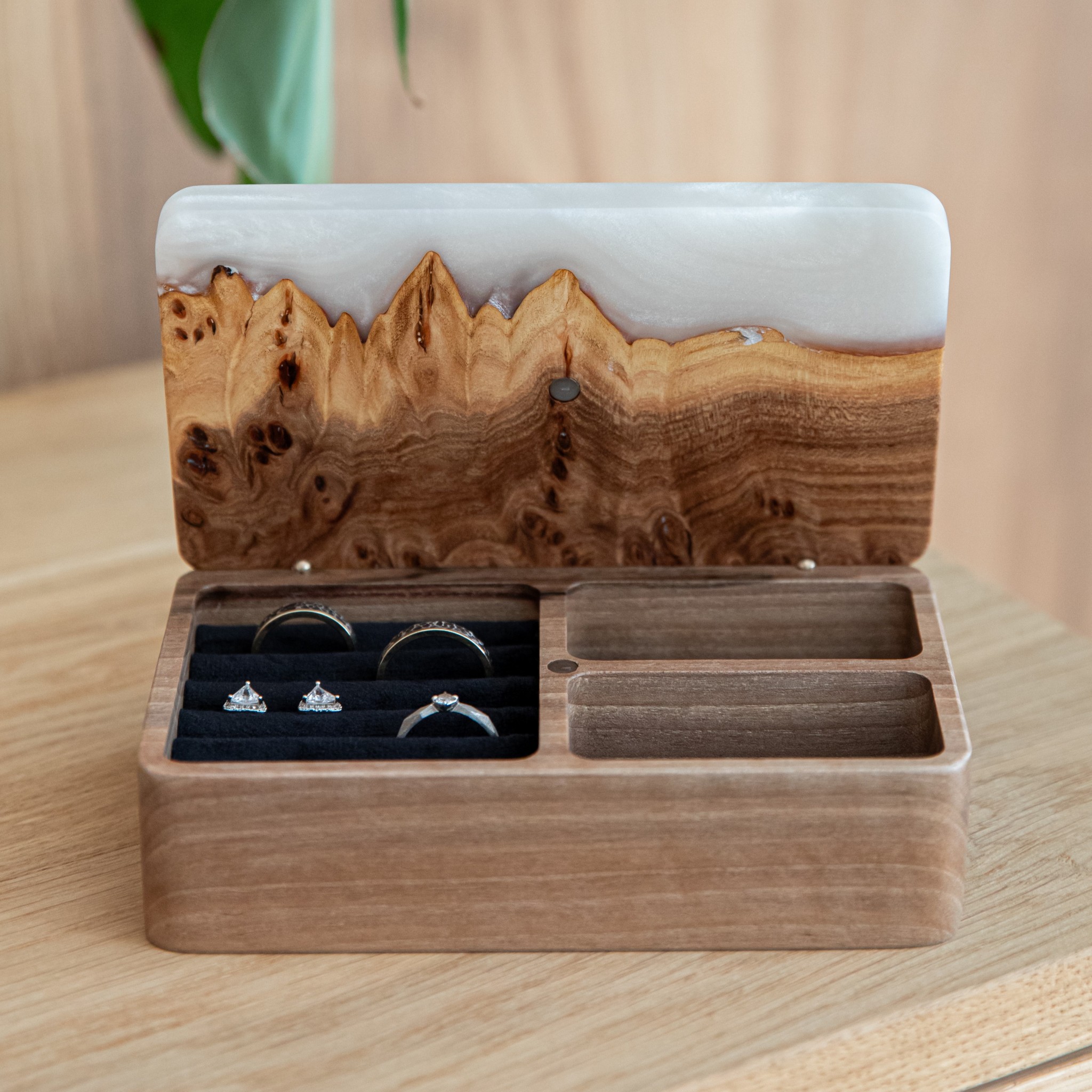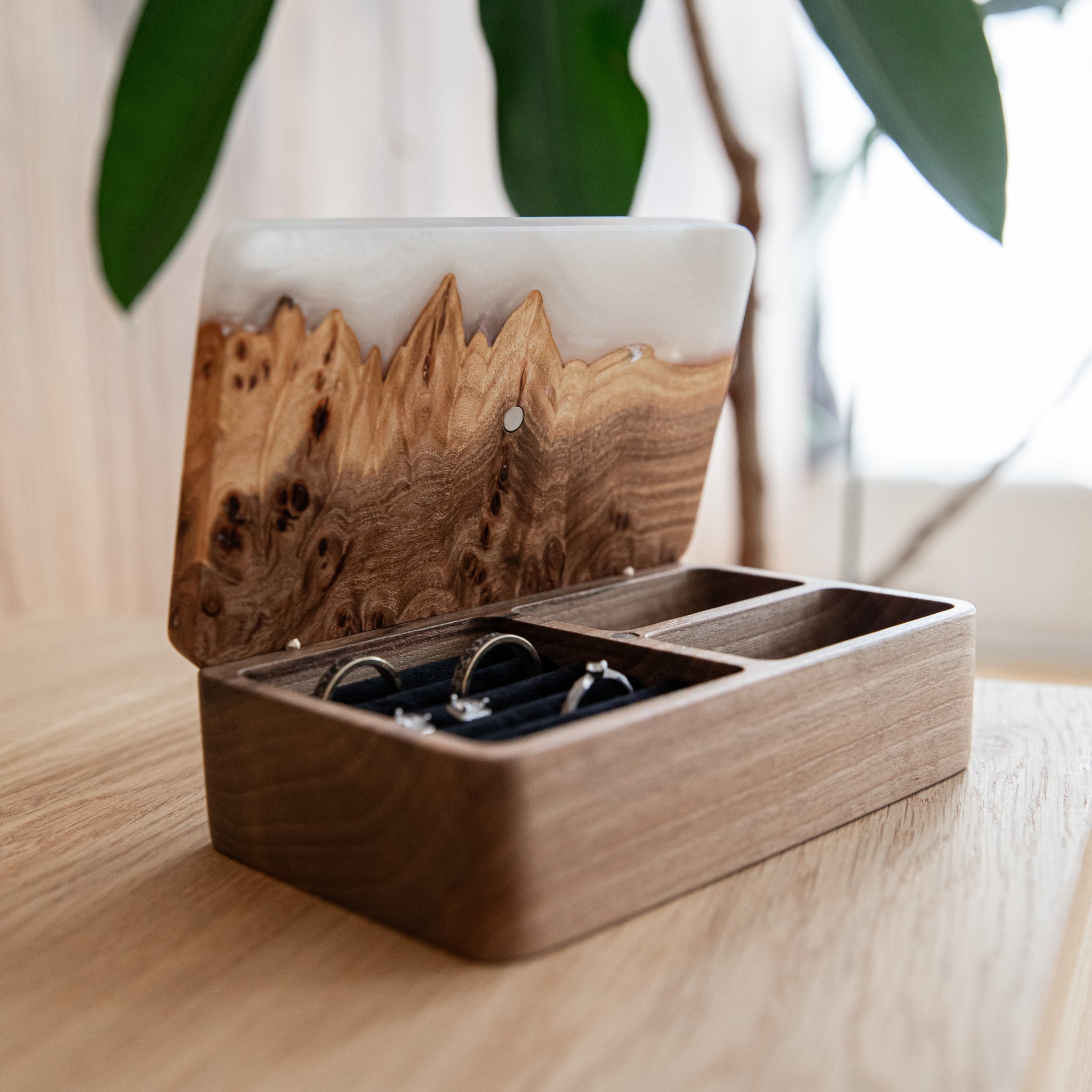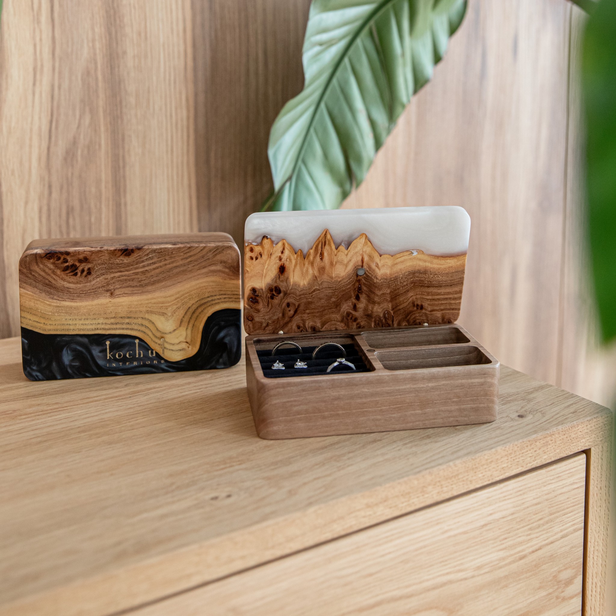 Ornament. Platinum — handcrafted jewelry box made of walnut, elm, epoxy resin, polyurethane