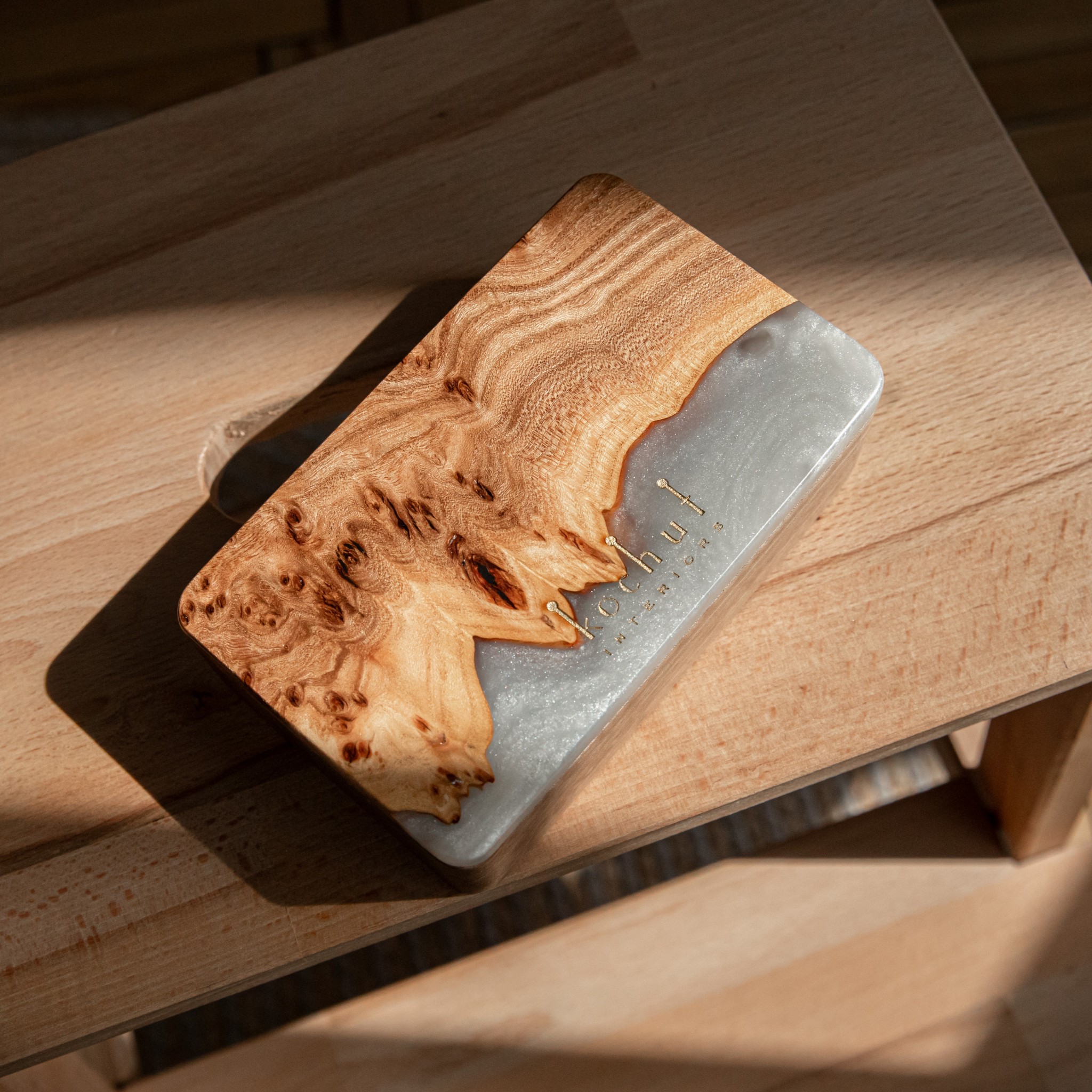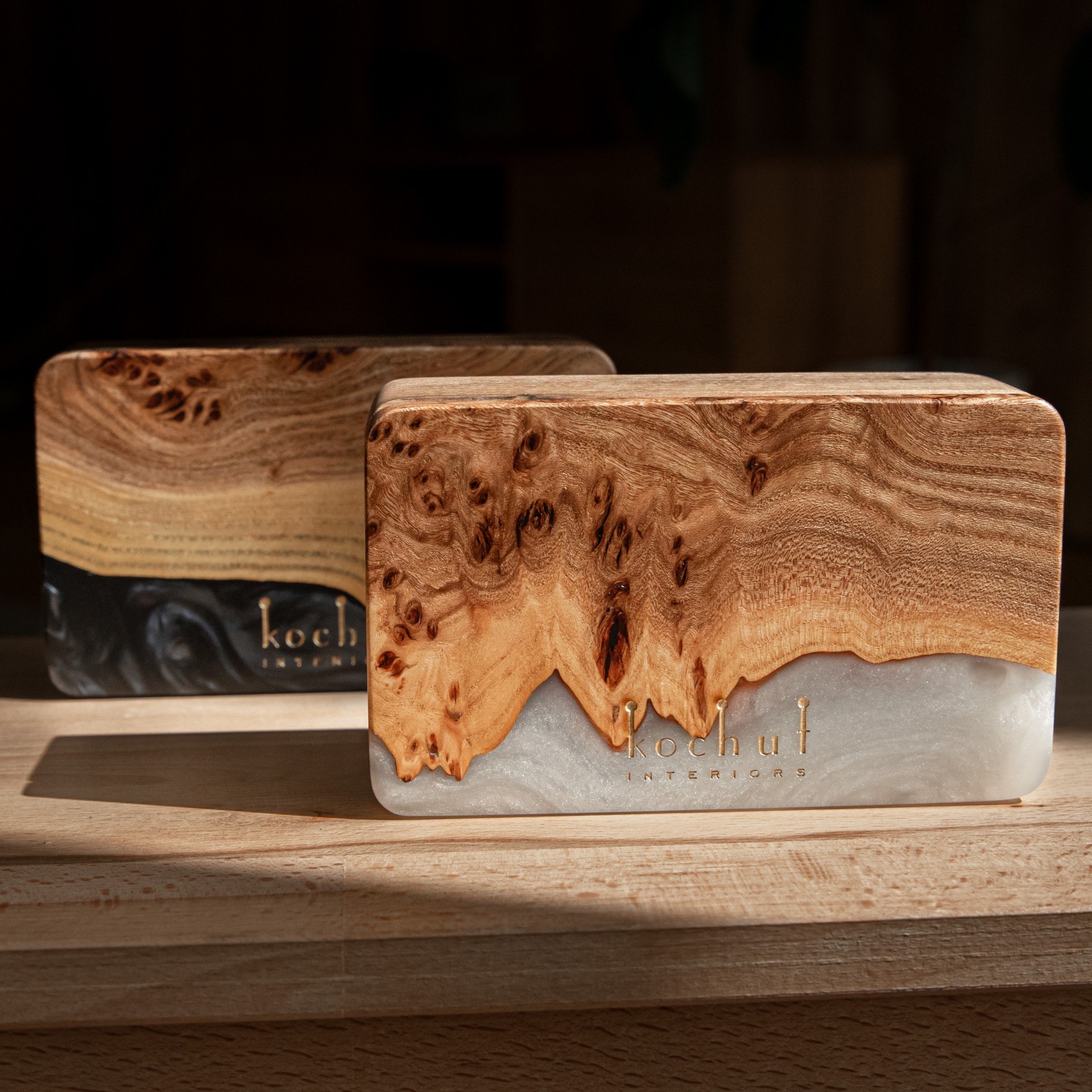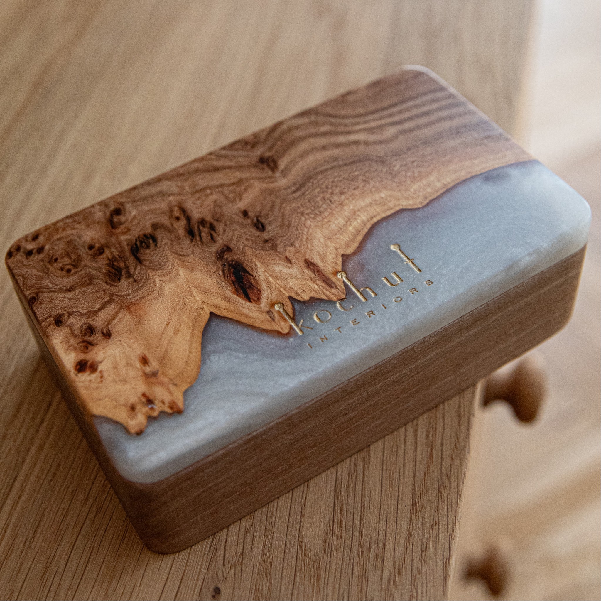 Ornament. Platinum — handcrafted jewelry box made of walnut, elm, epoxy resin, polyurethane