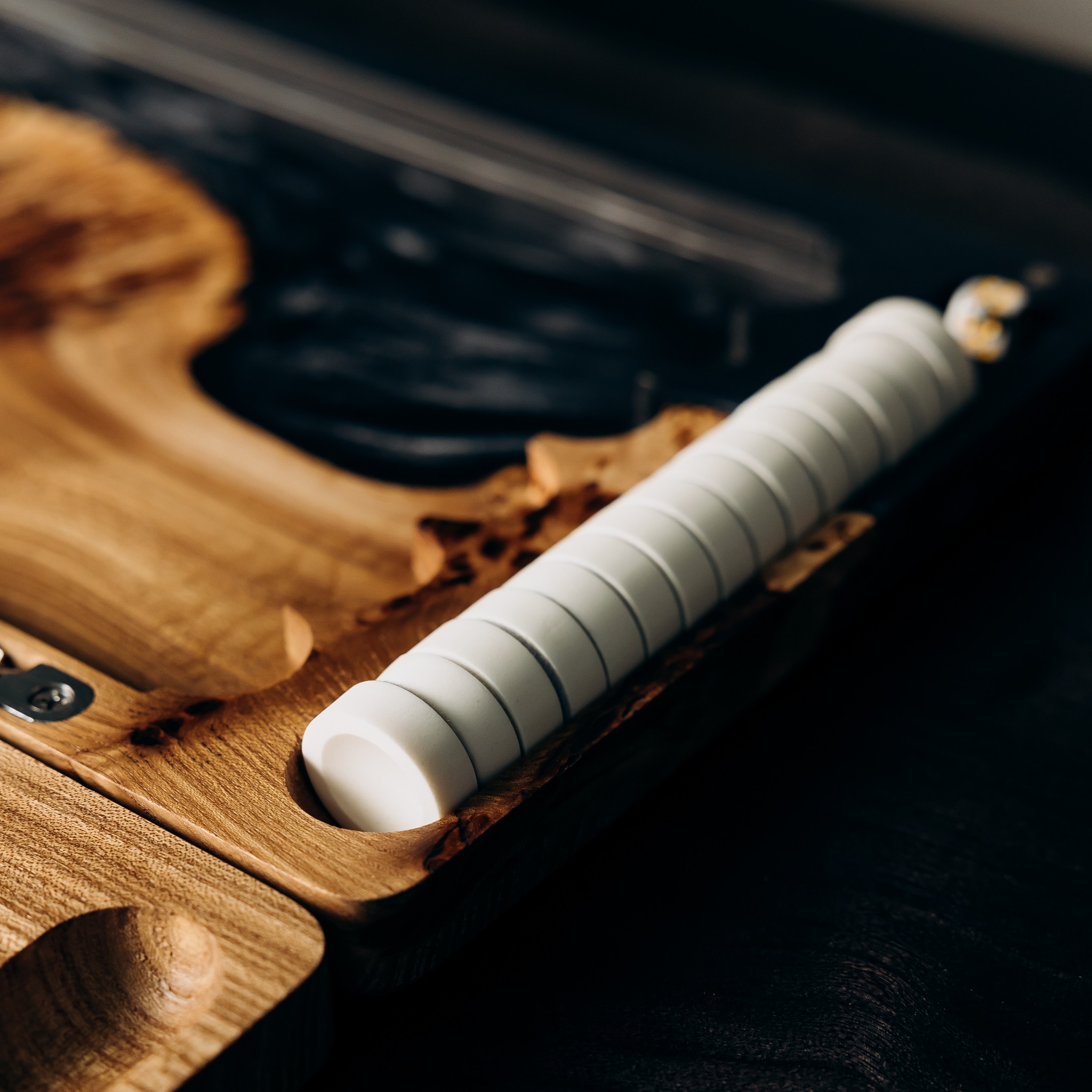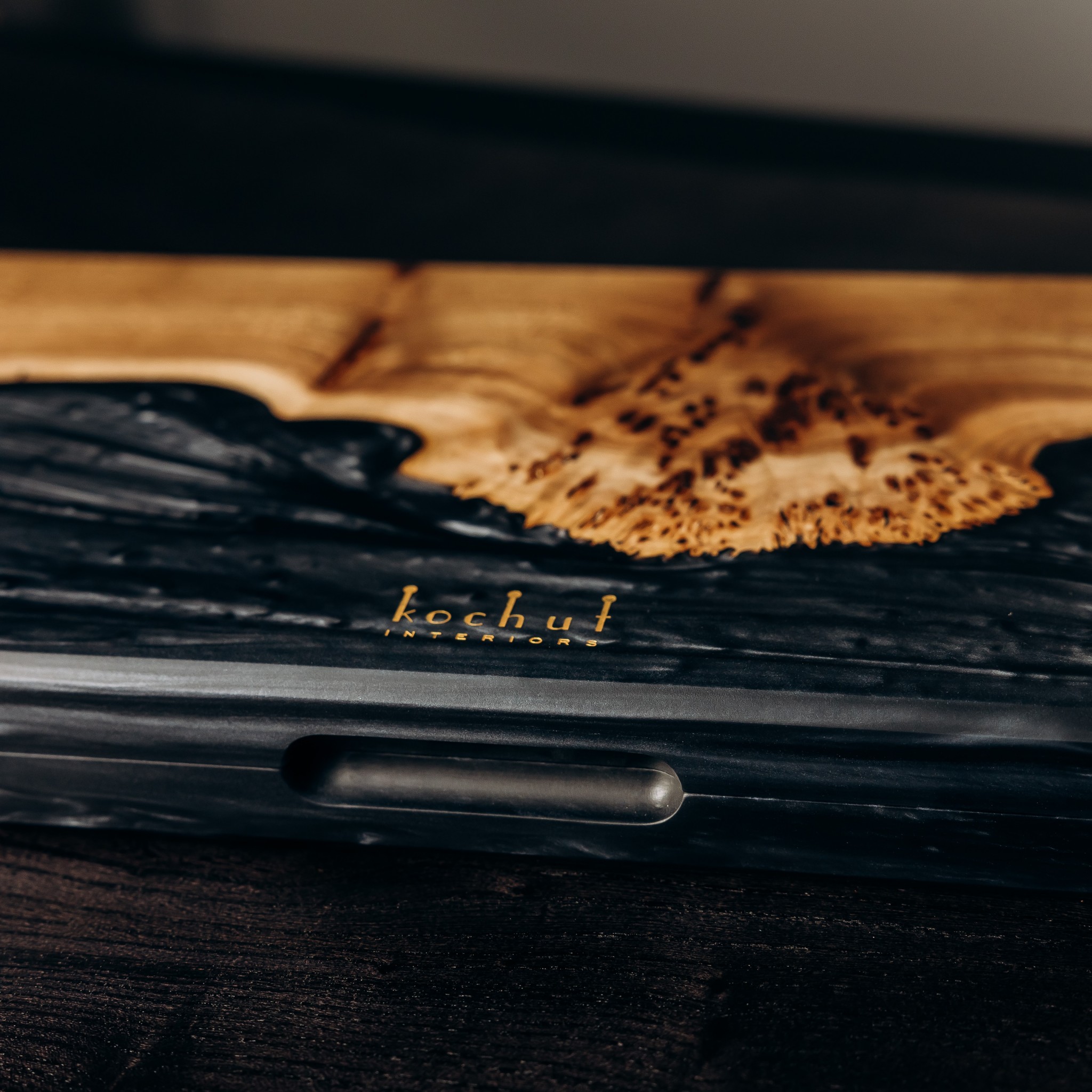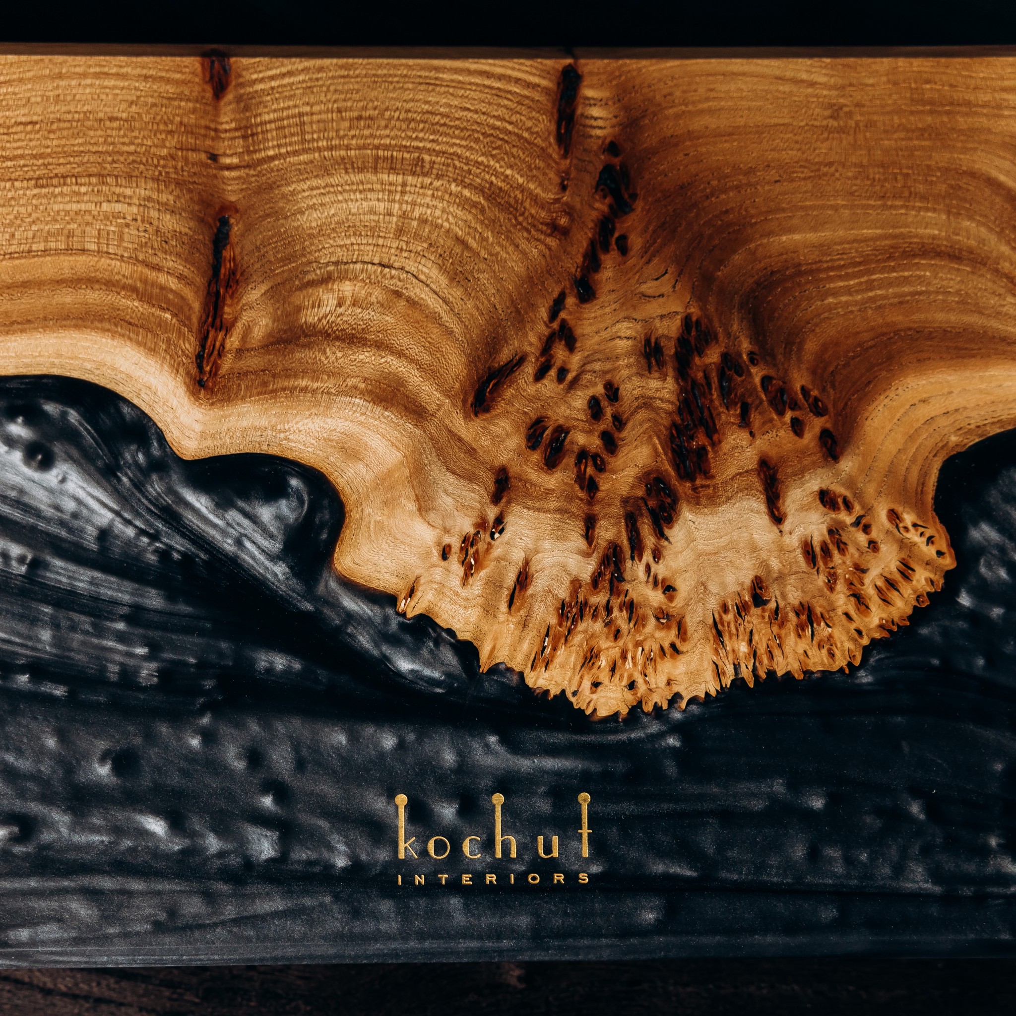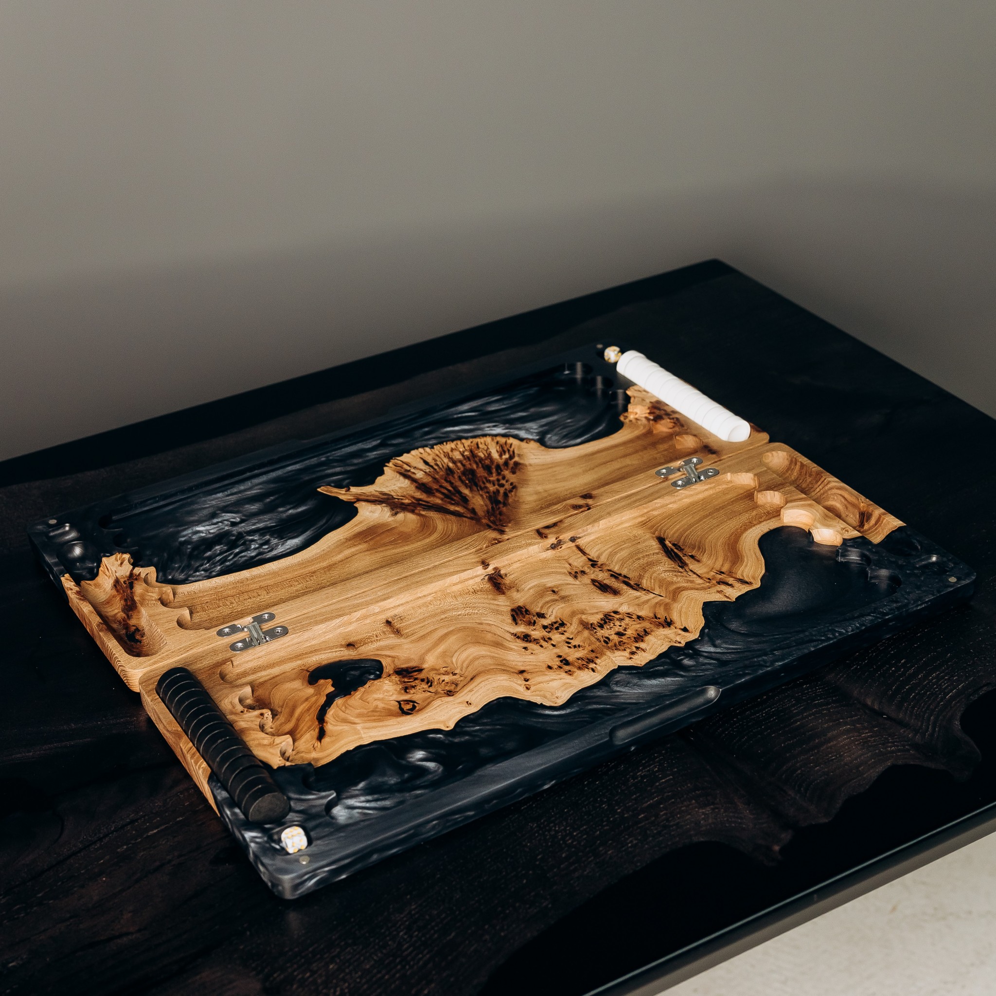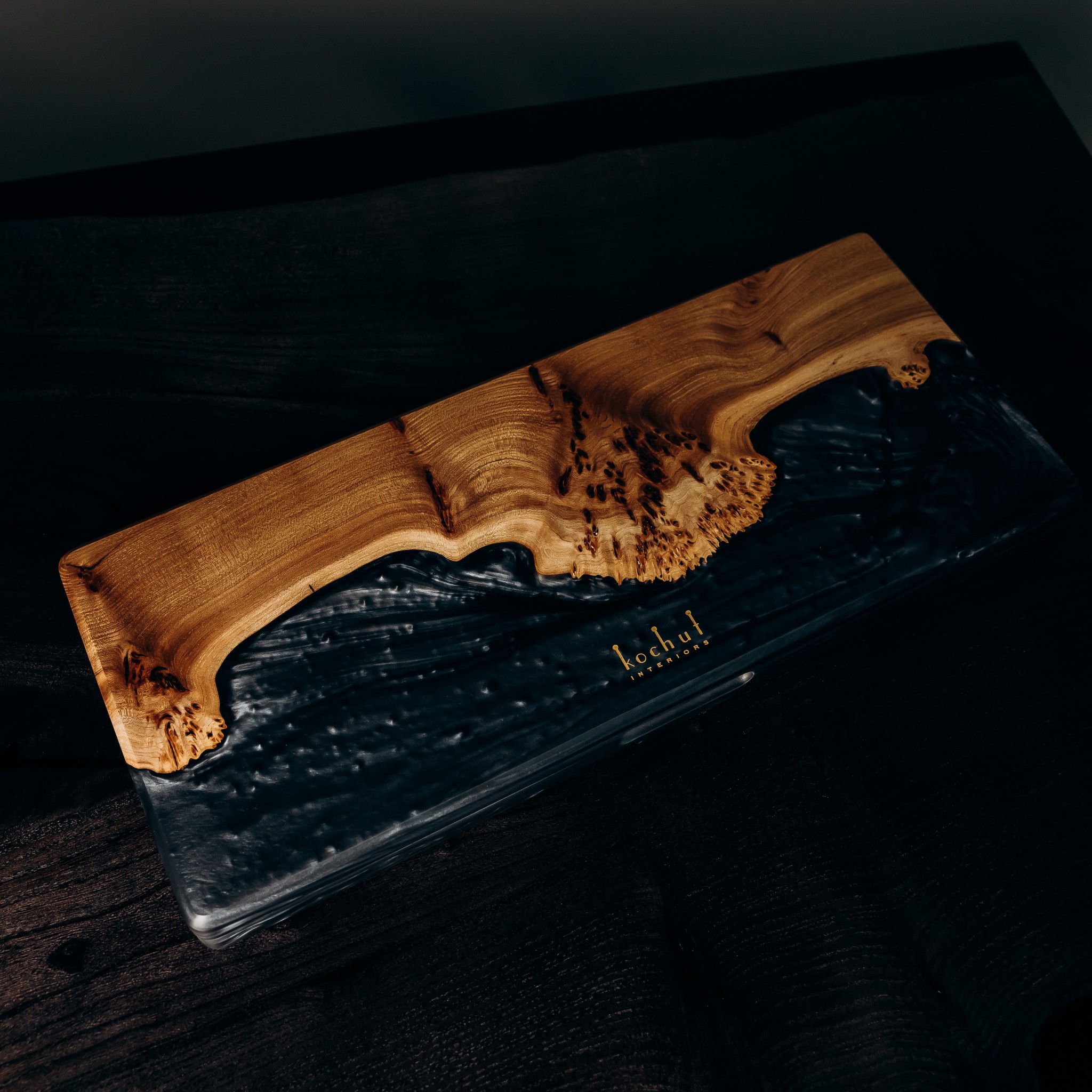 It combines two profound materials — epoxy resin in the shade of Colombian emerald and natural rocky elm wood with a striking texture.
