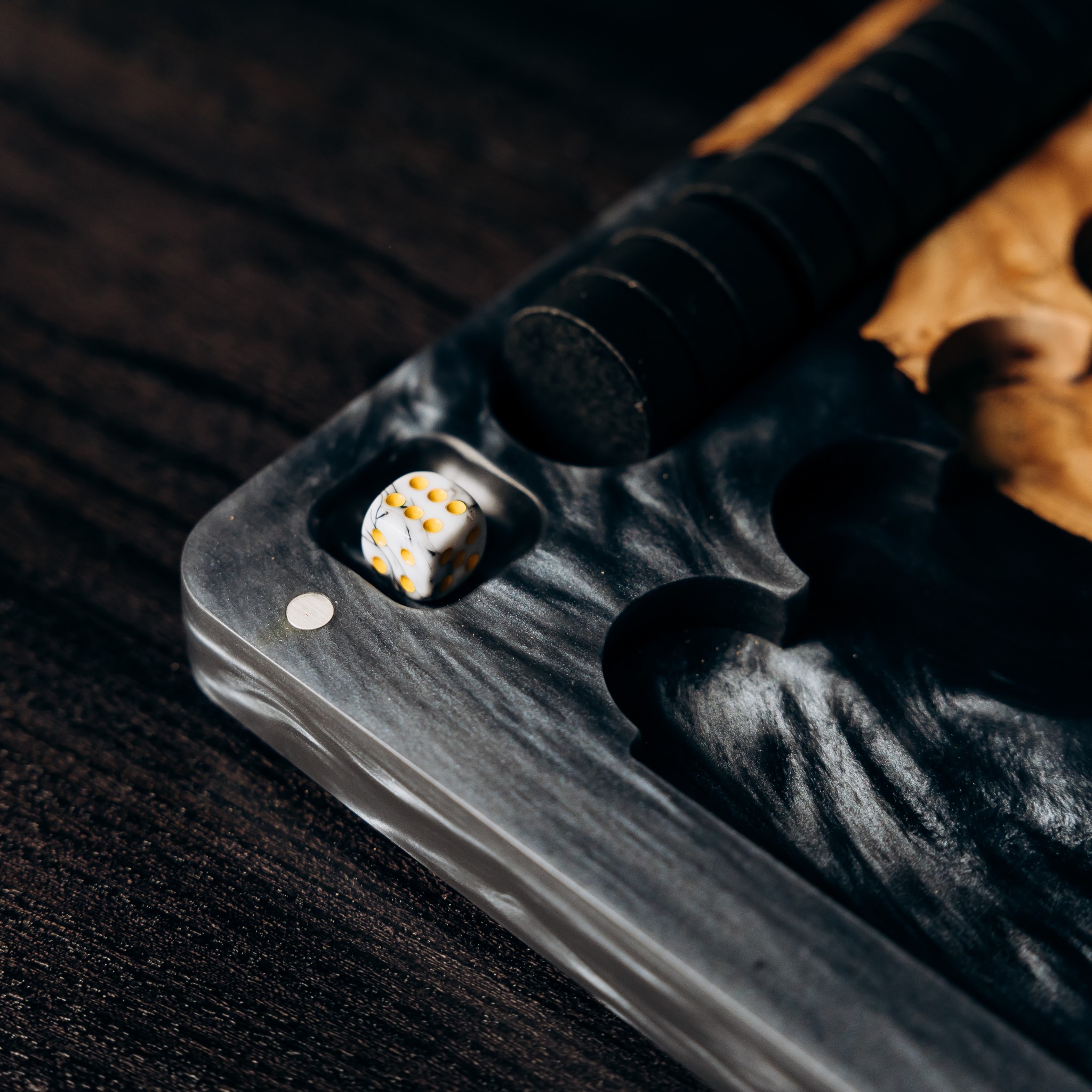 Viatum — backgammon made of wood and black pearl–tinted resin