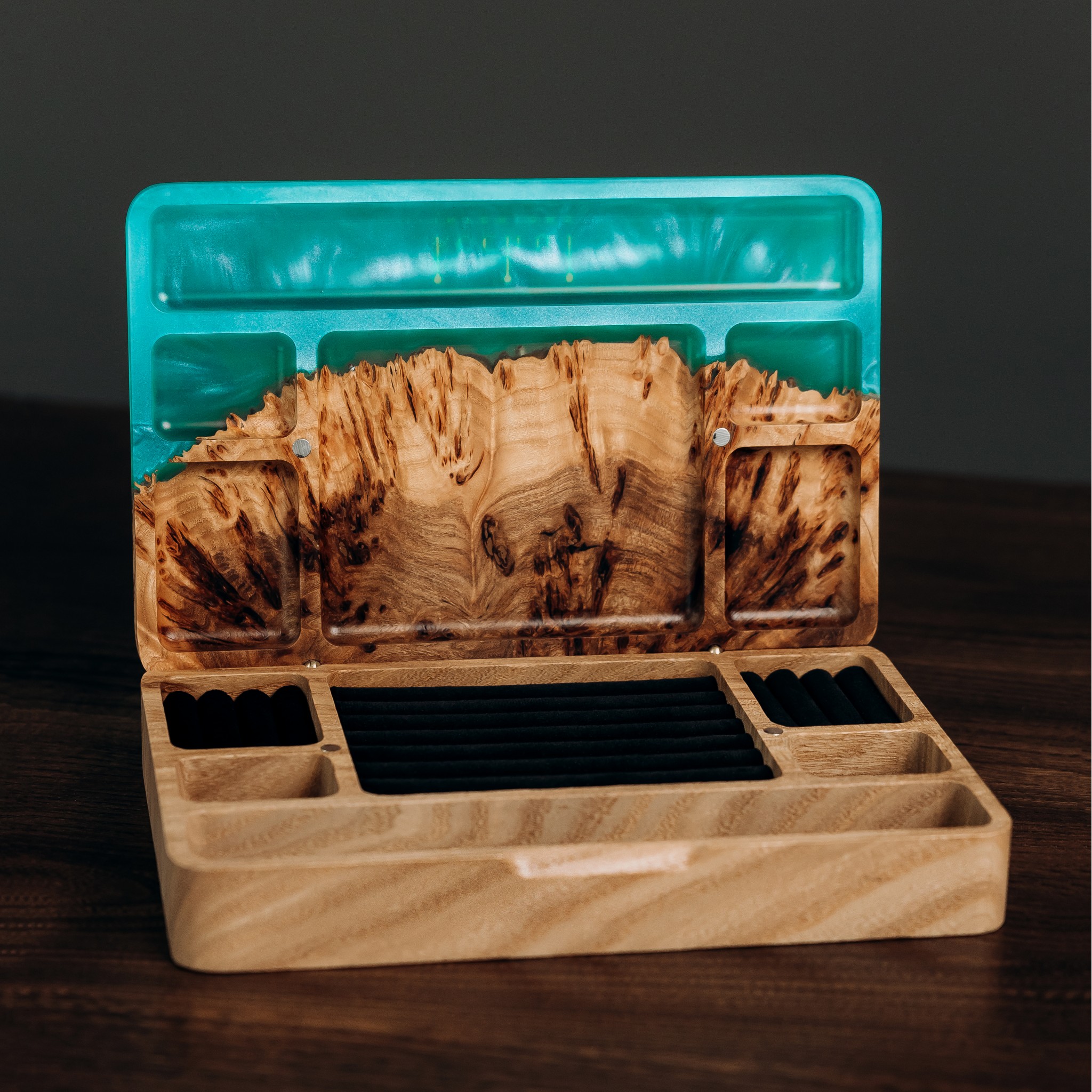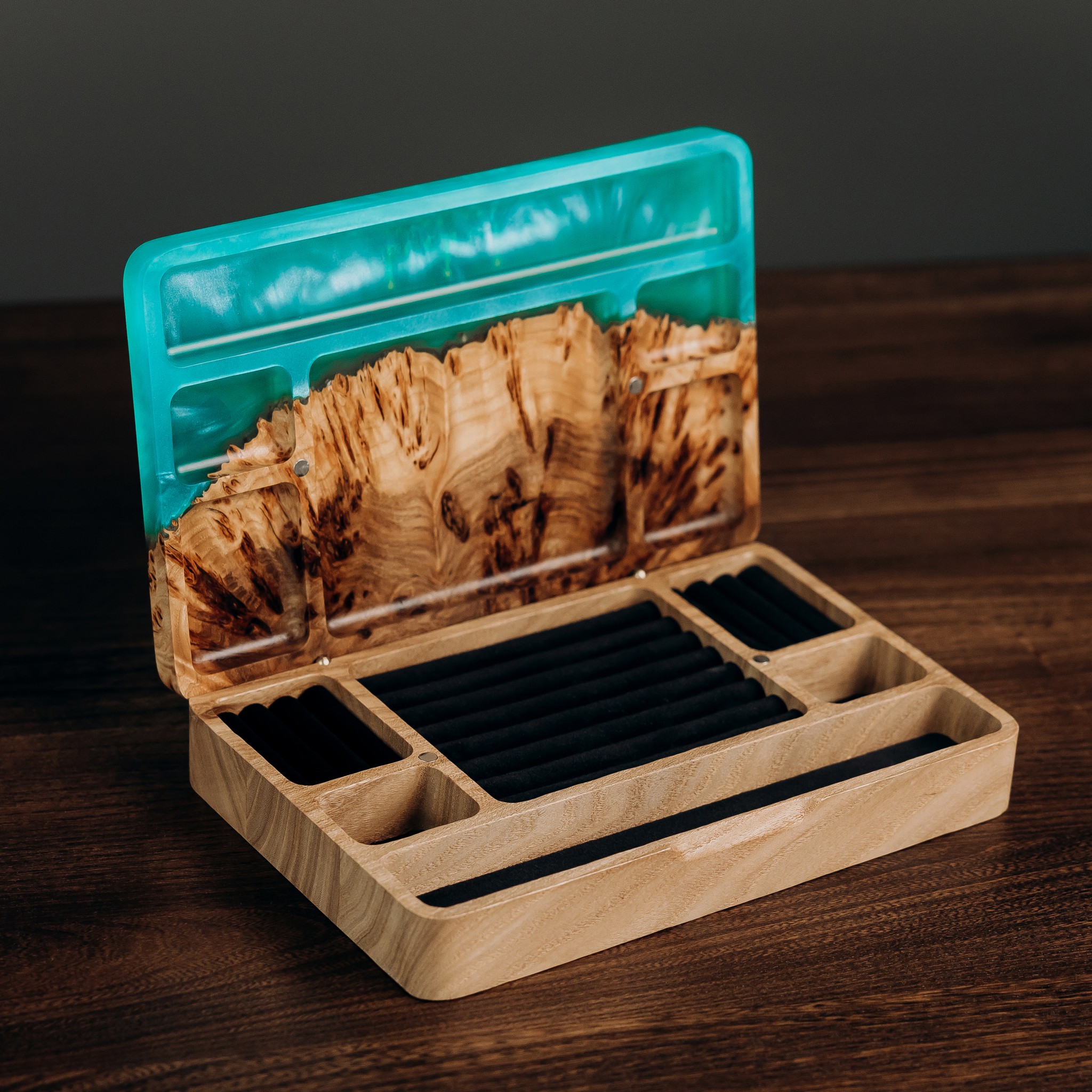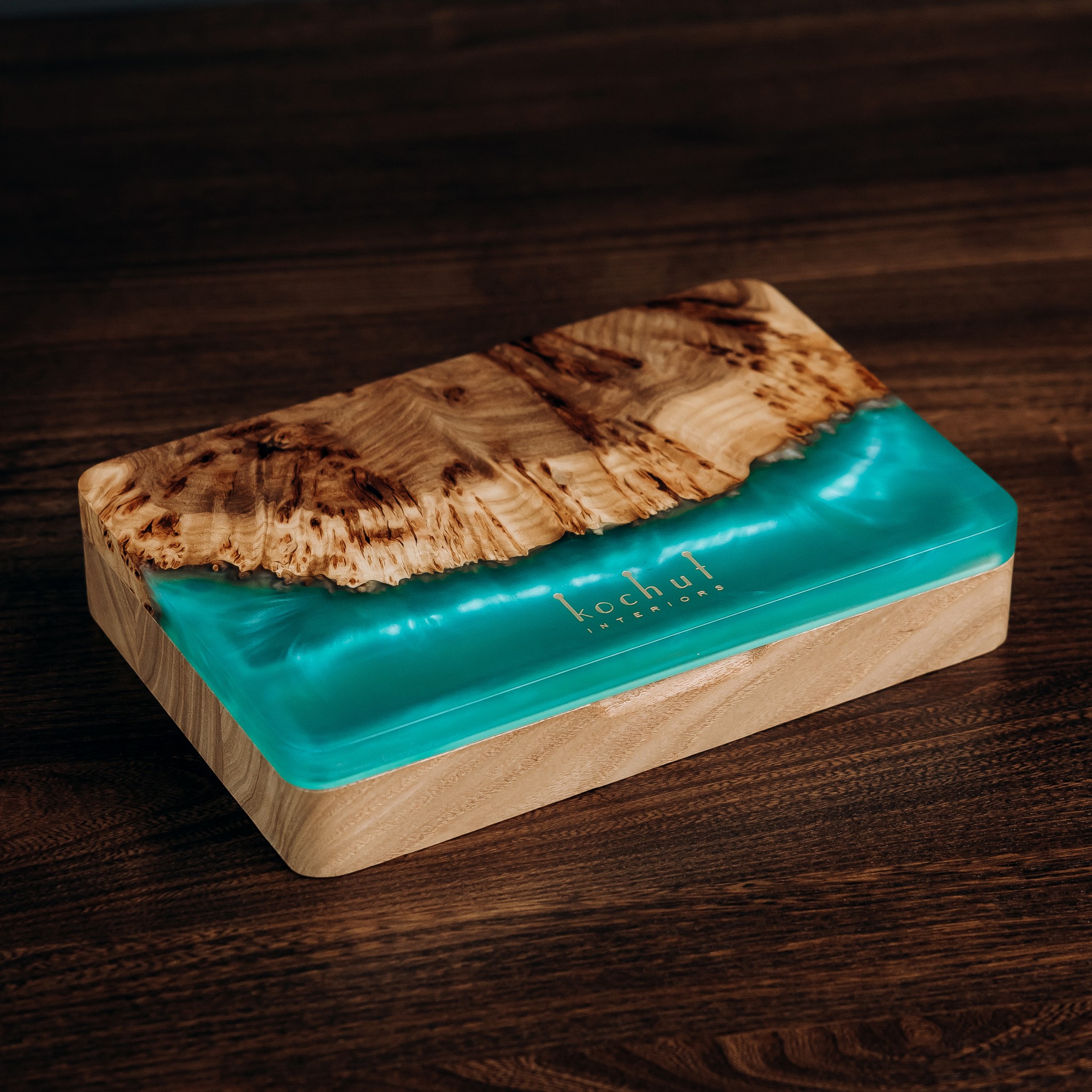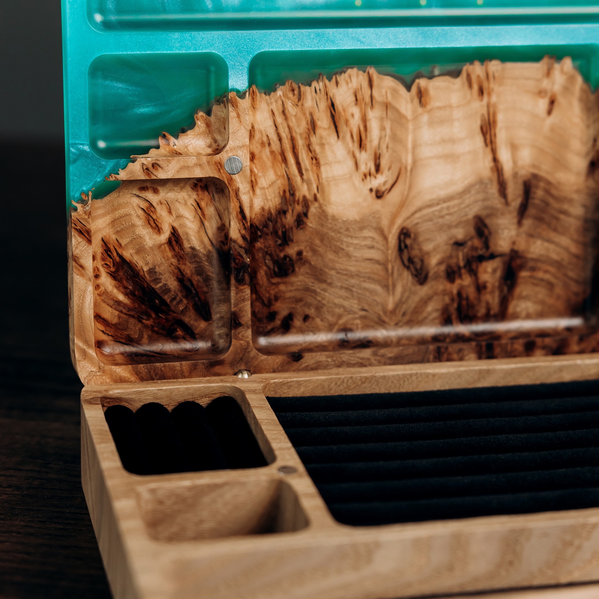 “Ornament” is a reflection of the Ukrainian code of beauty, embedded in the patterns of nature and art. The texture of age-old wood lines, warm shades of European walnut, and decorative burl inserts of rocky elm create a unique harmony. Transparent epoxy resin adds depth, while pearlescent shimmer gently plays in the light, making each box one of a kind. It will fit beautifully into any interior — from the bedroom to the living room.
