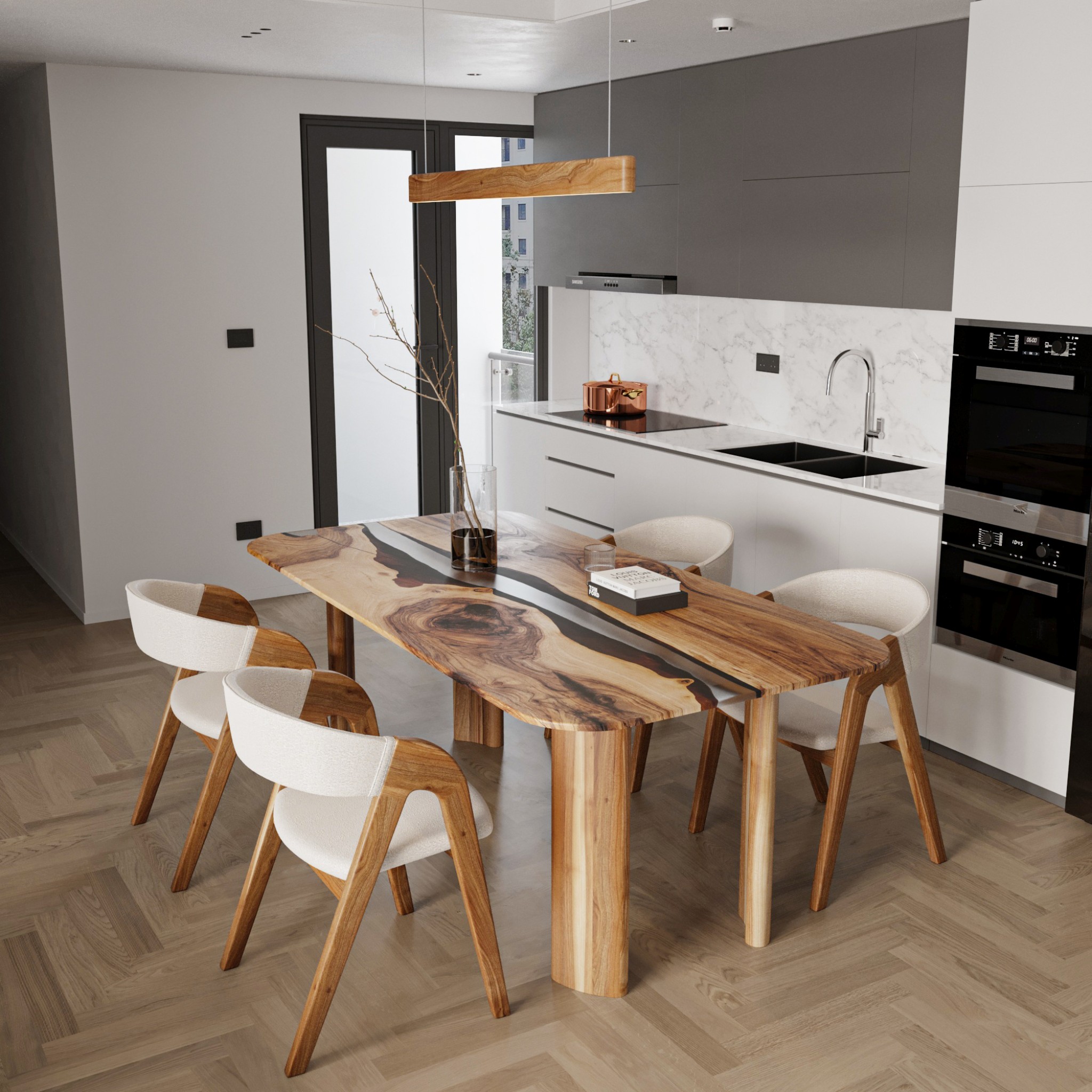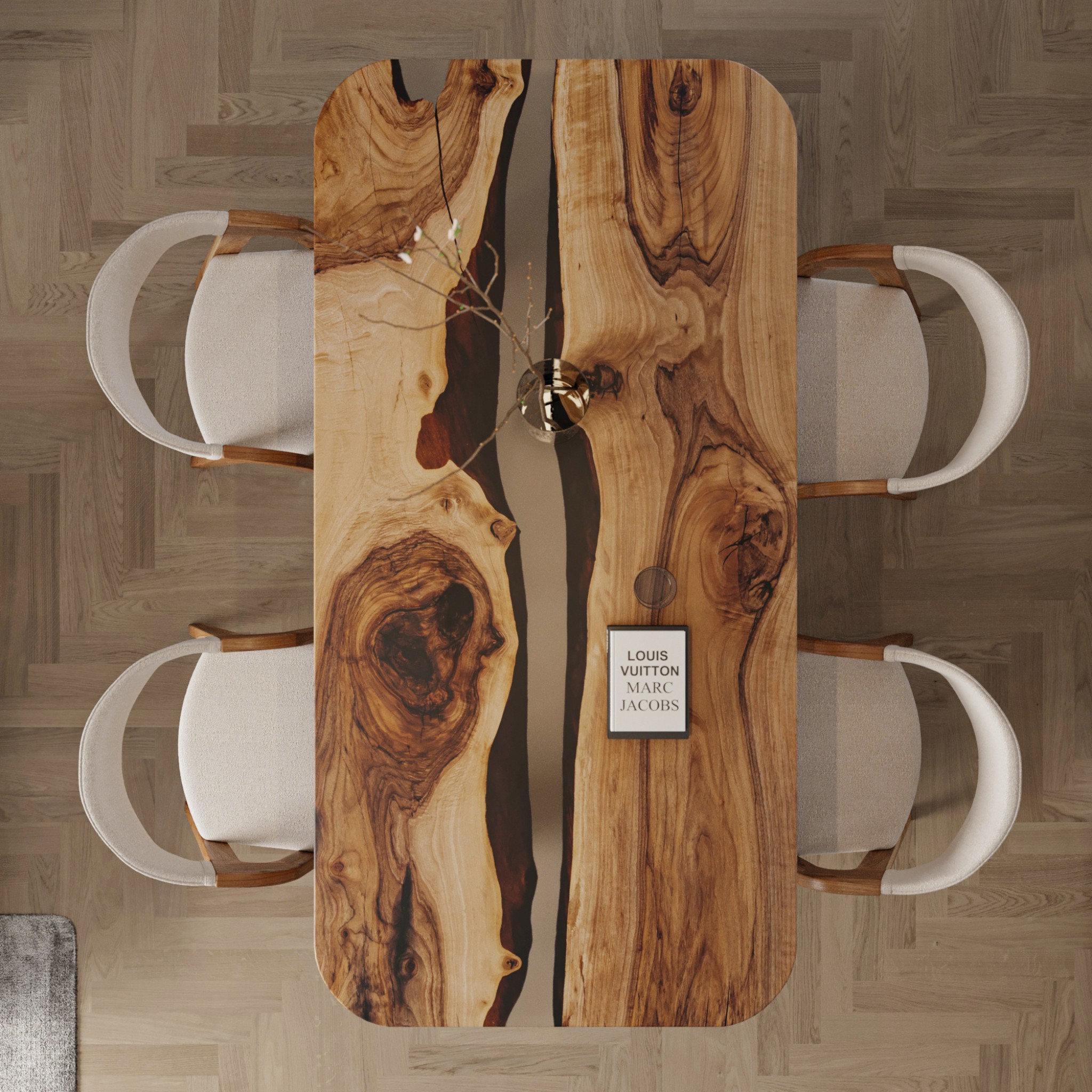 “Twilight Mist” captures the moment between night and dawn when nature is wrapped in a delicate grey veil. This mood is reflected in the table’s design: transparent epoxy resin with a soft grey hue blends harmoniously with natural European walnut wood.