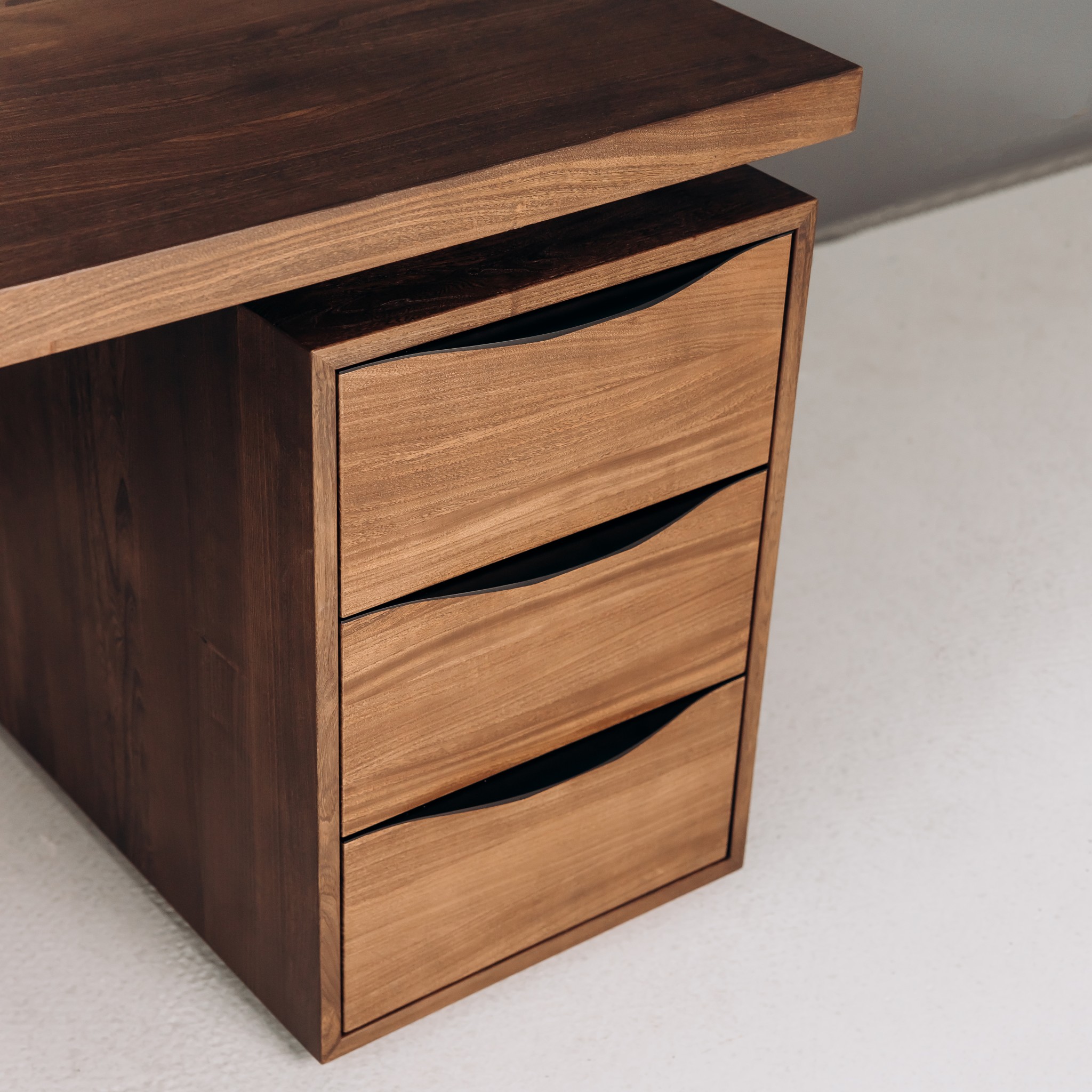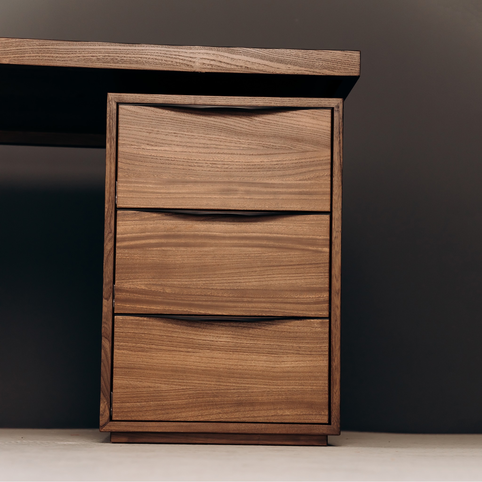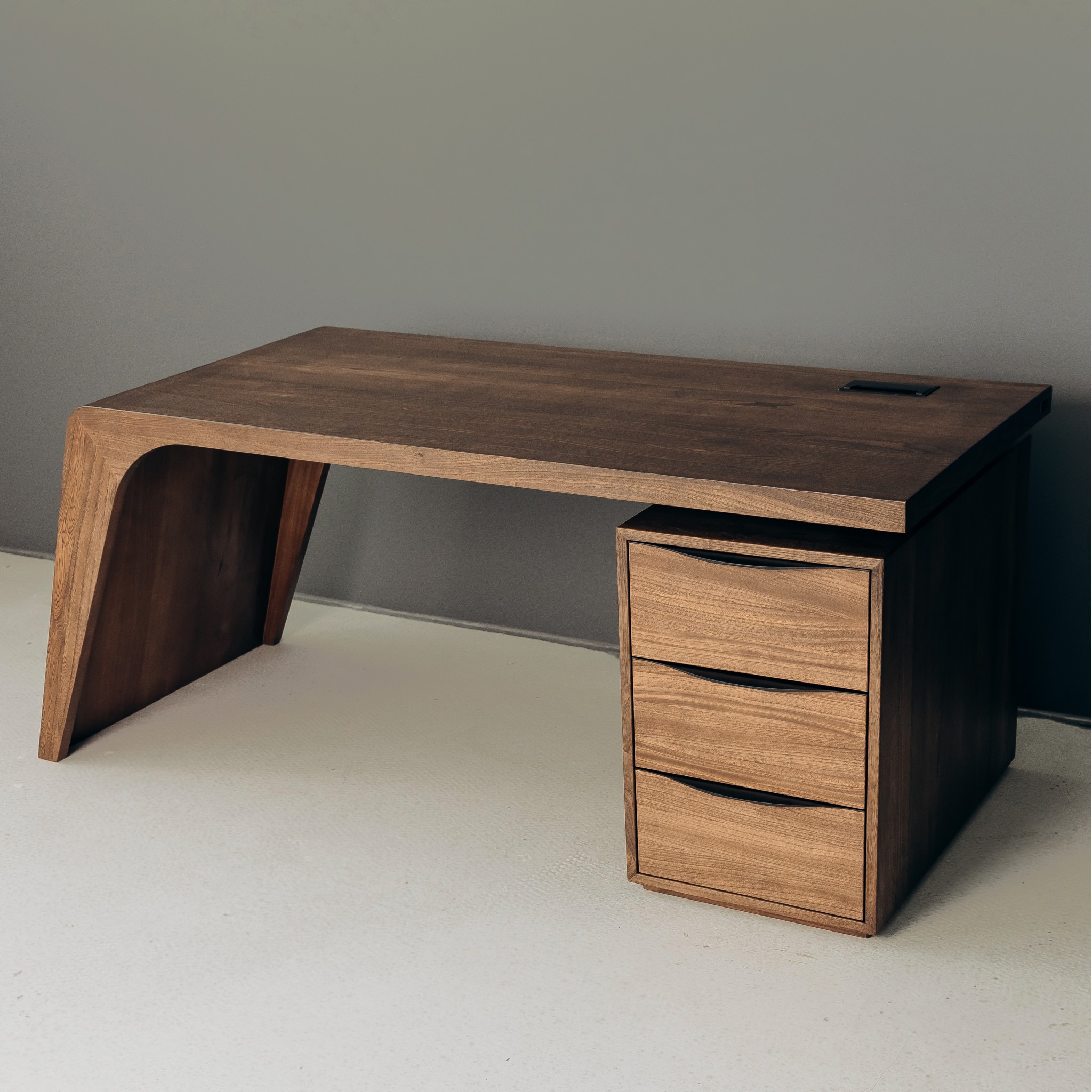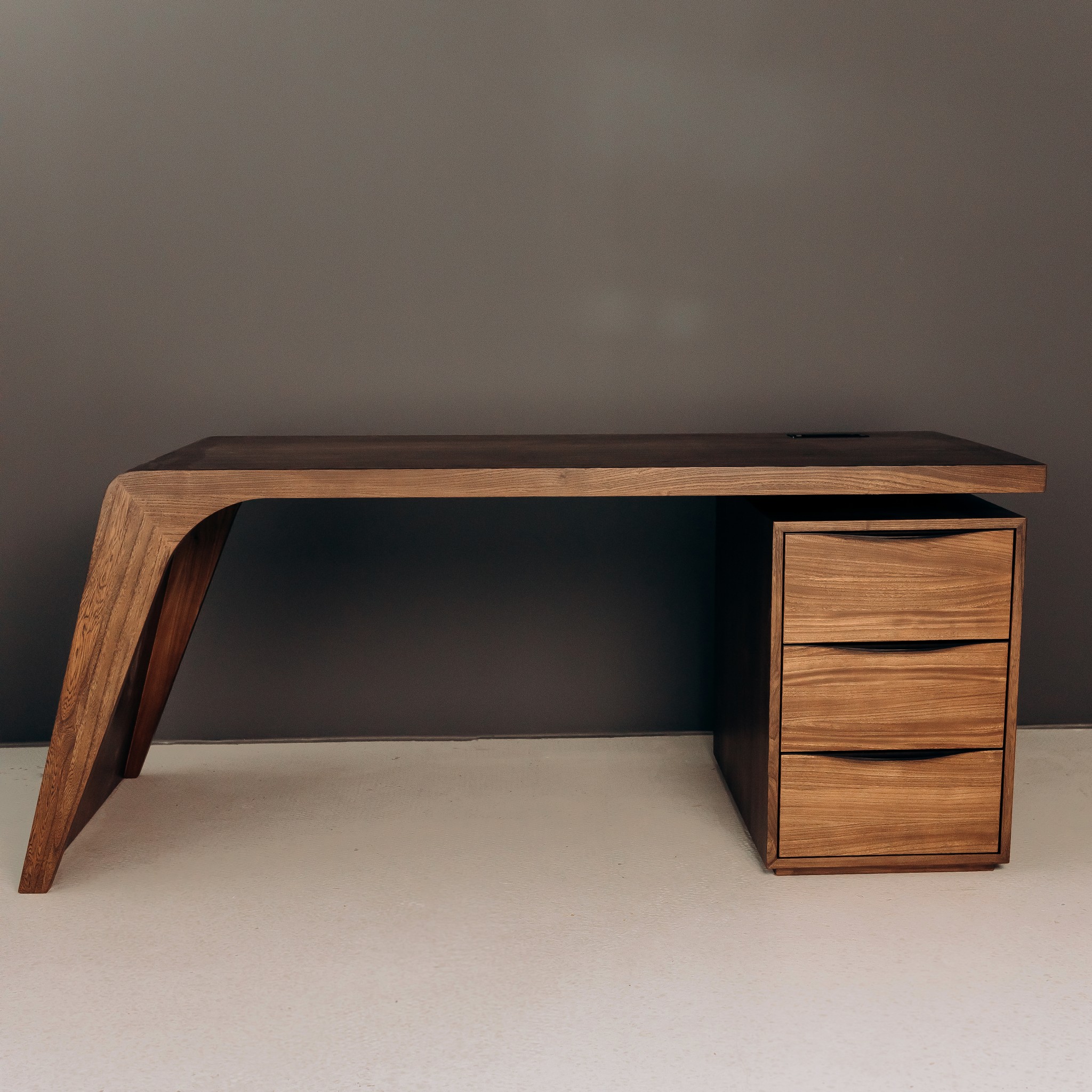 The desk is crafted from Carpathian ash — a wood with a natural, expressive texture that adds depth and character. Balanced proportions, a smooth curve of the supporting leg, and the mass of the drawer unit create a modern premium workstation that looks solid, calm, and confident.
