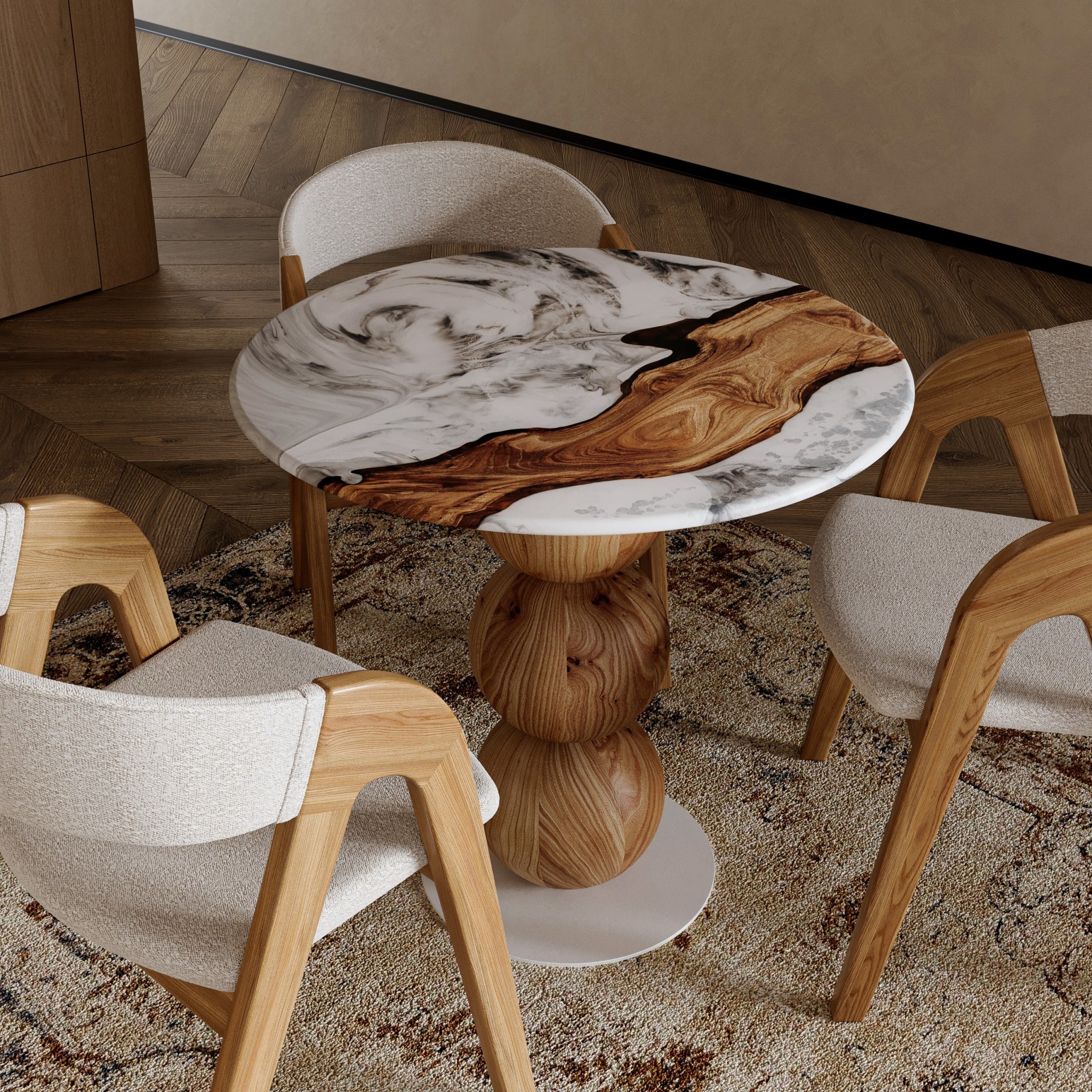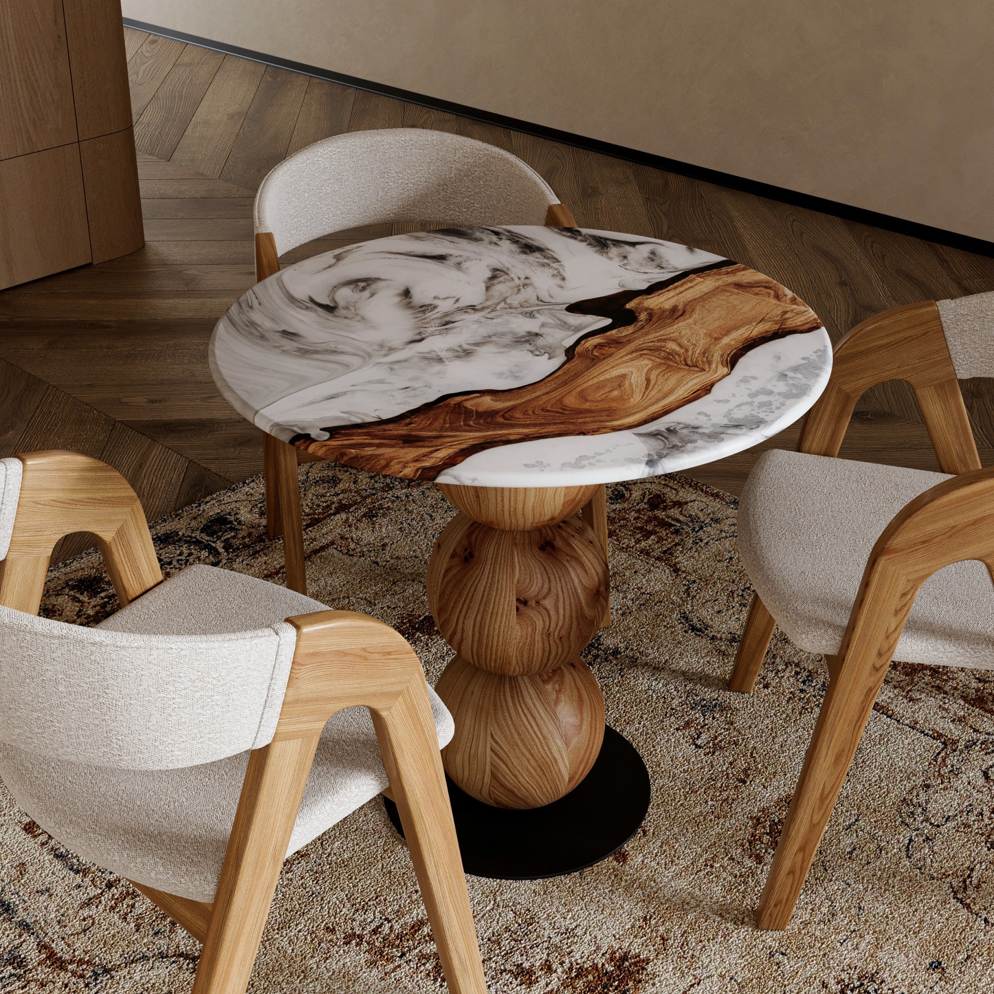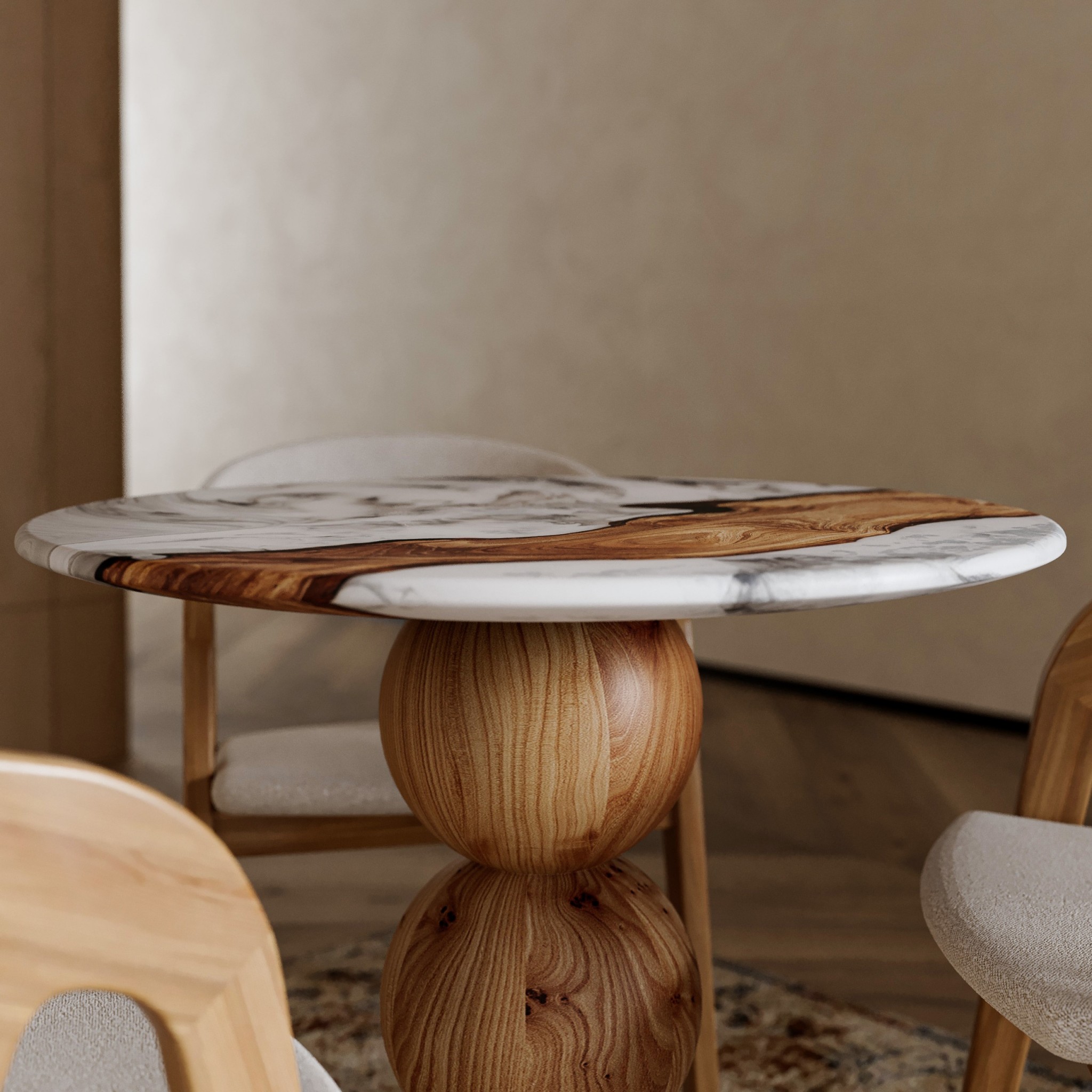 The 780 mm diameter tabletop is made of rocky elm and complemented by a decorative arkanid insert. The light marble-like texture of the arkanid gently contrasts with the vivid grain of the wood, emphasizing its natural depth and the uniqueness of each piece.