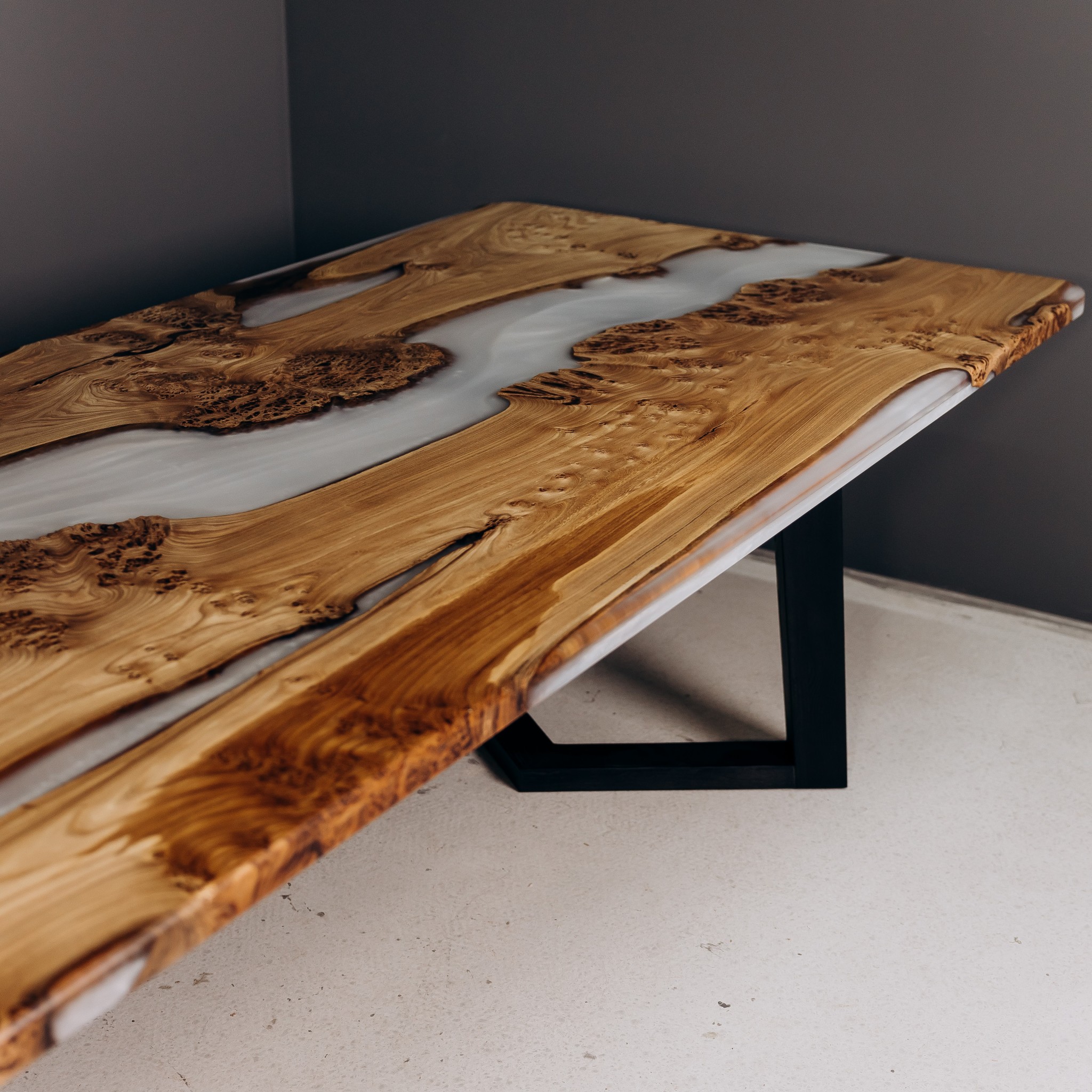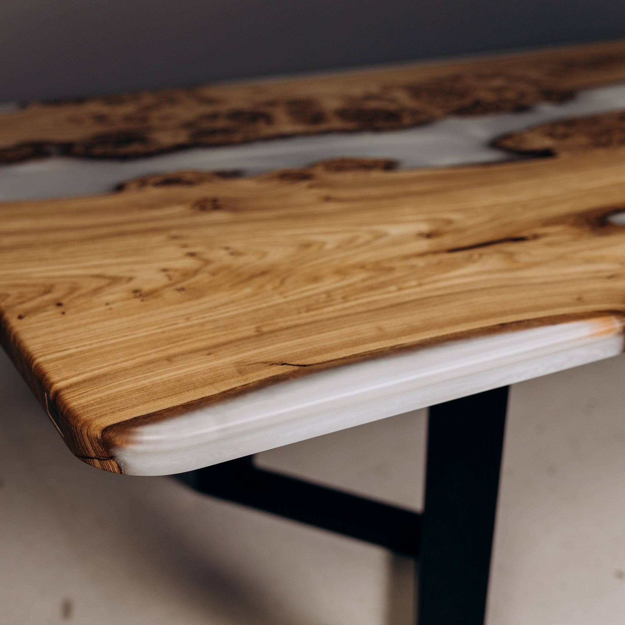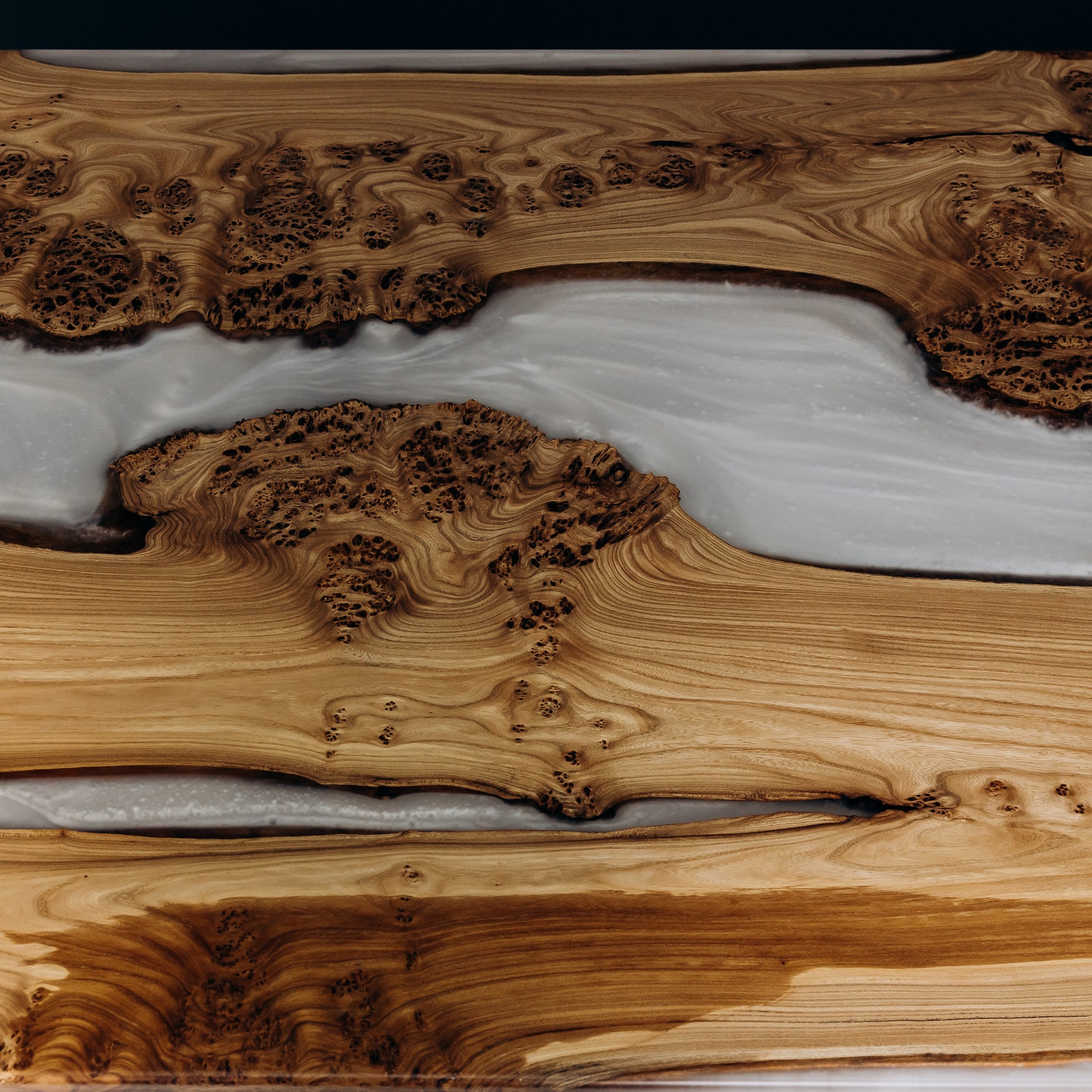 The tabletop is crafted from rock elm with a pronounced natural grain, complemented by white pearlescent epoxy resin. Subtle shimmering tones delicately highlight the wood structure, creating a sense of depth and visual clarity.