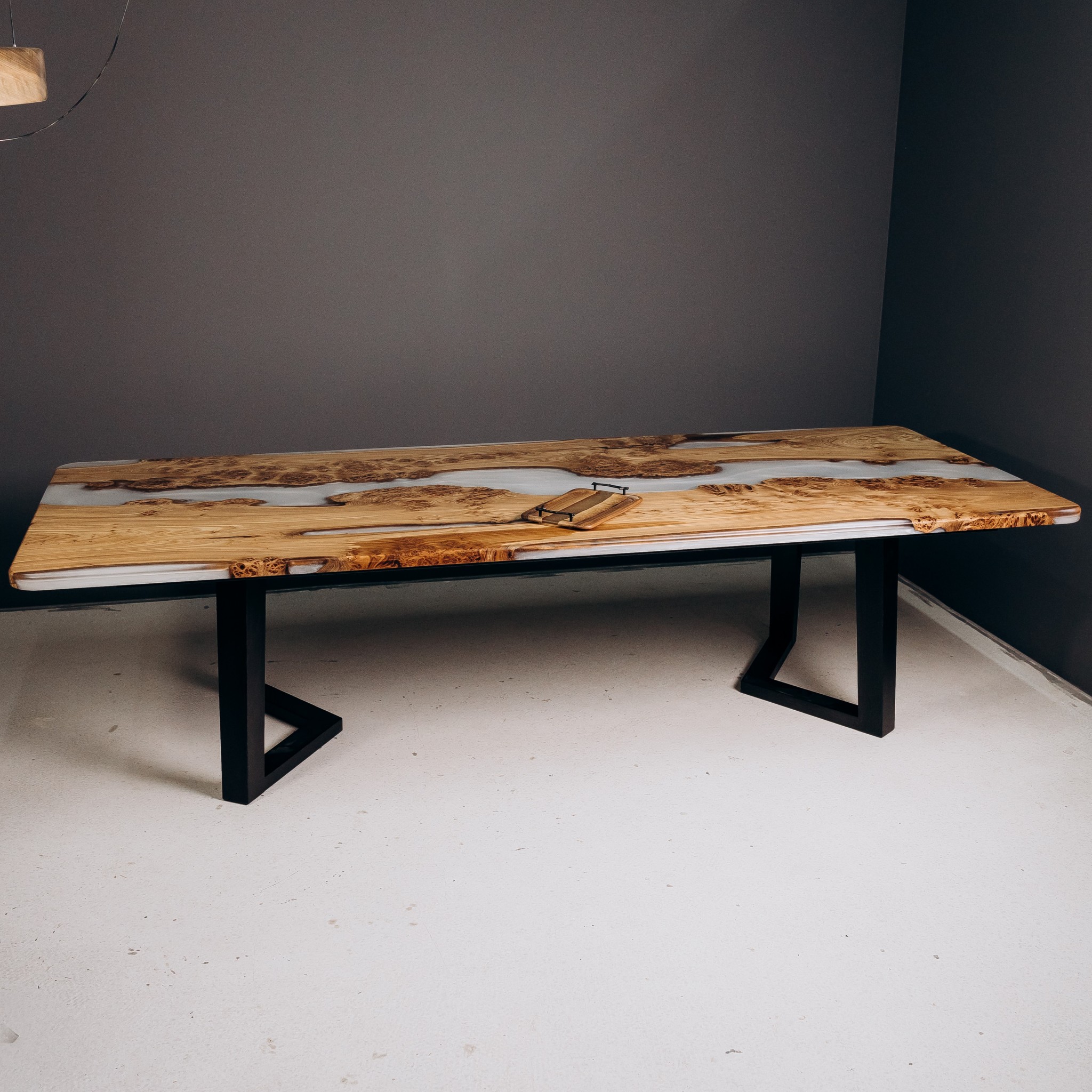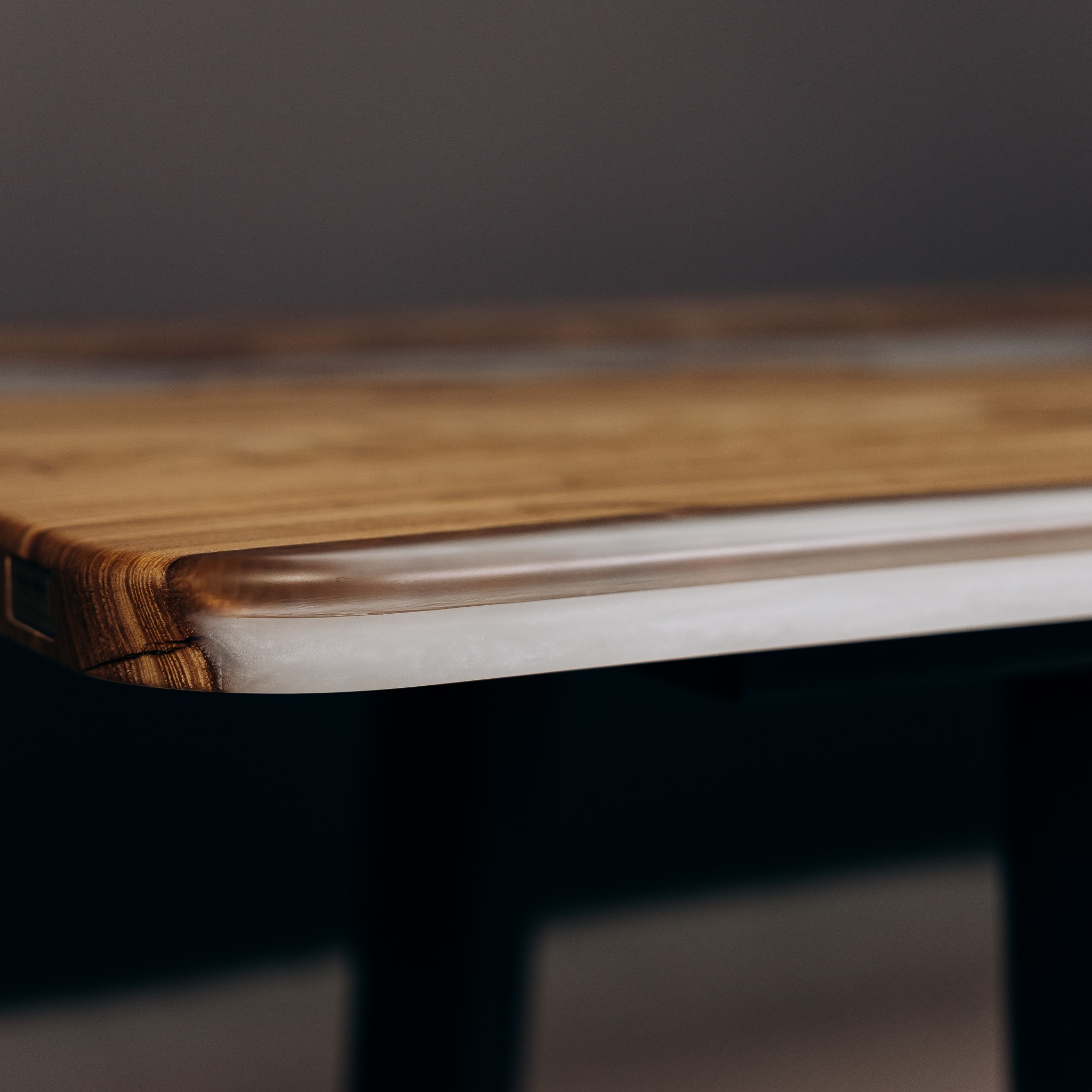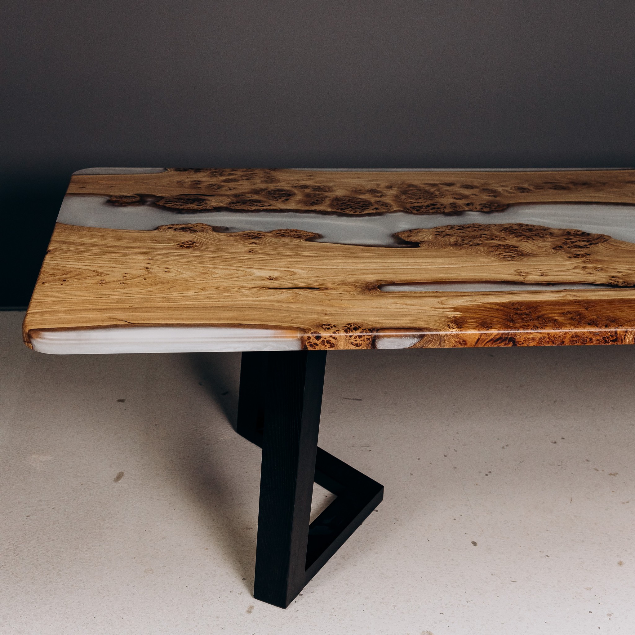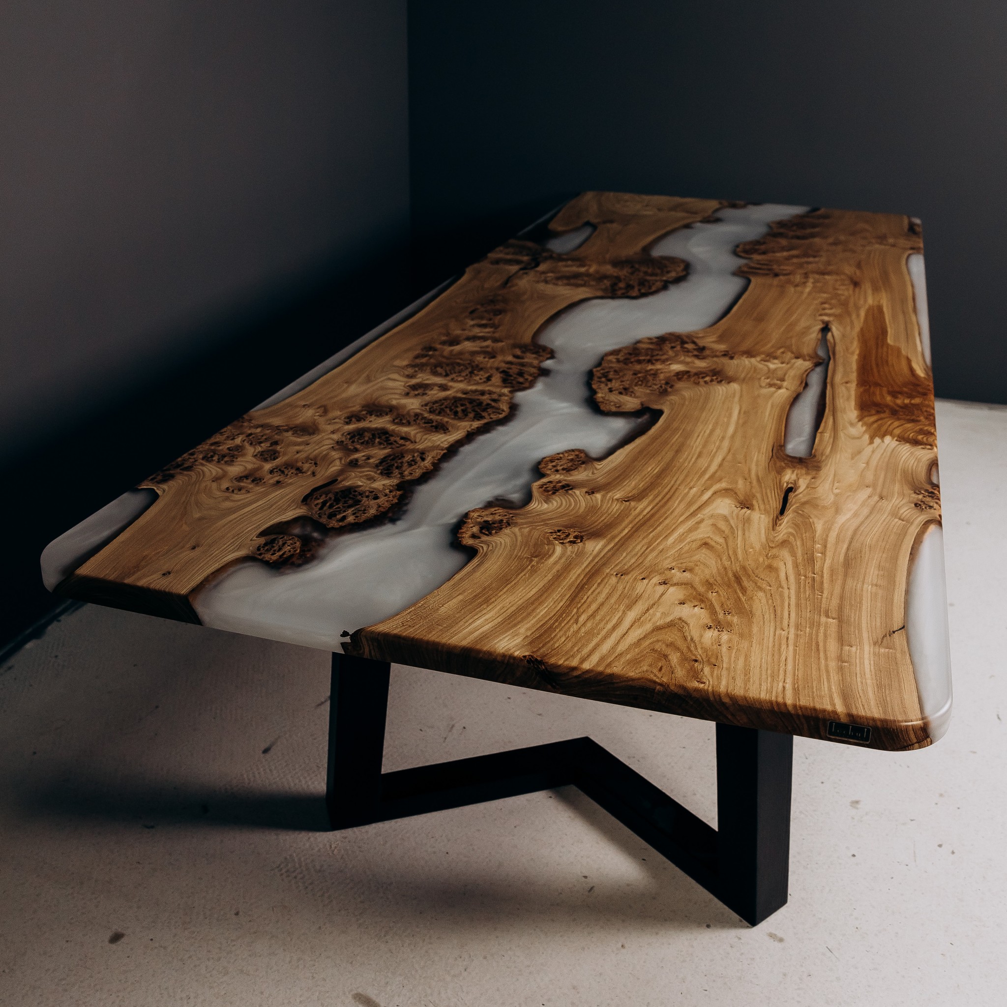 Rock elm, premium-quality epoxy resin, and handcrafted finishing guarantee durability and uniqueness in every piece. Each “Platinum” table is handcrafted by Kochut Interiors artisans with meticulous attention to detail — from material selection to final polishing.