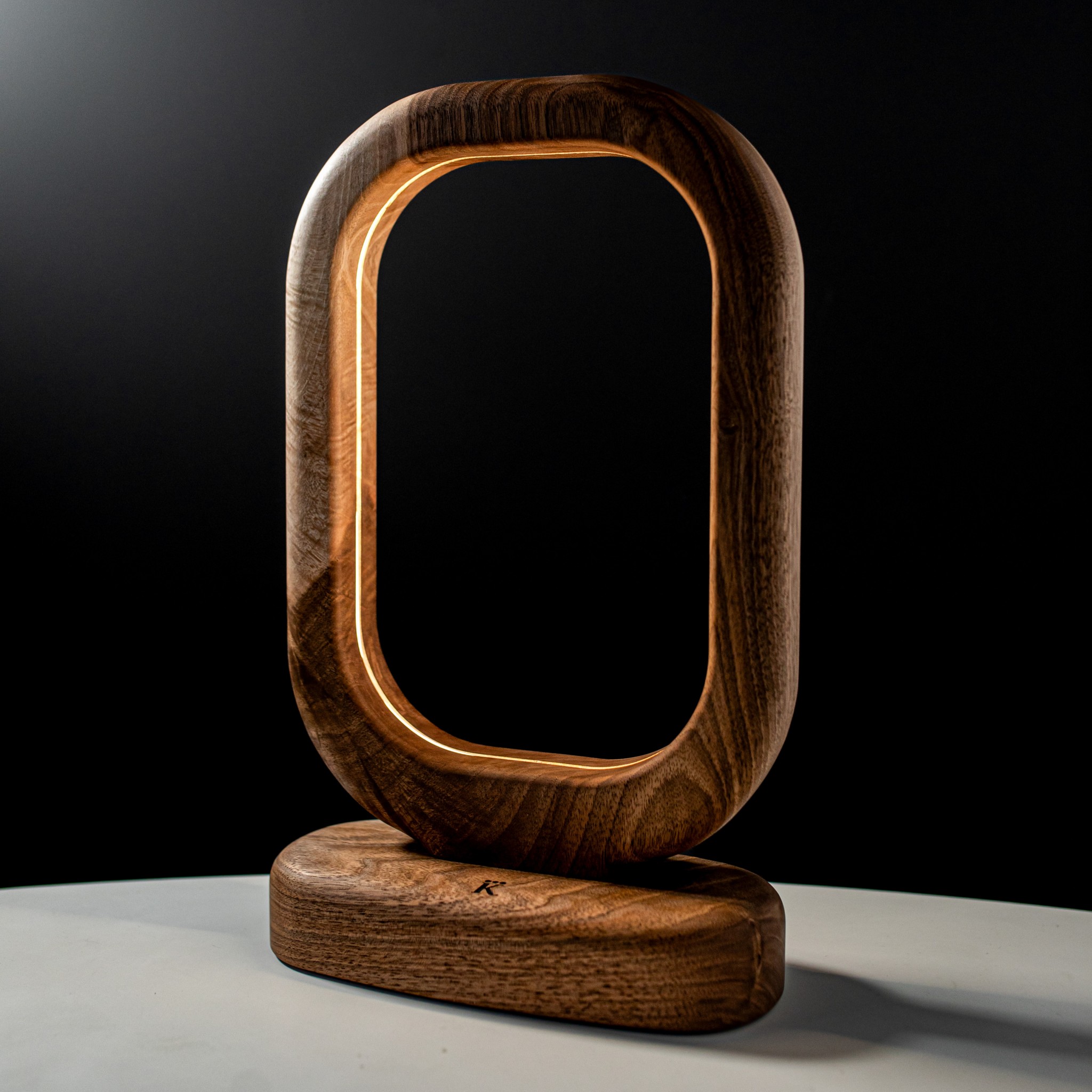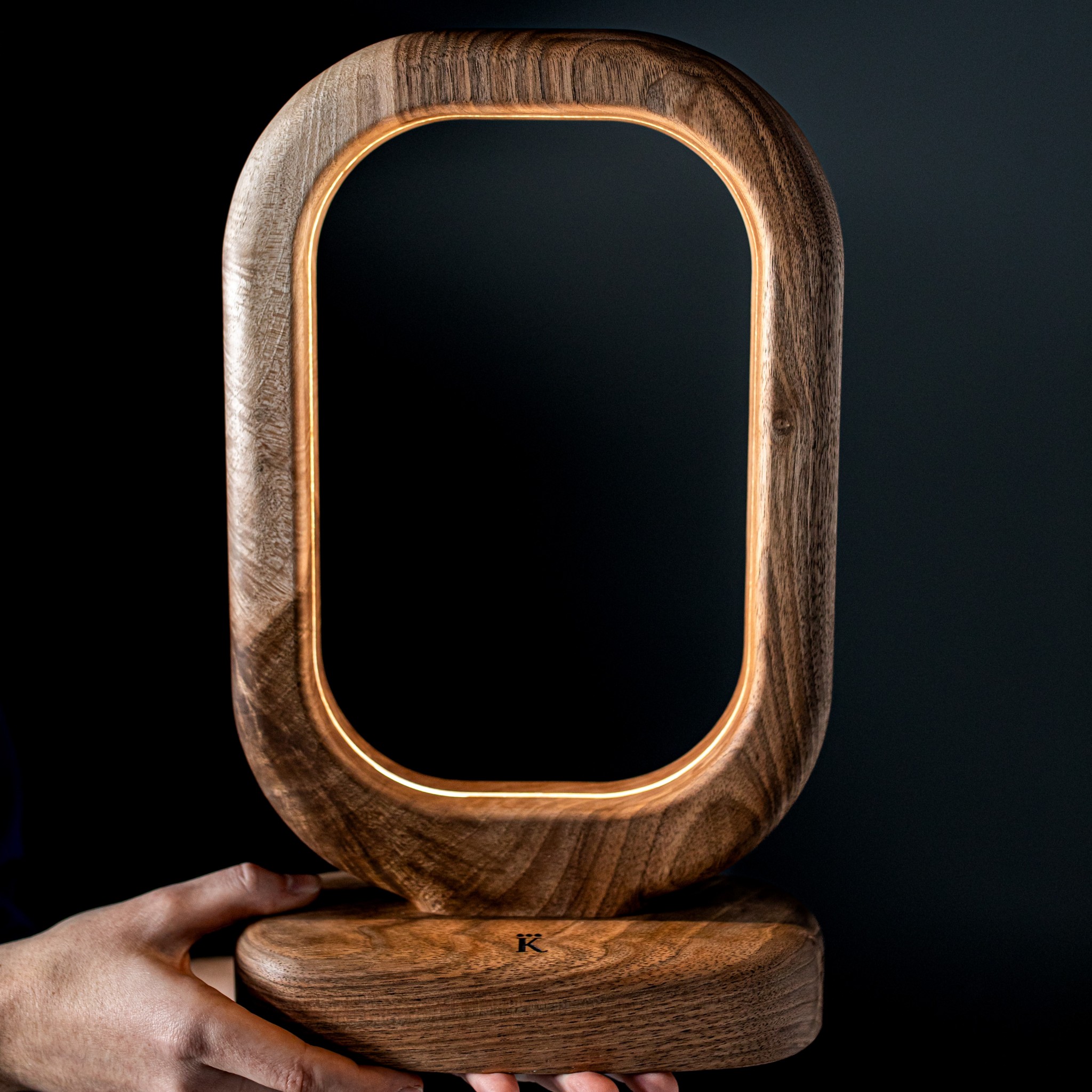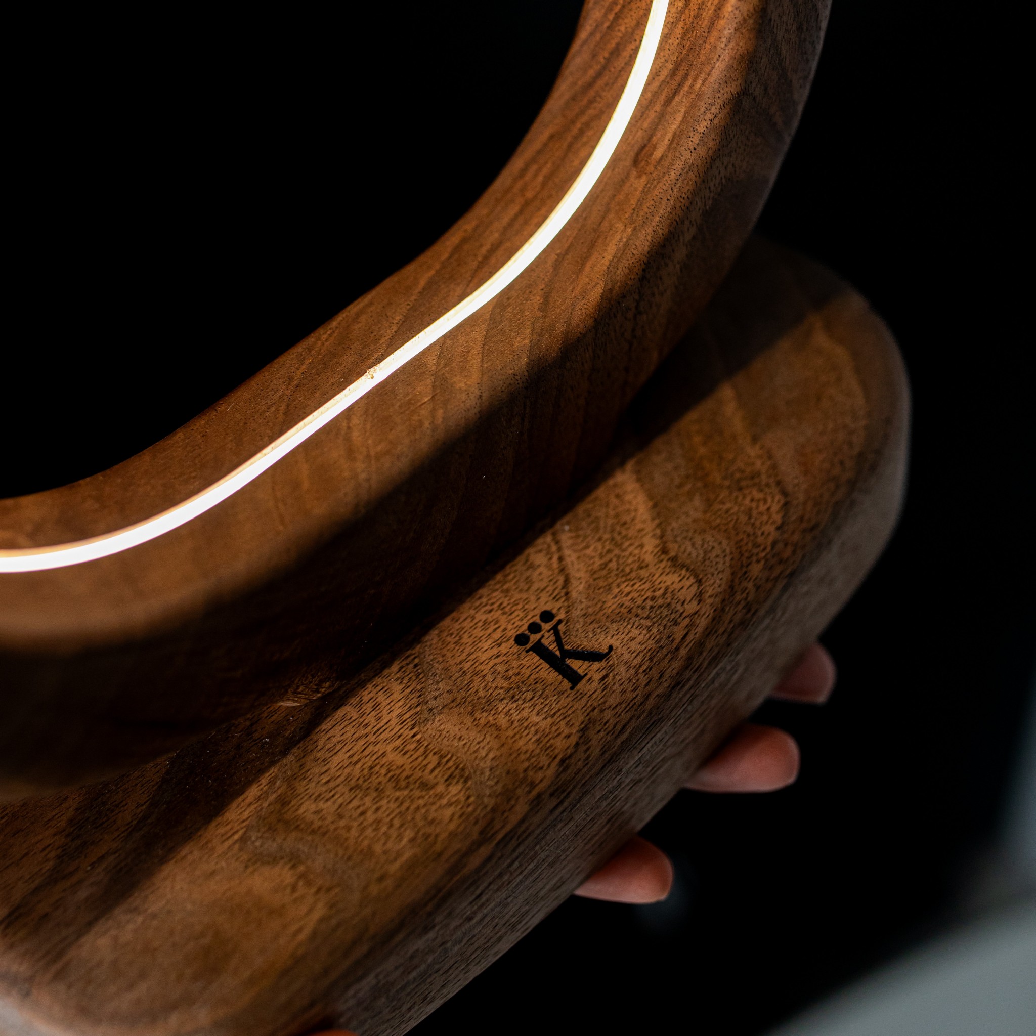 A smooth contour carved into the solid wood creates a glowing frame effect — as if gentle light emerges from within the form itself.