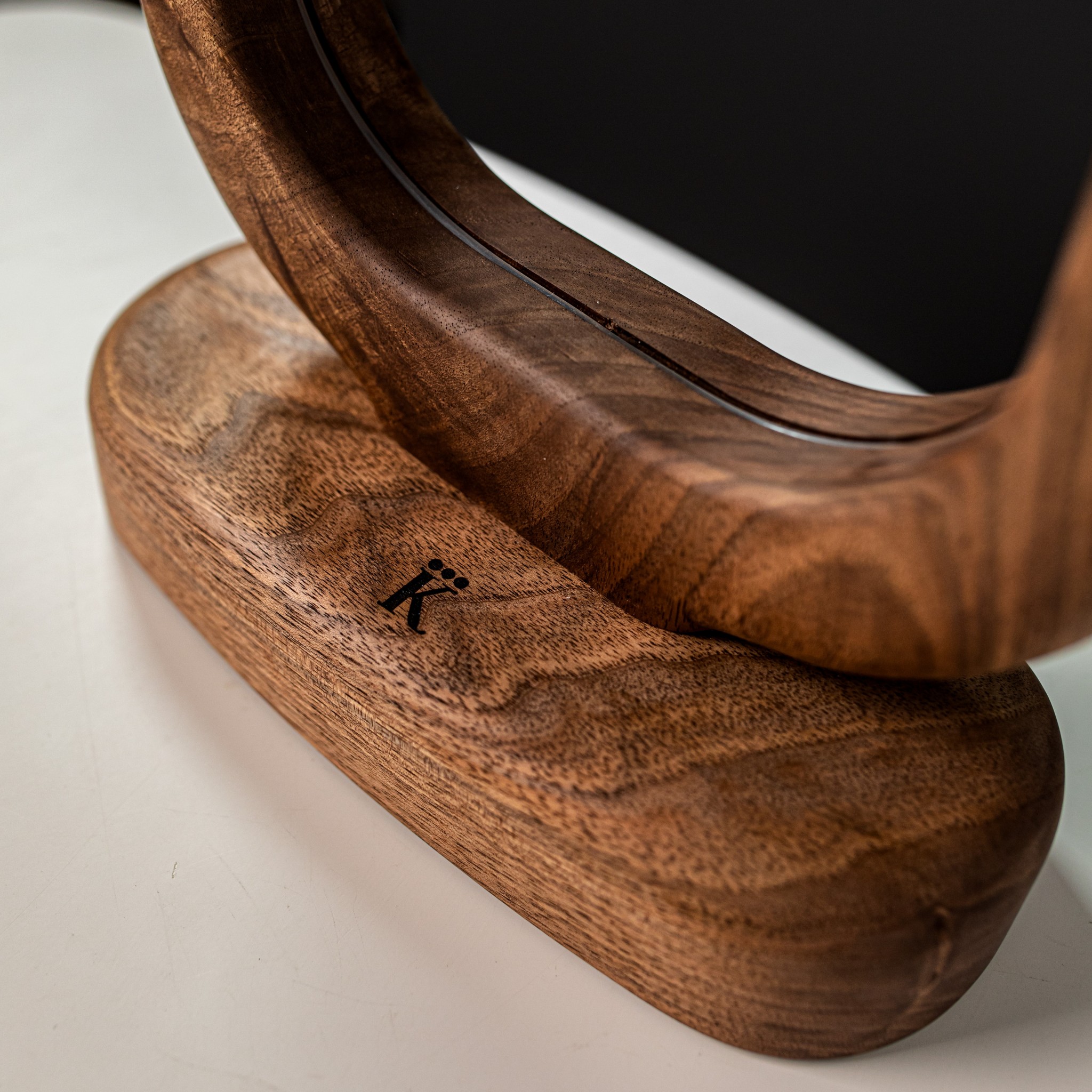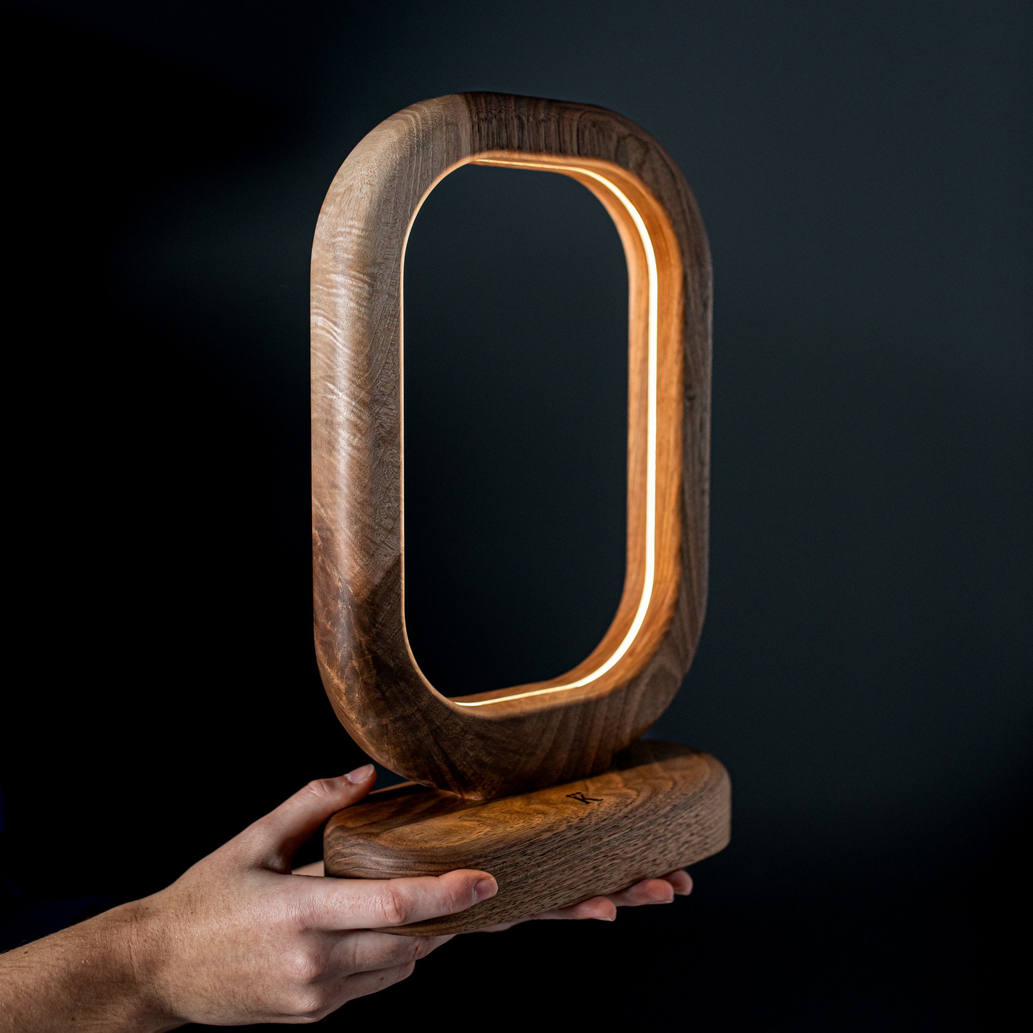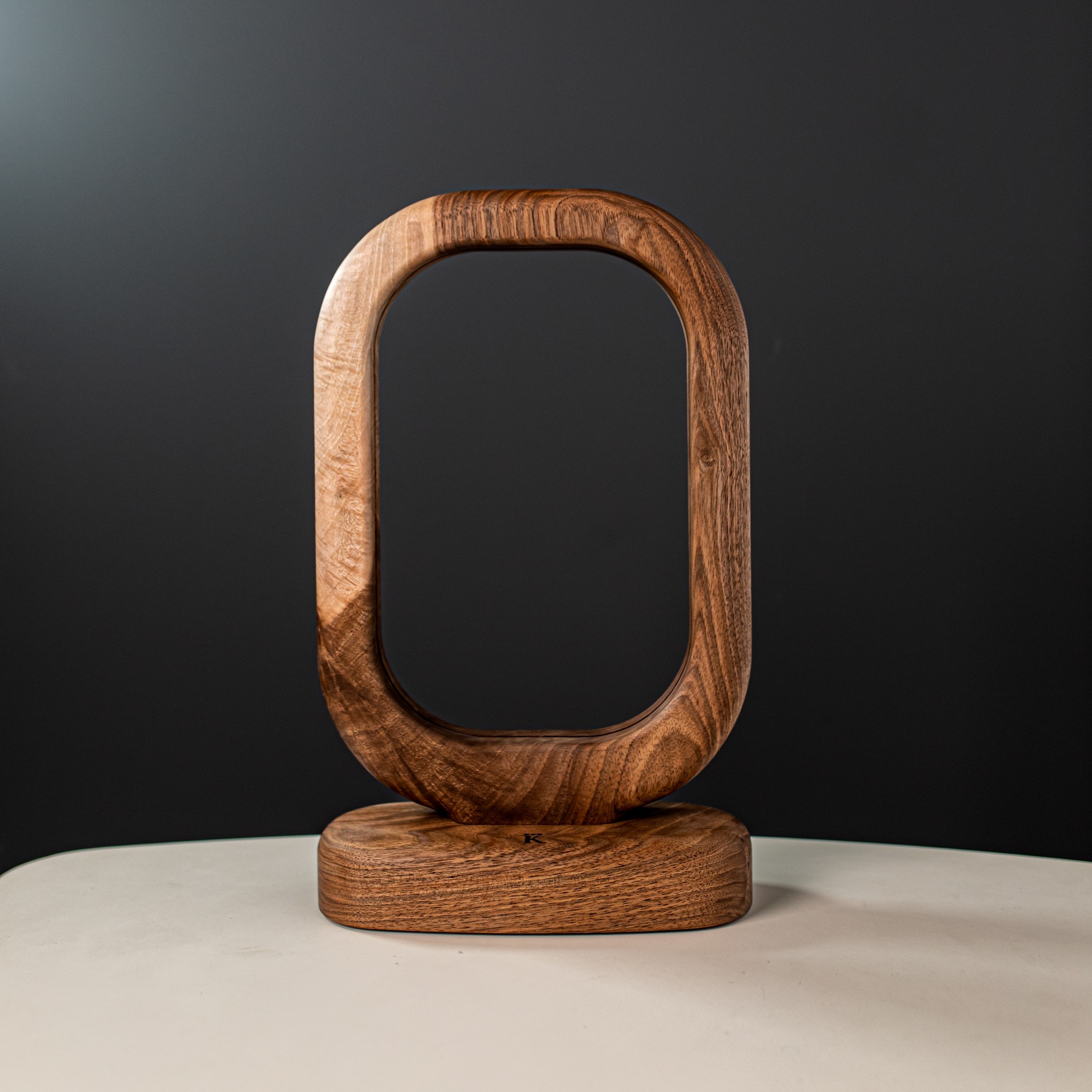 A smooth contour carved into the solid wood creates a glowing frame effect — as if gentle light emerges from within the form itself.