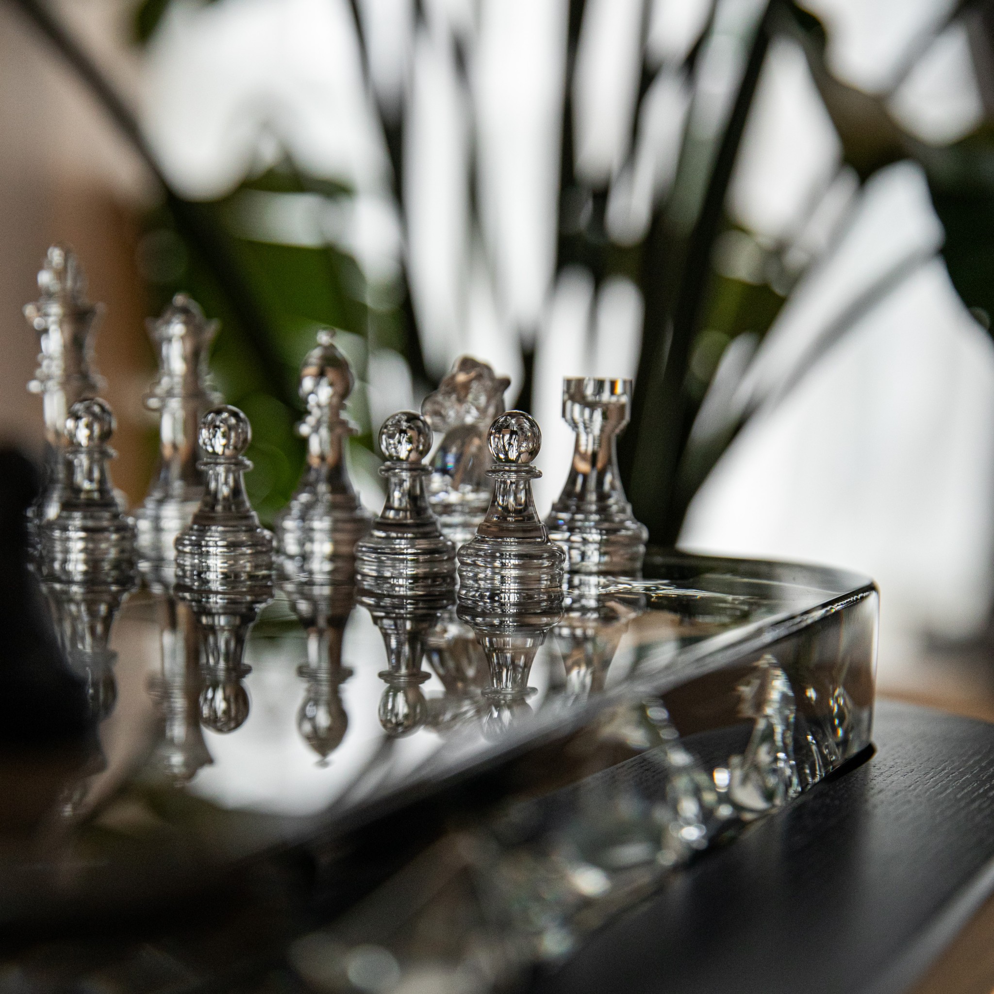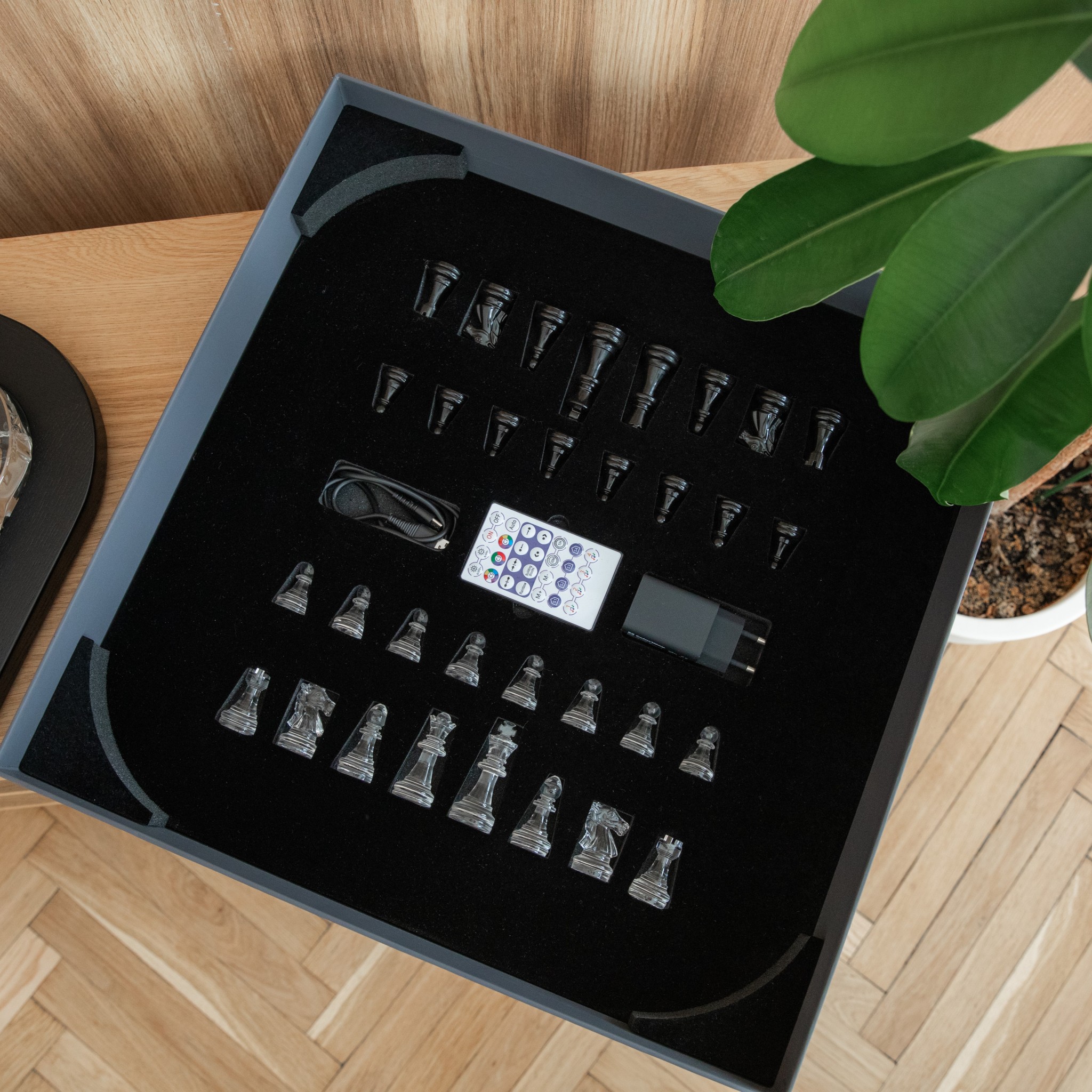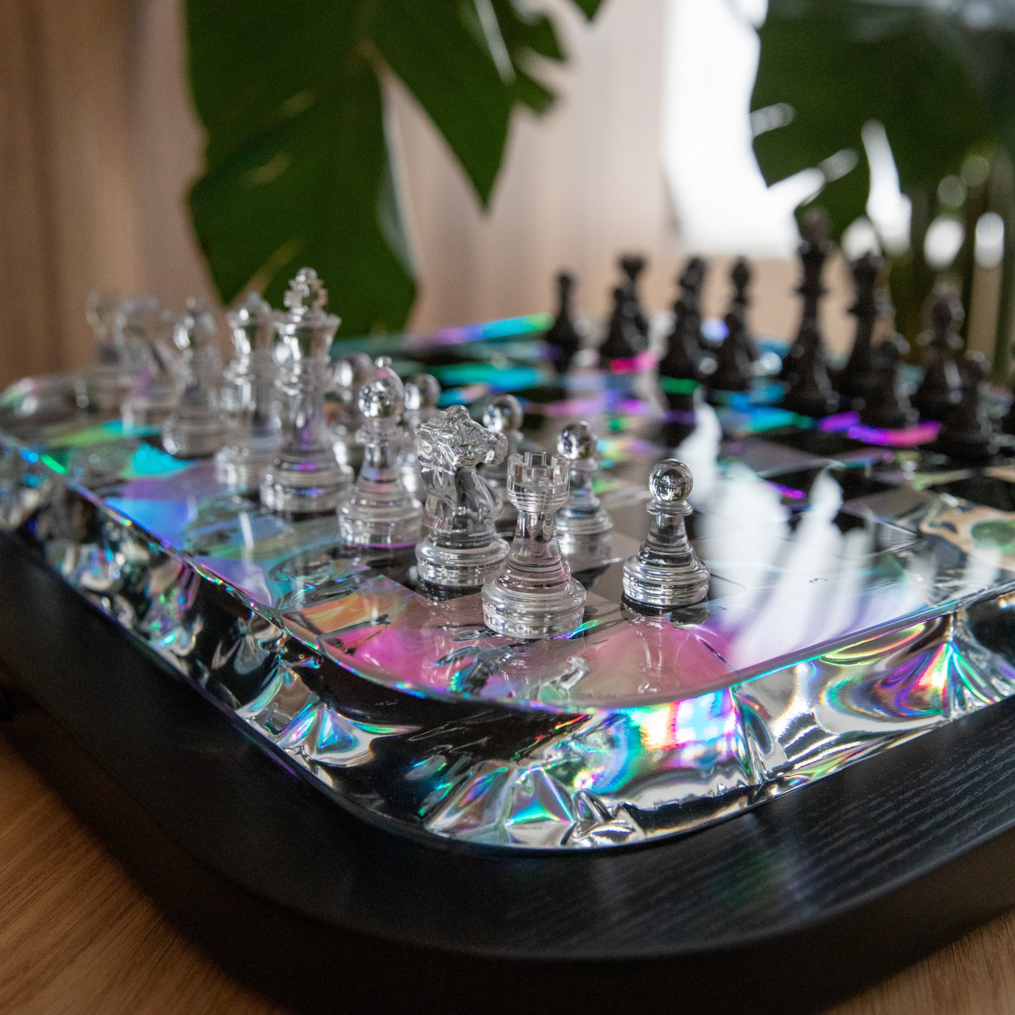 Витончені, мінімалістичні, але з потужним характером — ці шахи створені з прозорої епоксидної смоли, щоб підкреслити оригінальність форми. Їхня рамка з делікатною підсвіткою перетворює кожну партію на перформанс, а саму дошку — на артоб’єкт у вашому інтер’єрі.