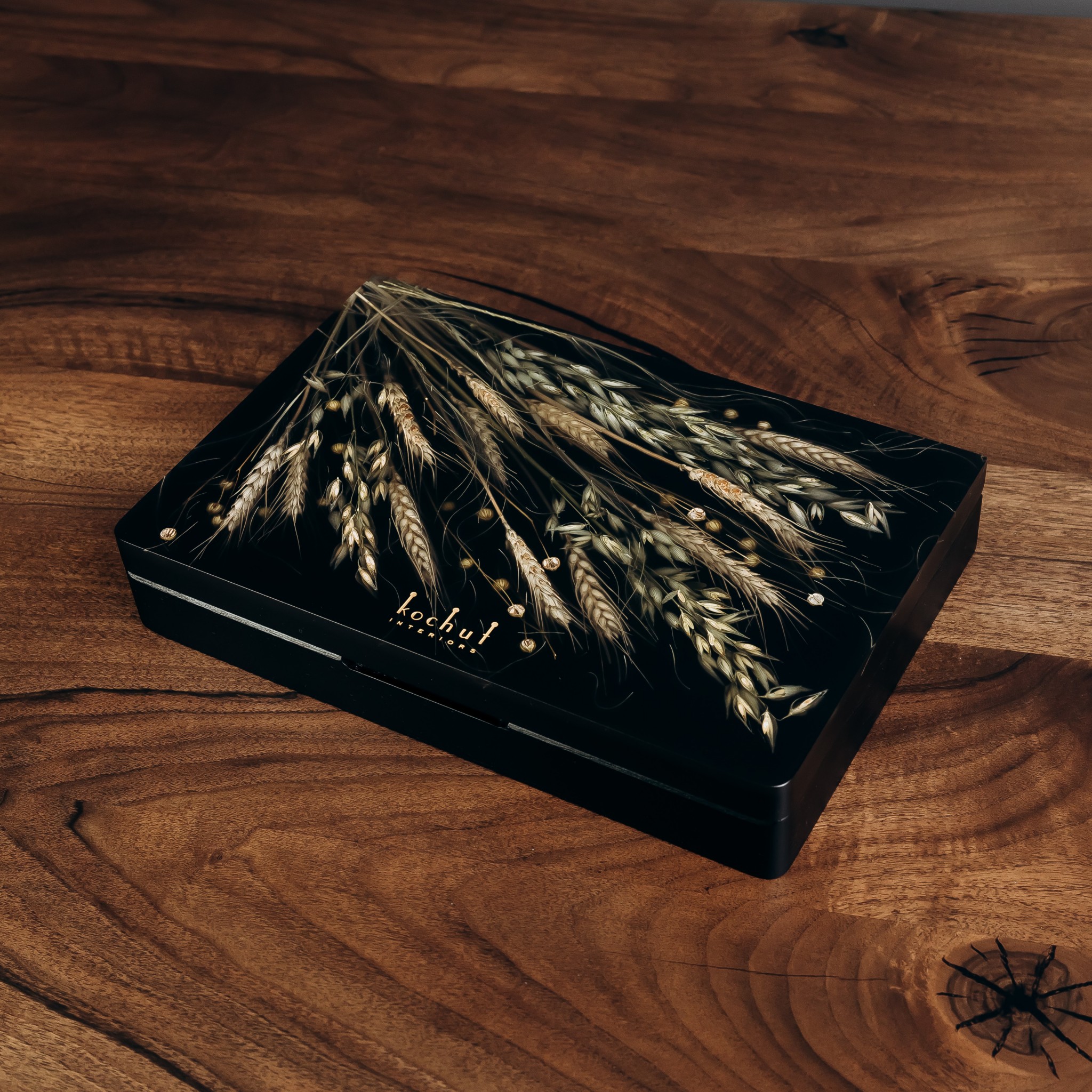 У кришці виробу збережена композиція з натуральних рослин — пшениці, вівса, льону та ковили. У традиційній українській культурі ці рослини здавна вважалися оберегами дому, що символізують достаток, силу та гармонію родини.