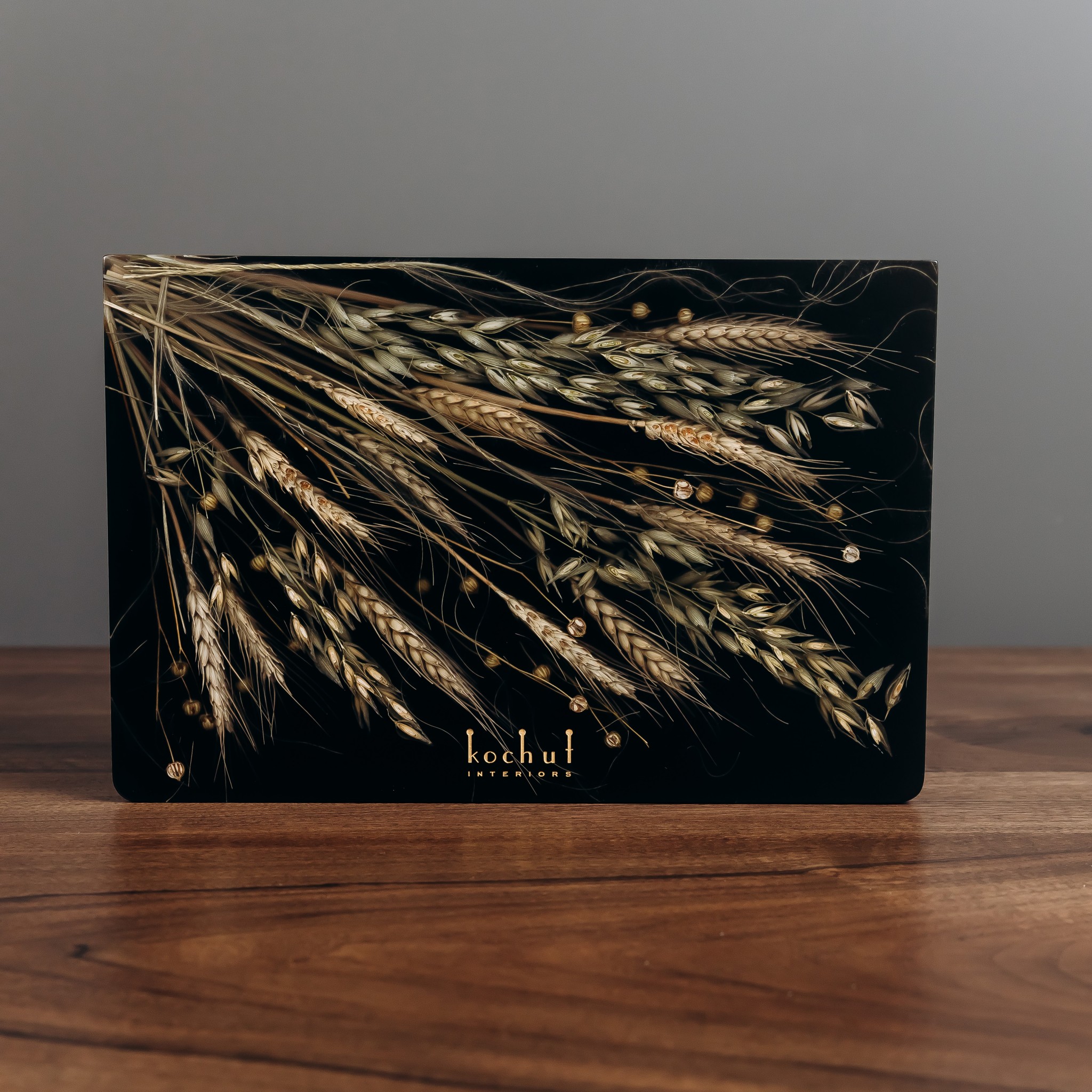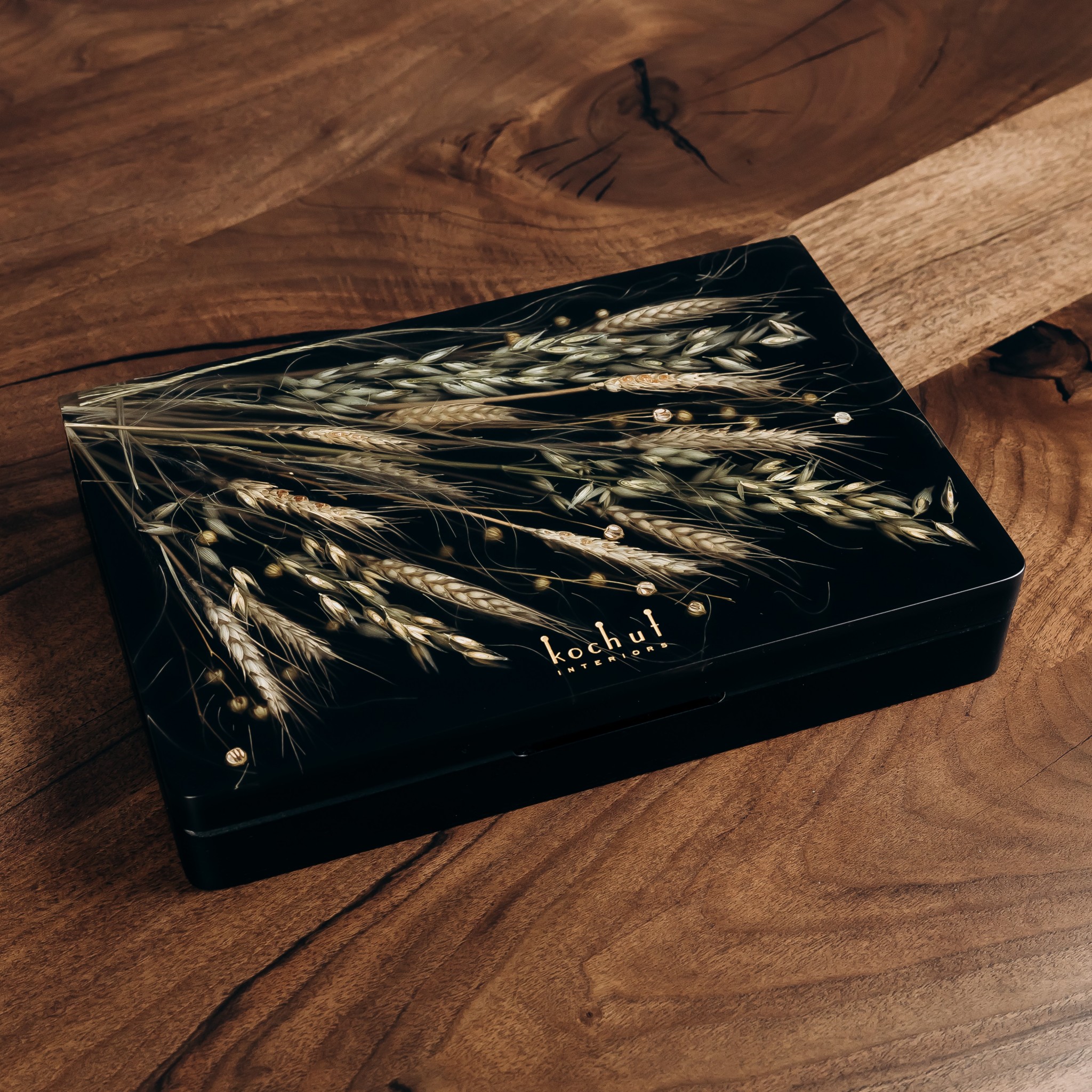 Вони занурені у дворівневу чорну напівпрозору епоксидну смолу, що створює ефект глибини та нагадує тихий вечірній серпанок над полем. Темна смола підкреслює форму колосся, ніби зберігаючи мить спокою та сили.