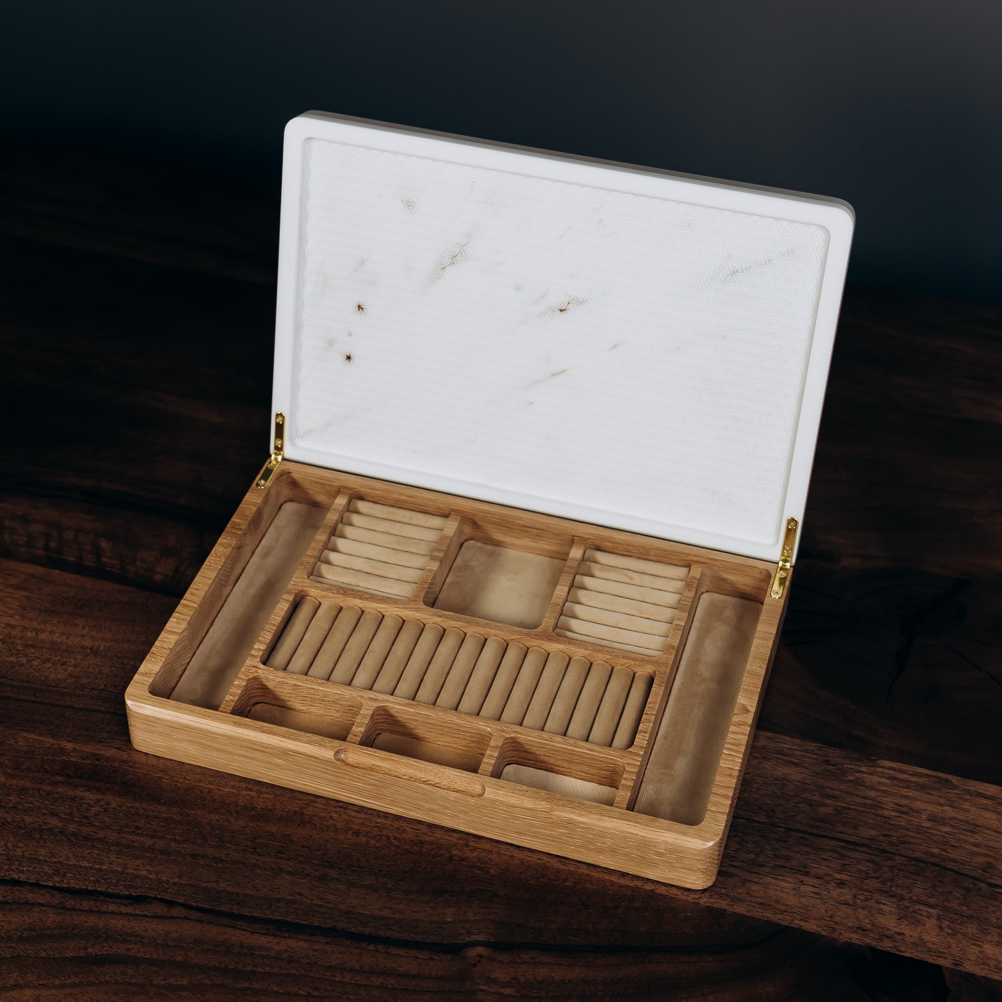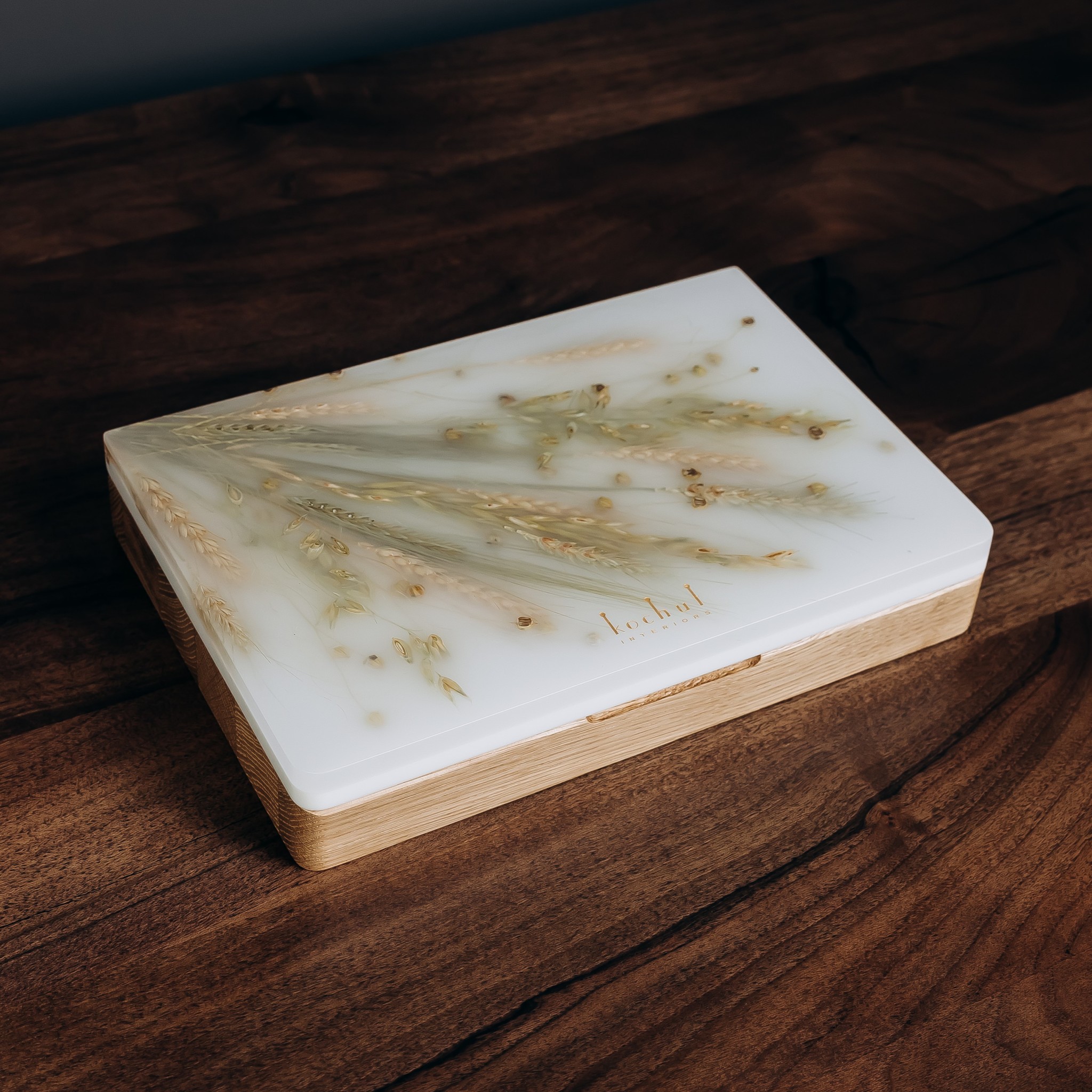 Світлий дуб у поєднанні з білою та напівпрозорою смолою створює легкий, повітряний образ — символ початку, надії та нових можливостей.