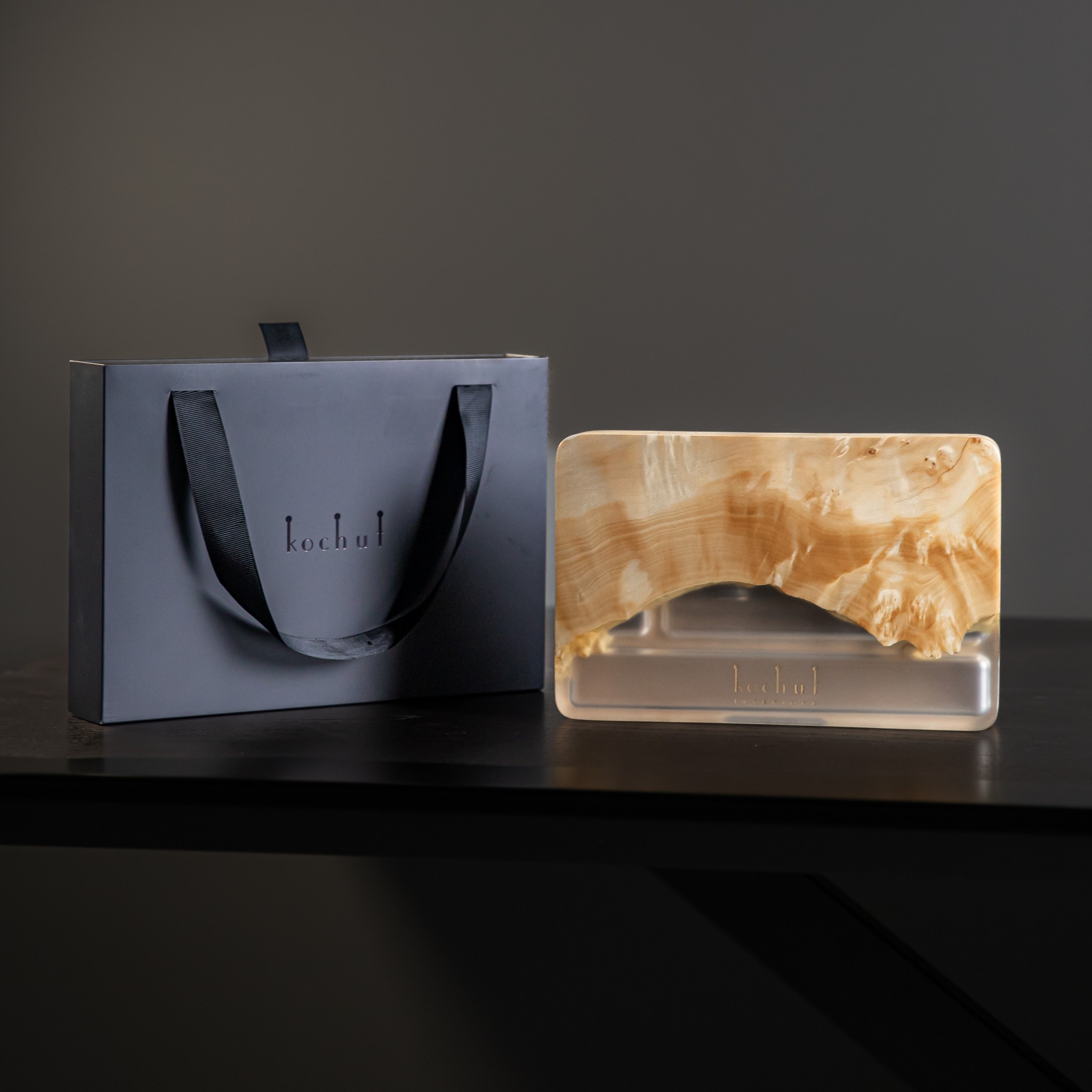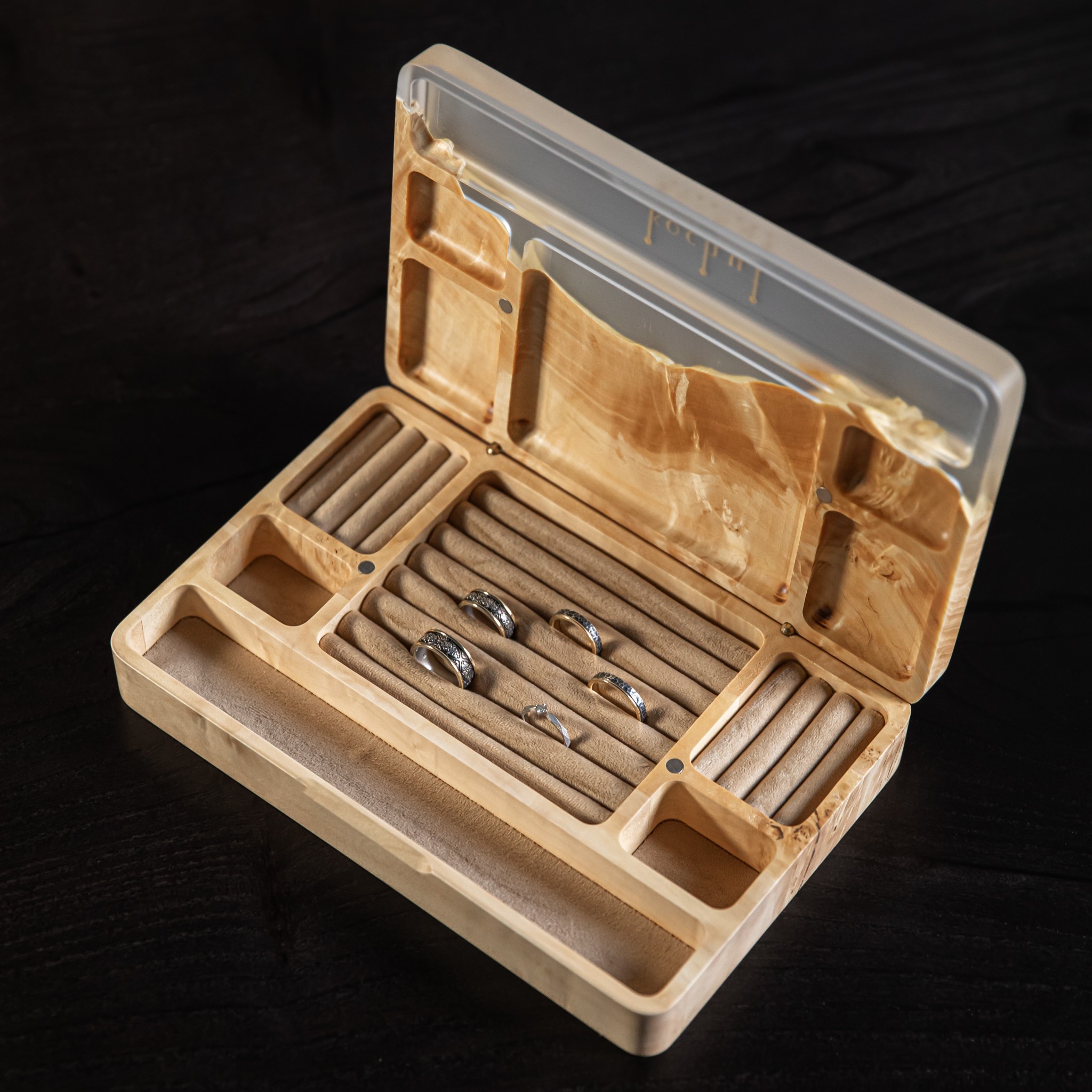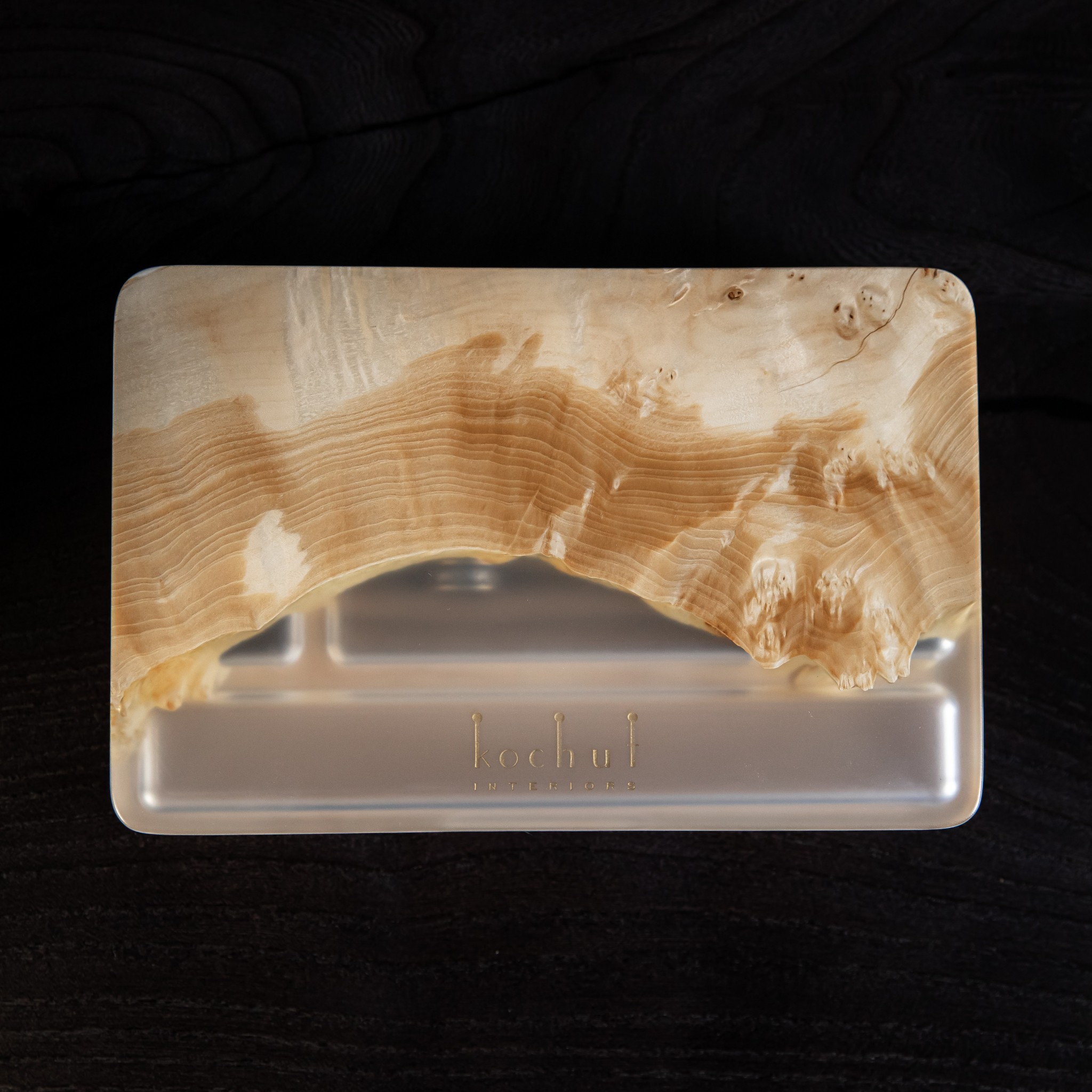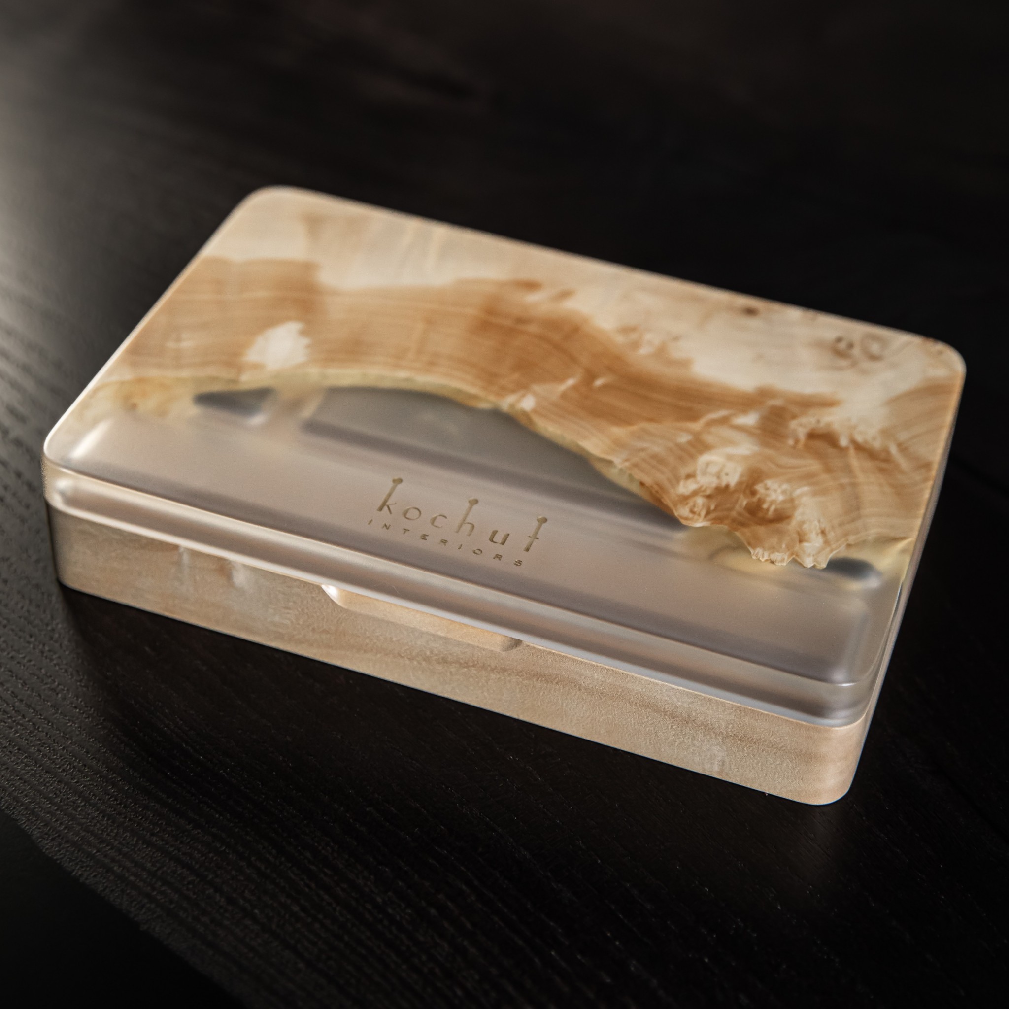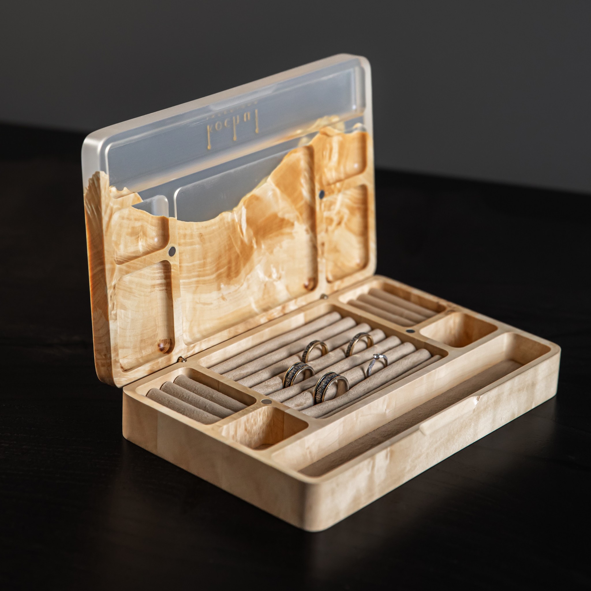 «Орнамент» — це відображення українського коду краси, закладеного в узорах природи та мистецтва. Малюнок вікових ліній дерева, теплі відтінки європейського горіха й декоративні капові вставки скельного в’яза створюють неповторну гармонію. Прозора епоксидна смола додає глибини, а перламутрові переливи м’яко грають на світлі, роблячи кожну скриньку унікальною. Вона гармонійно впишеться у будь-який інтер’єр — від спальні до вітальні.