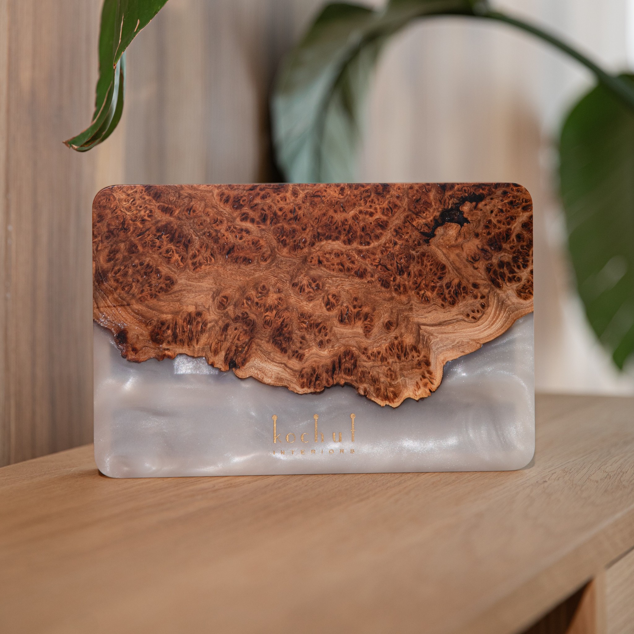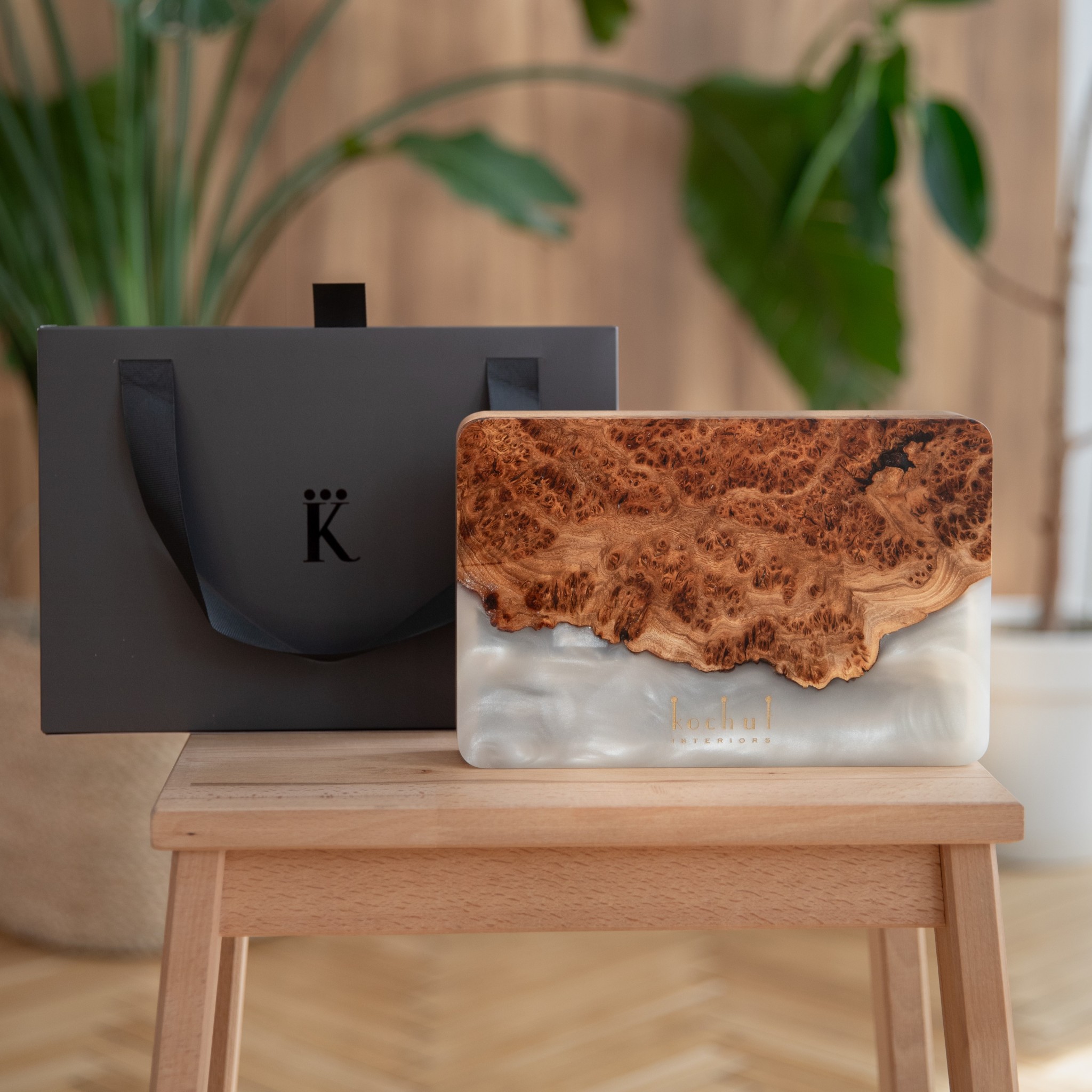 Скриньки для прикрас «Орнамент» мають власний унікальний код краси, який ховається у кожній віковій лінії дерева, у кожному його текстурному зерні, у кожному відтінку. Природність і самобутність кожної скриньки передає європейський горіх, який ми обрали для створення корпусу, та капові фрагменти скельного в’яза, що прикрашають фасад своєю декоративністю. Естетичної ідеальності виробу додає епоксидна смола, забарвлена різними кольоровими відтінками. А ті, де є перламутрові вкраплення, притягують до себе погляд знову і знову ніжними переливами, що виблискують на сонці. Така ексклюзивна дерев’яна скринька для прикрас прикрасить ваш інтер’єр та чудово виглядатиме на комоді, журнальному чи туалетному столику, приліжковій тумбі, на консолі біля дзеркала в коридорі.