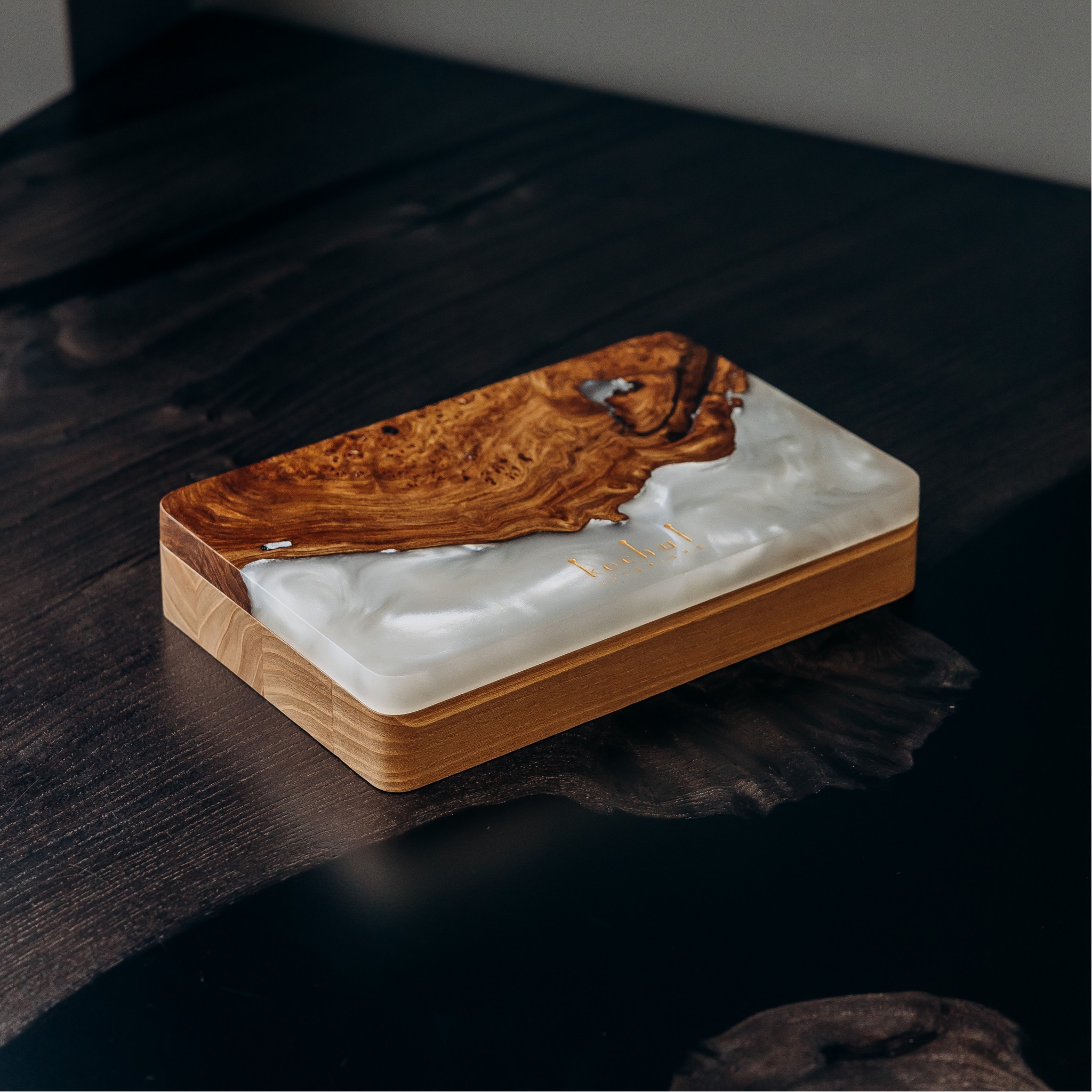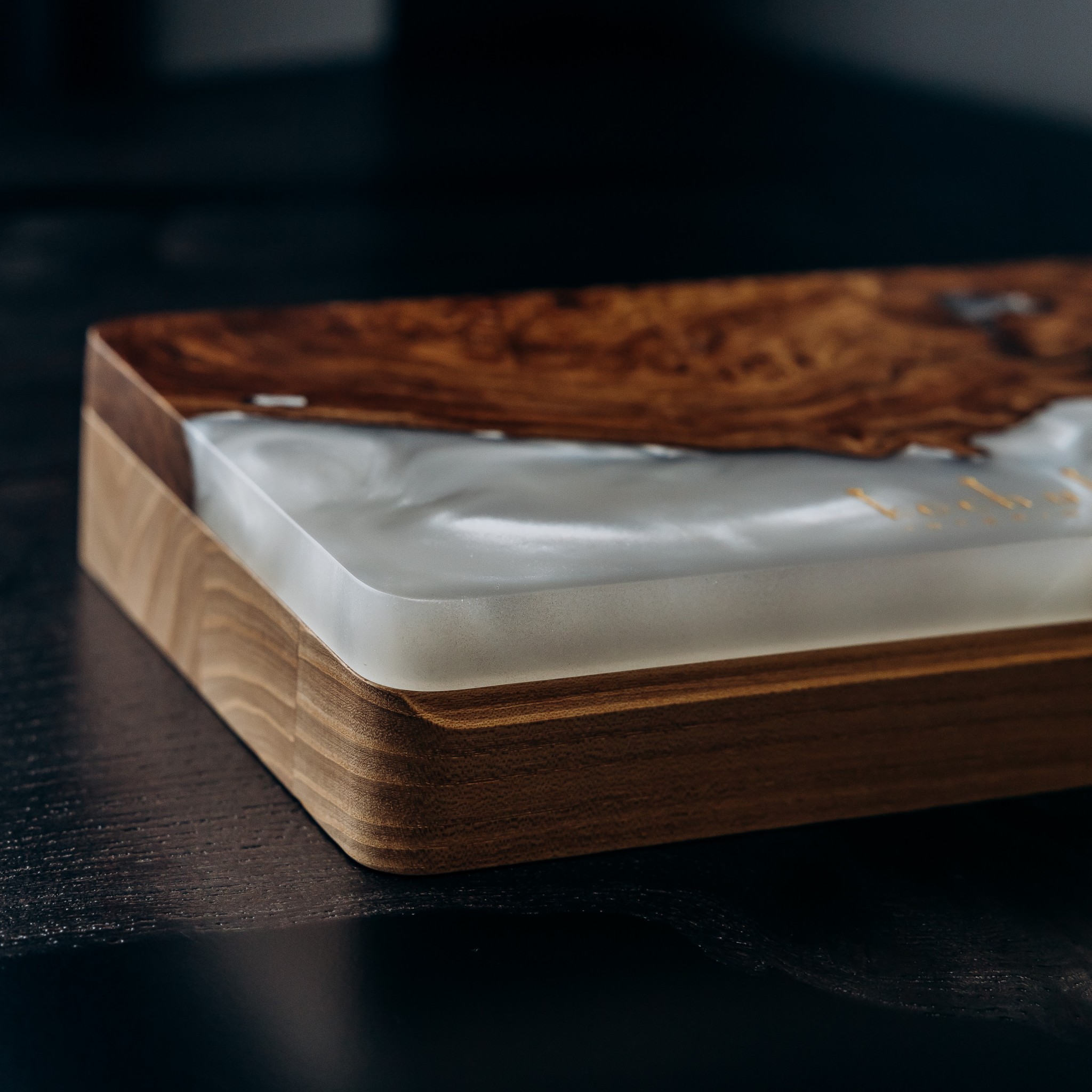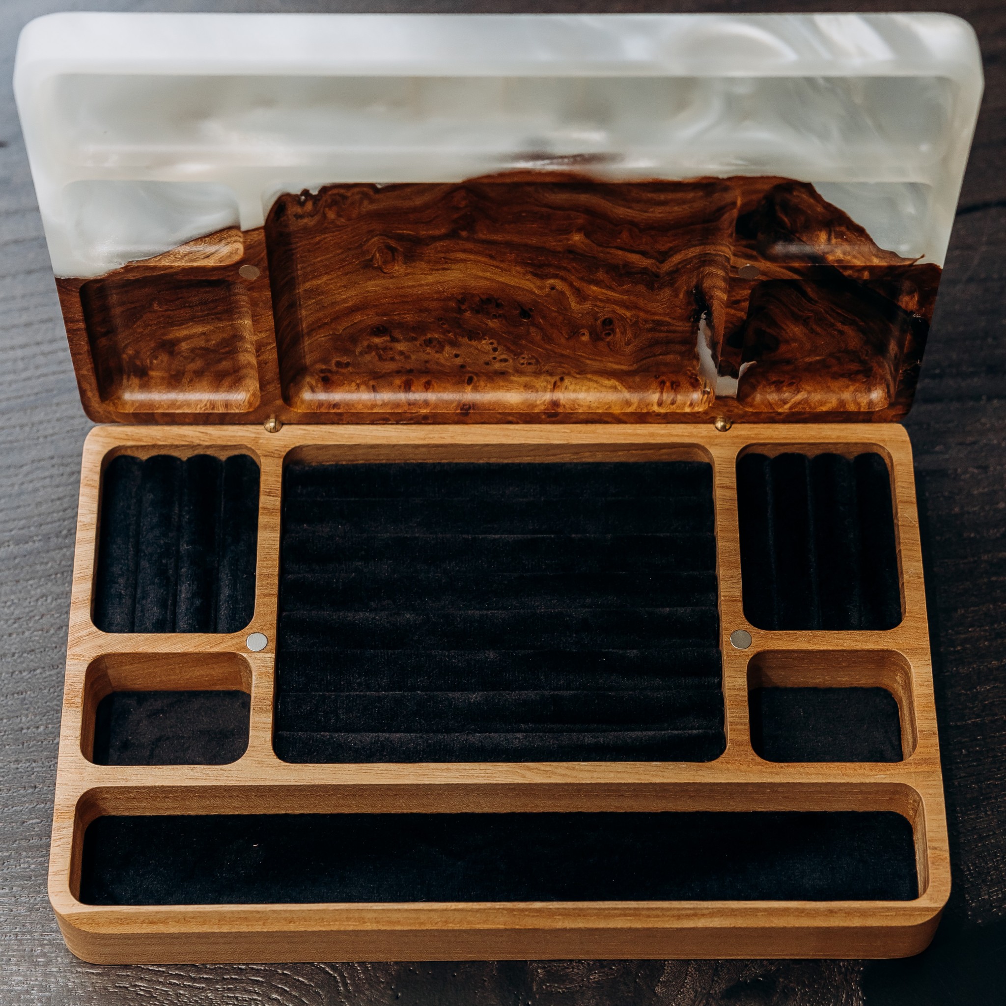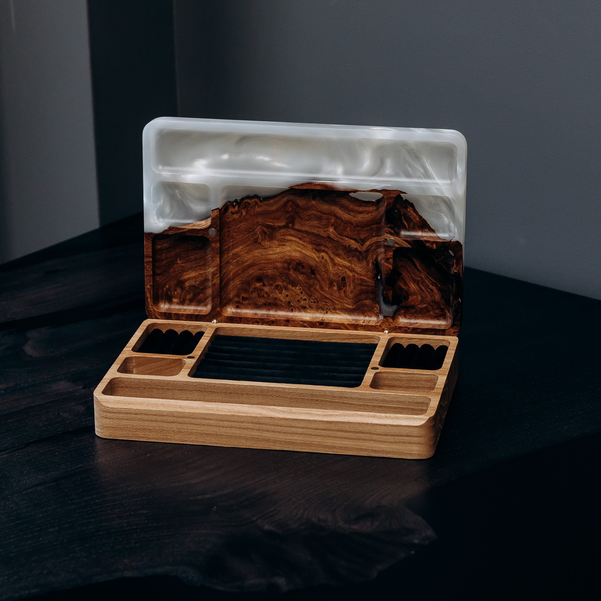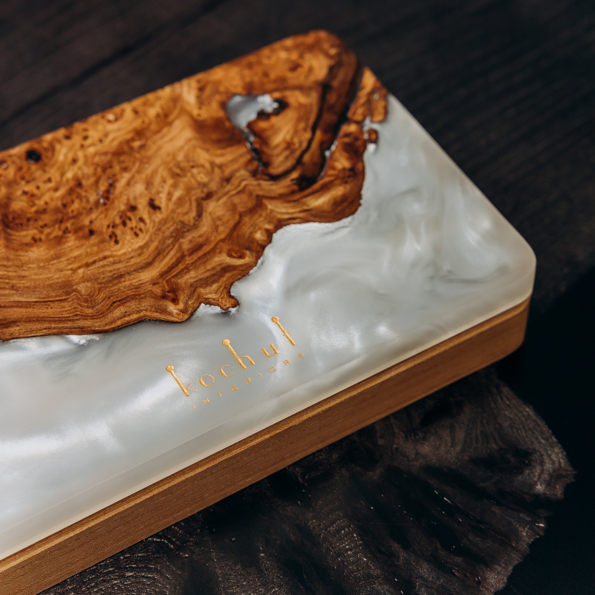«Орнамент» — це відображення українського коду краси, закладеного в узорах природи та мистецтва. Малюнок вікових ліній дерева, теплі відтінки європейського горіха й декоративні капові вставки скельного в’яза створюють неповторну гармонію. Прозора епоксидна смола додає глибини, а перламутрові переливи м’яко грають на світлі, роблячи кожну скриньку унікальною. Вона гармонійно впишеться у будь-який інтер’єр — від спальні до вітальні.