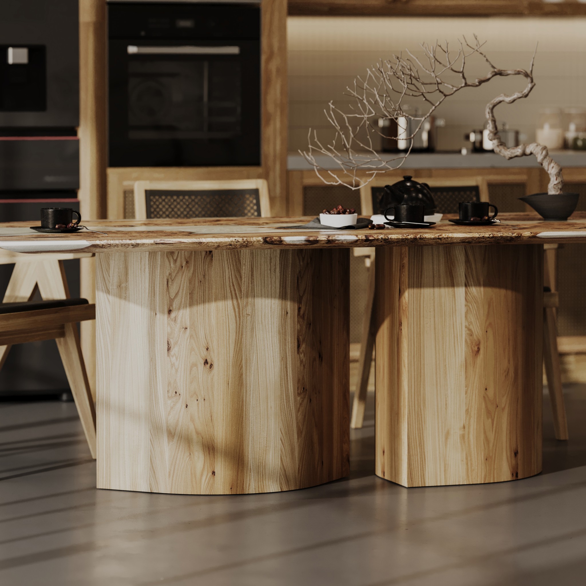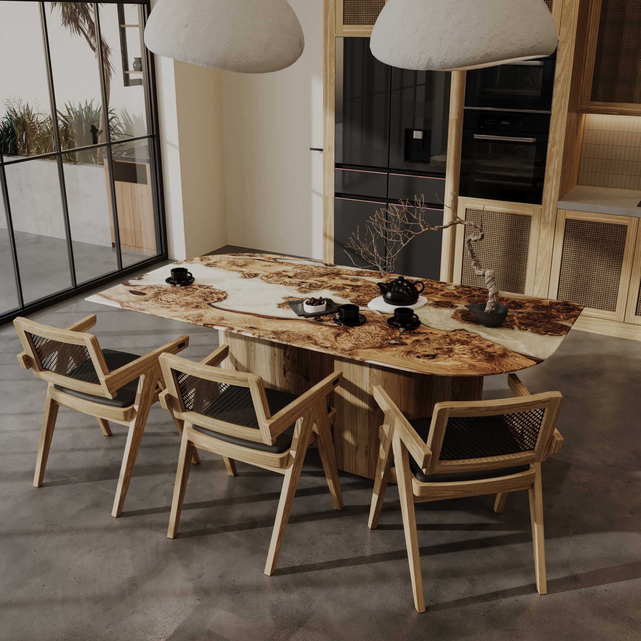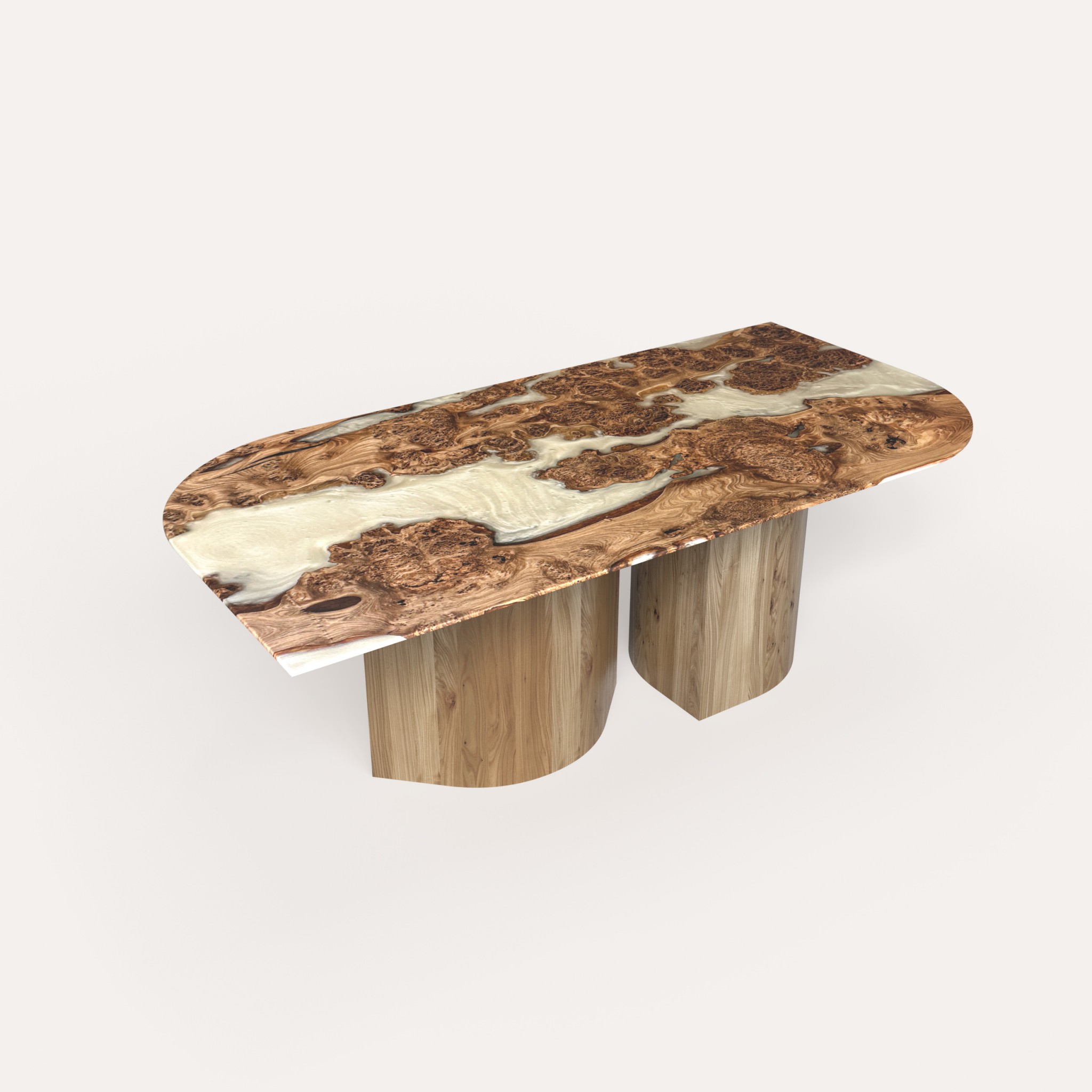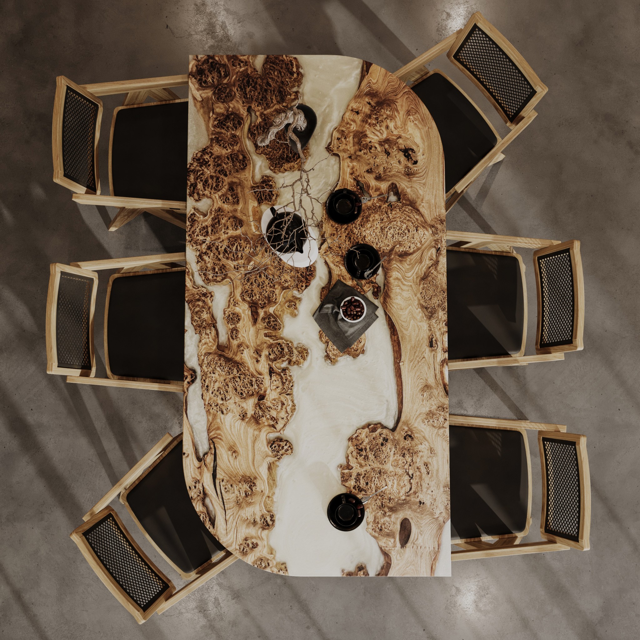 «Альбіон» як символ островів, де хвилі океану ледь пробиваються крізь прадавні скелясті береги. Ми поєднали світлі фактурні зрізи скельного в’яза з білою перламутровою смолою, що робить стільницю не лише декоративною, а й унікальною, бо кожен малюнок деревини – неповторний. Масивна форма столу водночас гармонійна й легка, тому він природно стане центром Вашого інтер’єру.