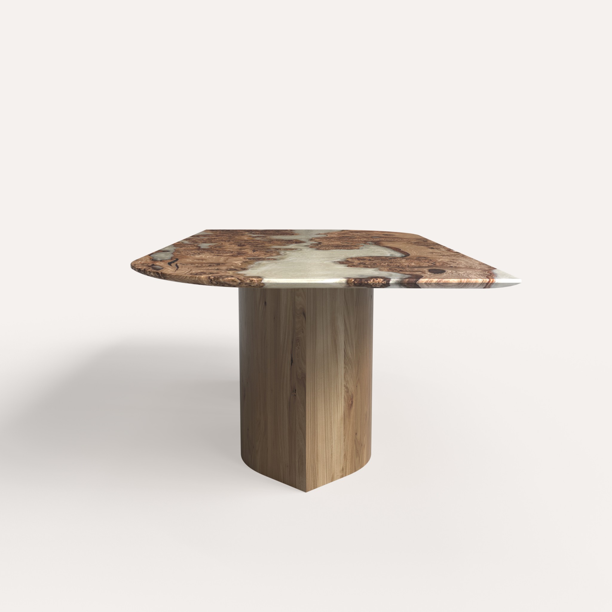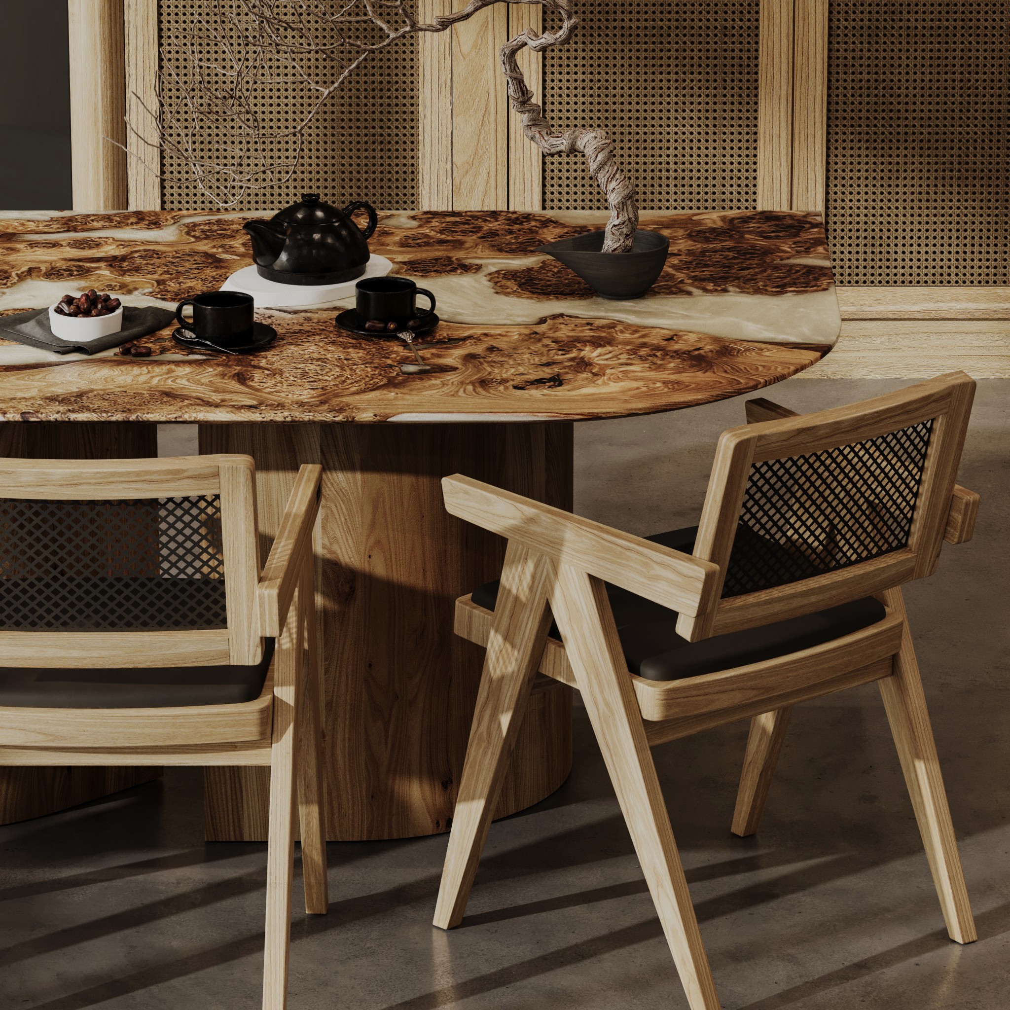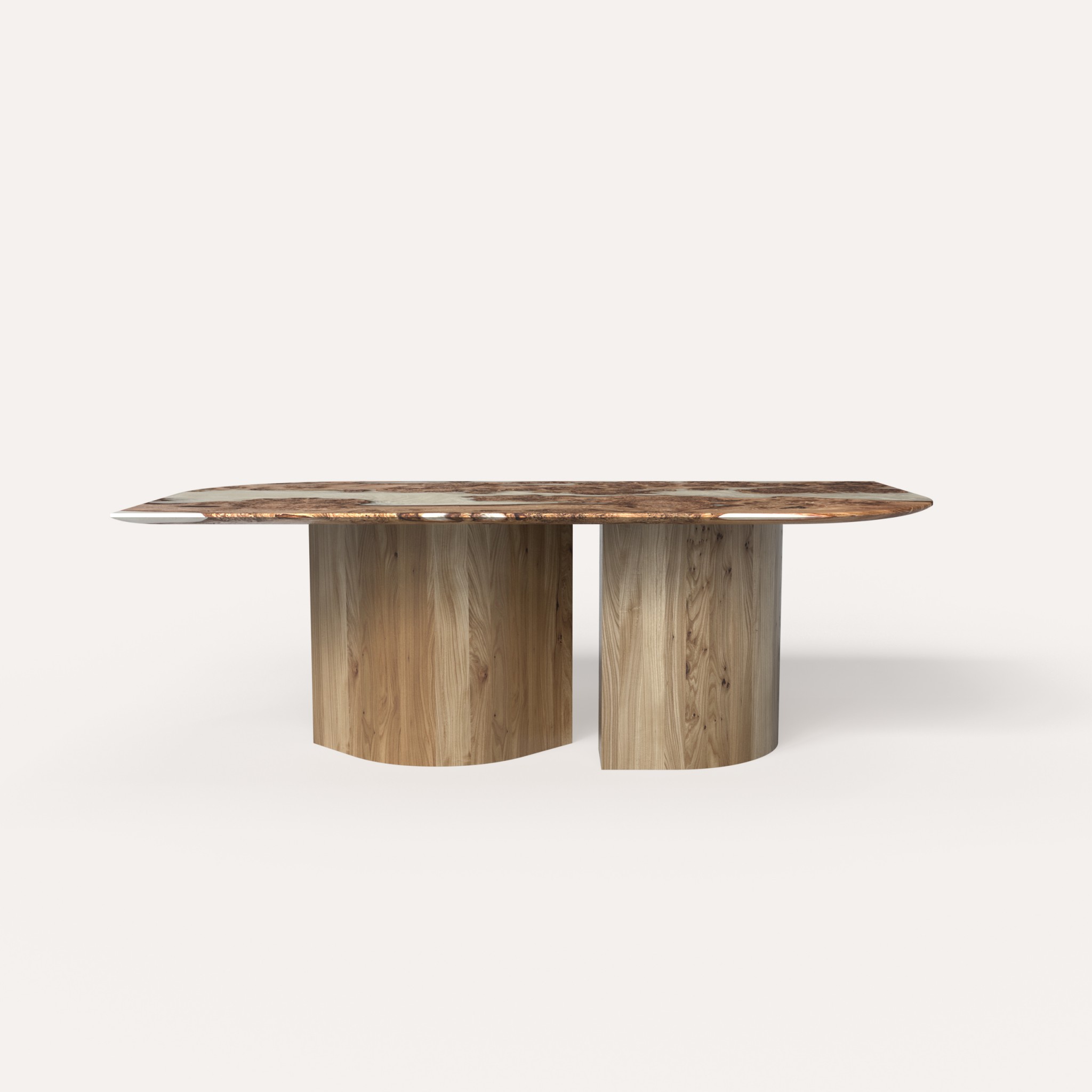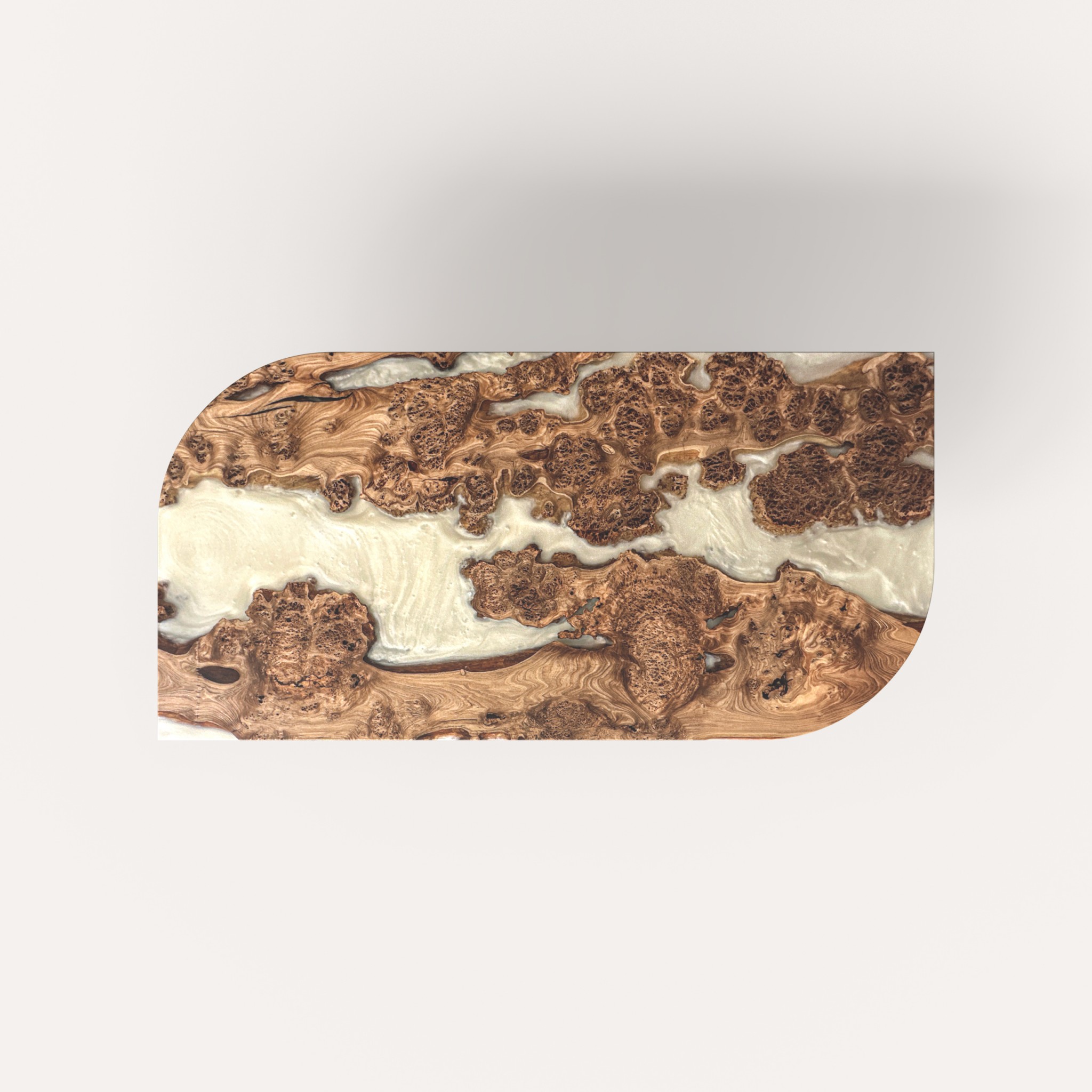 «Альбіон» як символ островів, де хвилі океану ледь пробиваються крізь прадавні скелясті береги. Ми поєднали світлі фактурні зрізи скельного в’яза з білою перламутровою смолою, що робить стільницю не лише декоративною, а й унікальною, бо кожен малюнок деревини – неповторний. Масивна форма столу водночас гармонійна й легка, тому він природно стане центром Вашого інтер’єру.