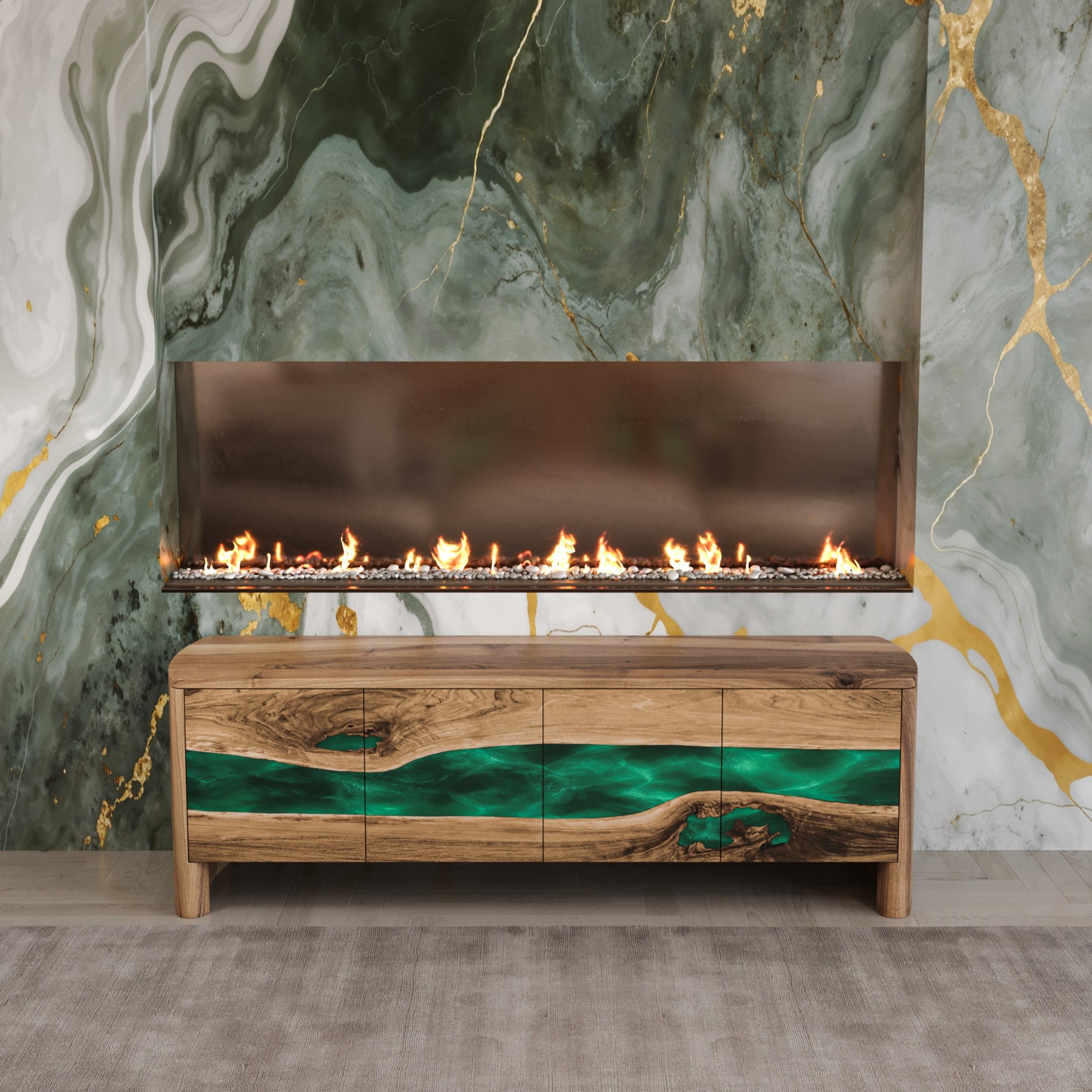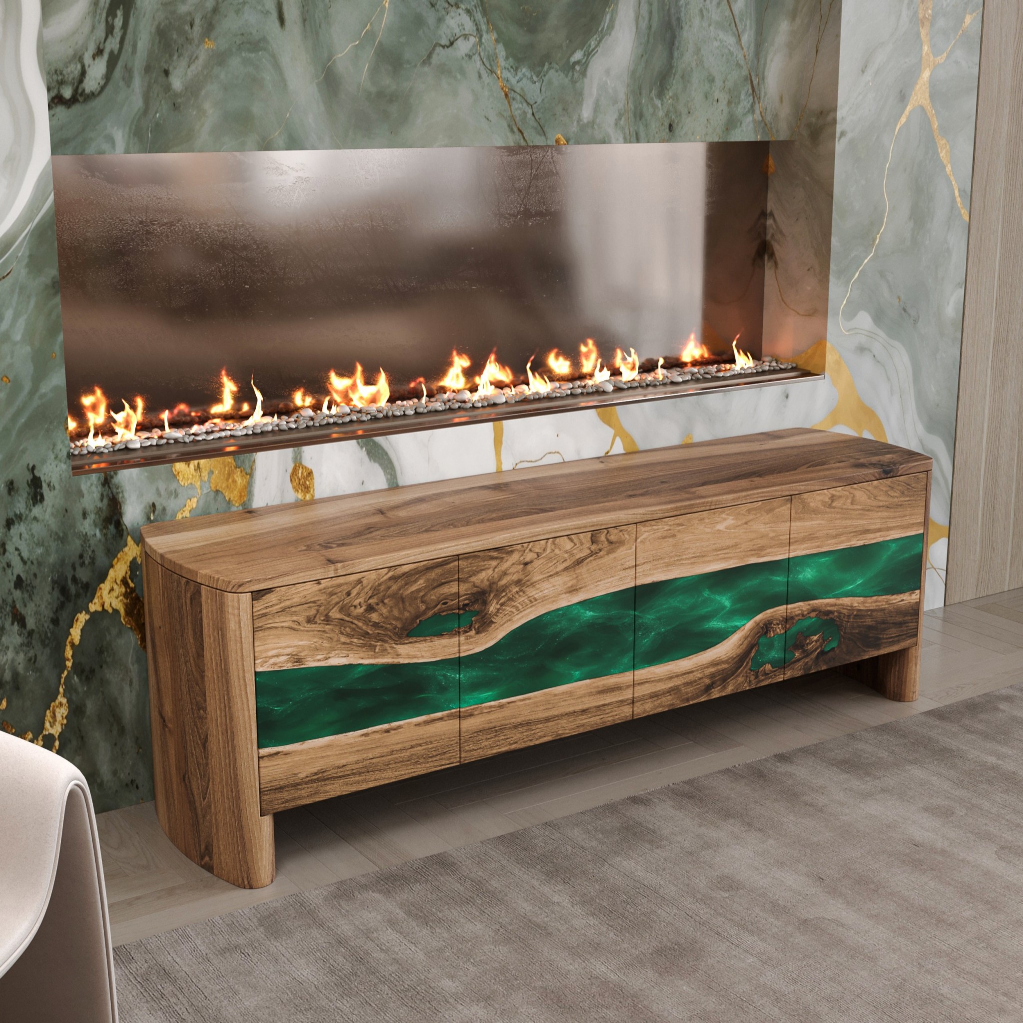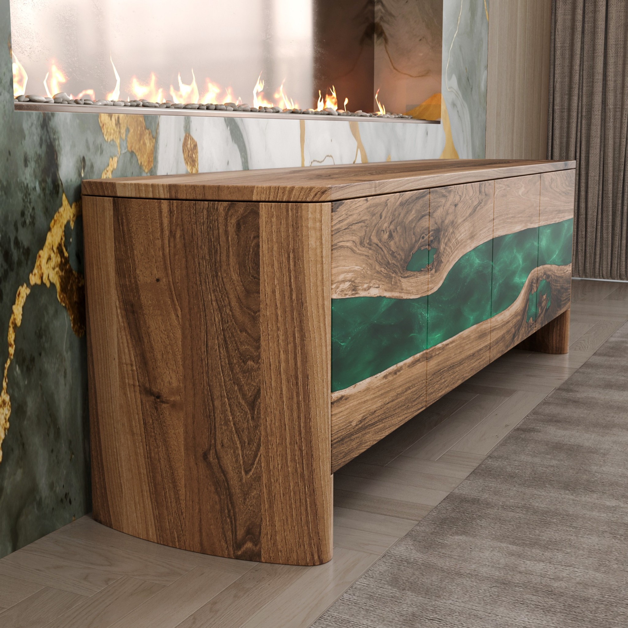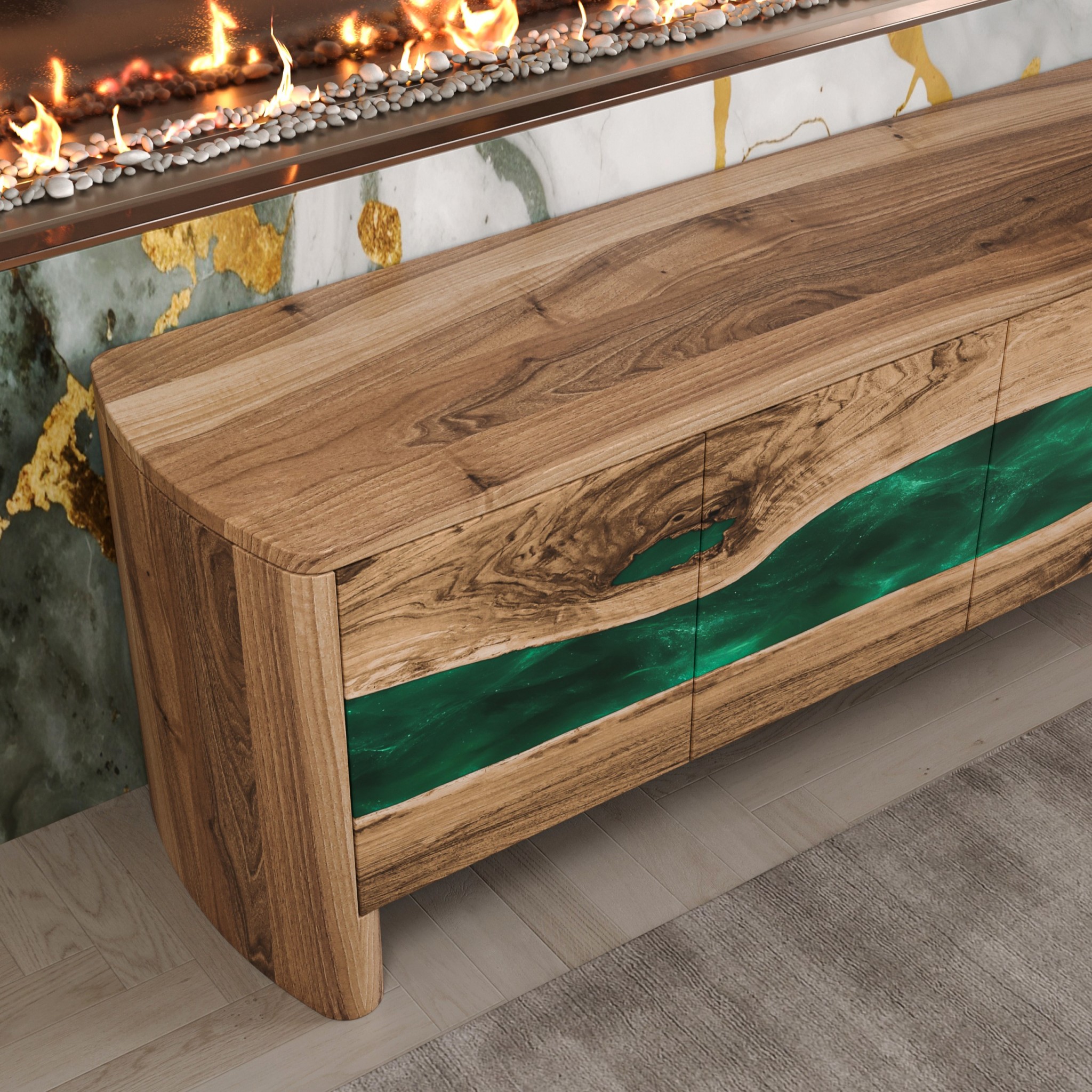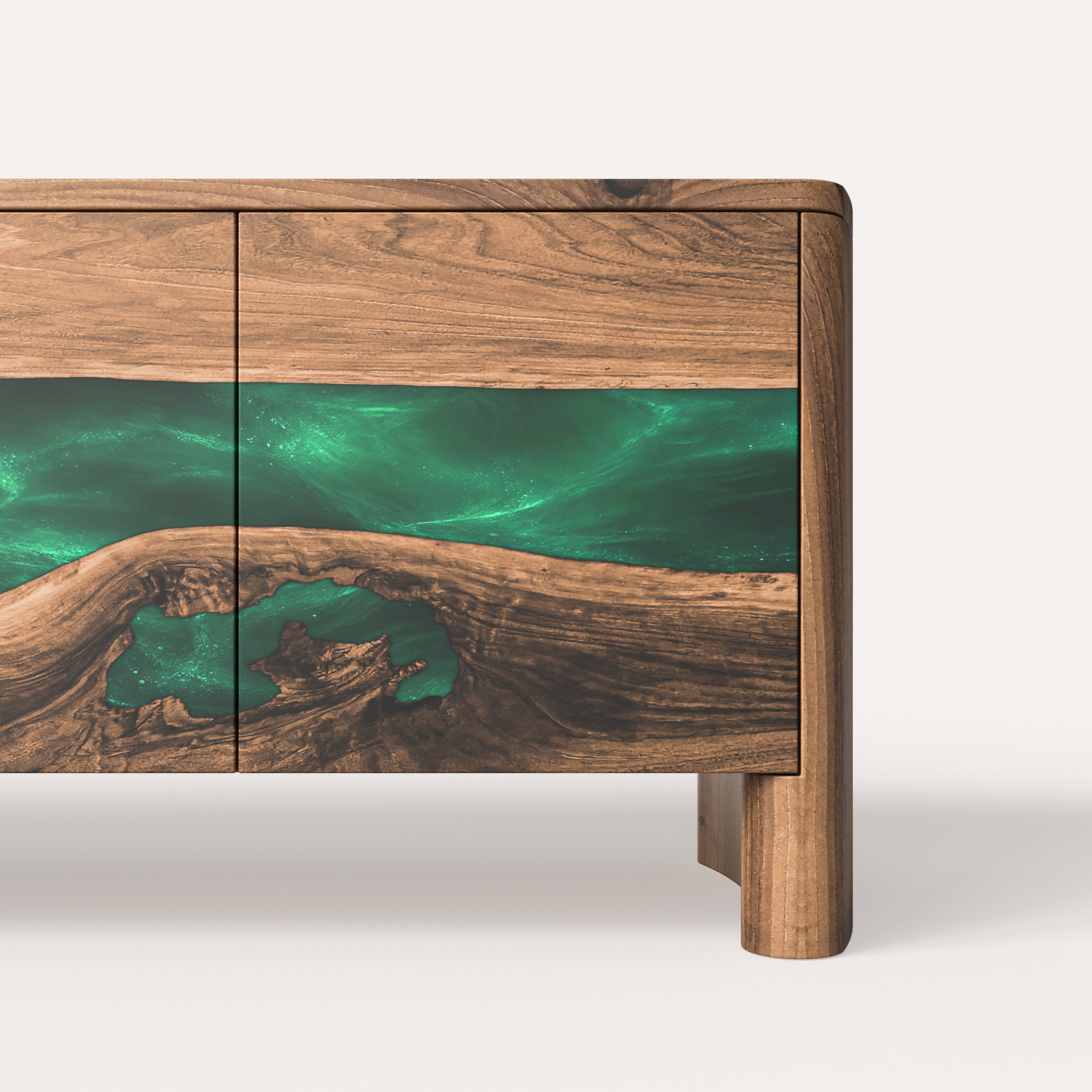 Фасад тумби формує плавна органічна лінія, у якій масив європейського горіха ніби розкриває природний розріз деревини, всередині якого тече смарагдова епоксидна смола.