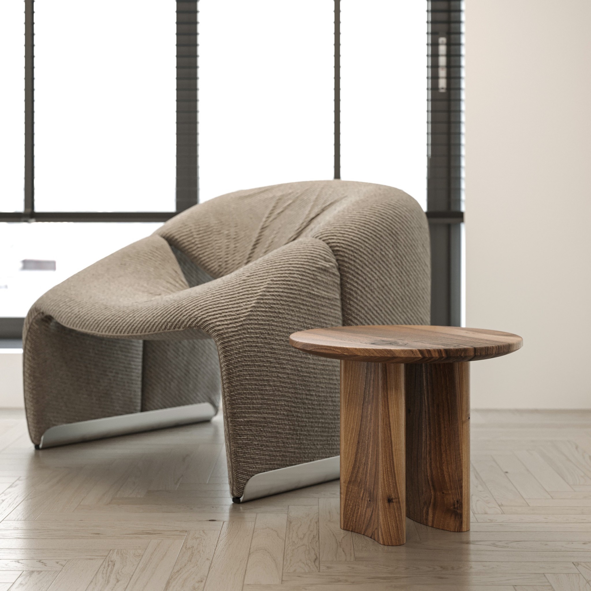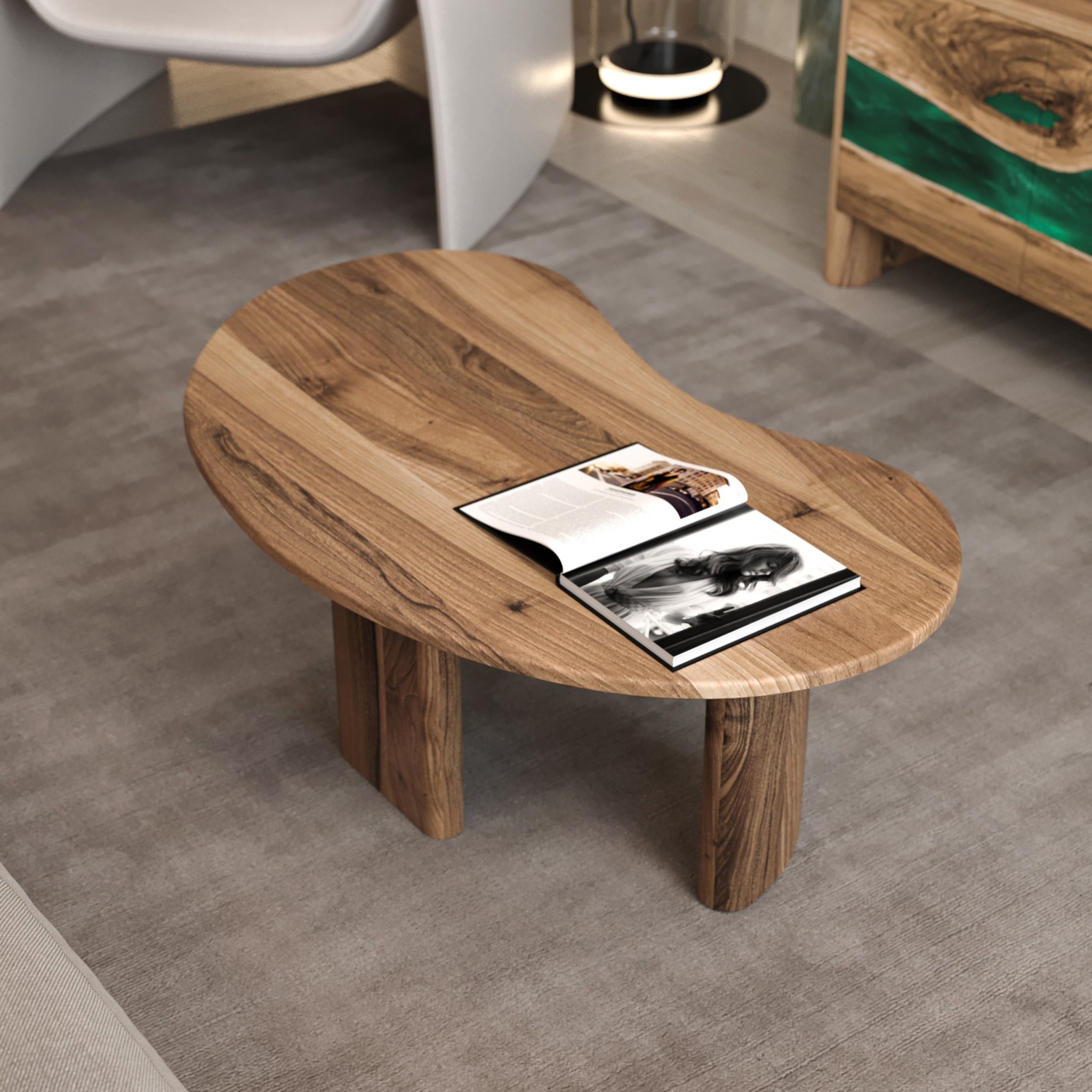 Плавні заокруглені краї, м’які переходи та збалансовані пропорції створюють відчуття легкості й гармонії. Масивні ніжки повторюють природну пластичність силуету, забезпечуючи стабільність конструкції та підкреслюючи монолітність виробу.