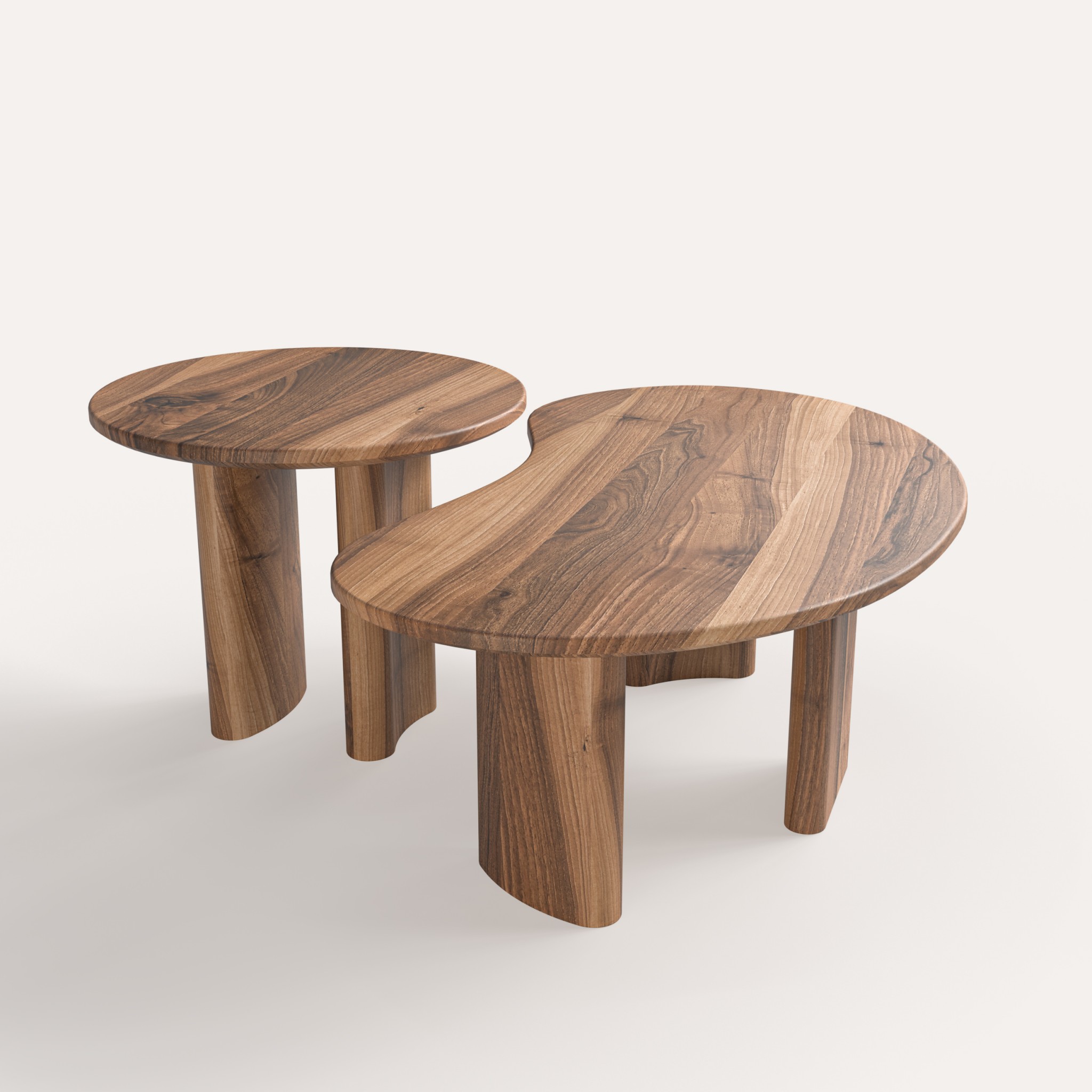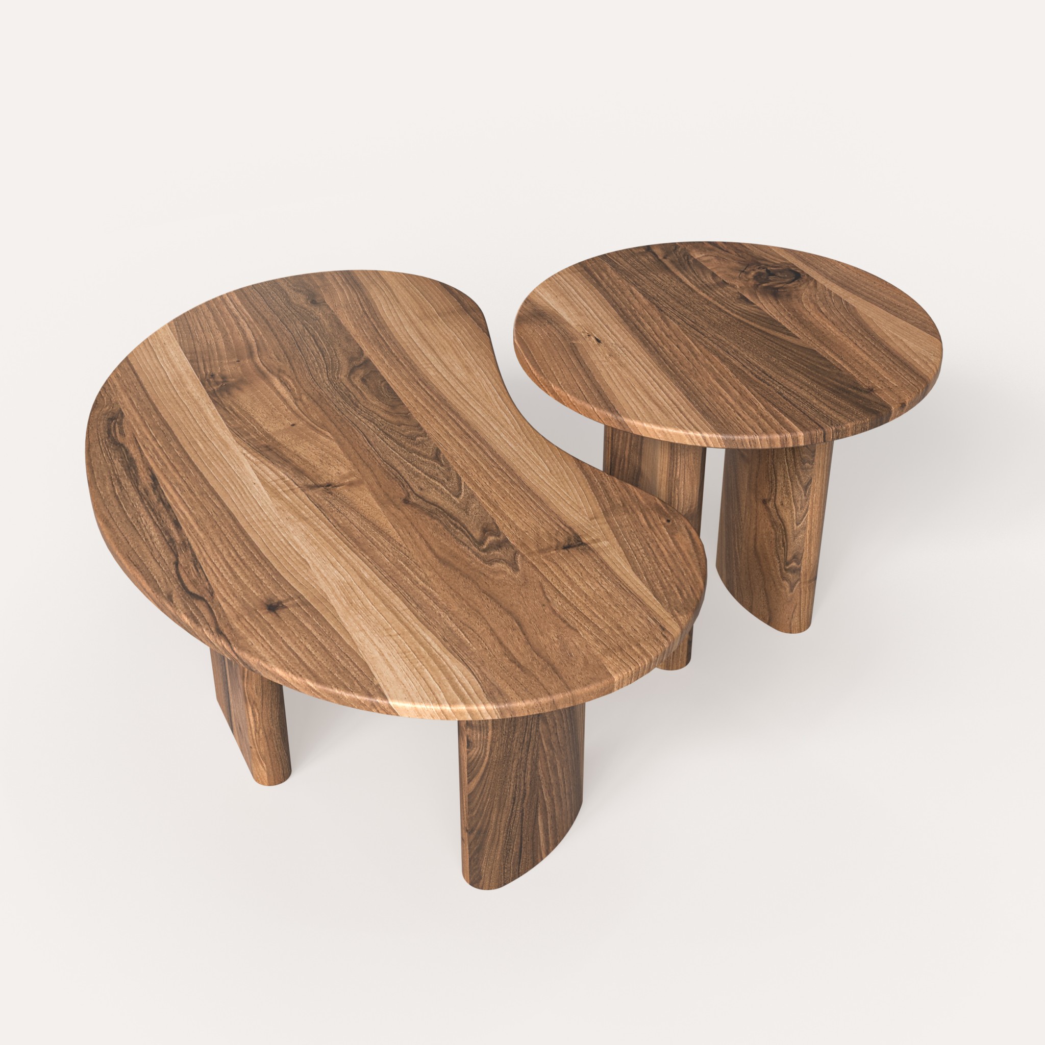 Комплект складається з двох столиків різної форми та розміру, які можуть використовуватися разом або окремо. У поєднанні вони формують цілісну композицію, що додає інтер’єру динаміки та сучасного характеру.